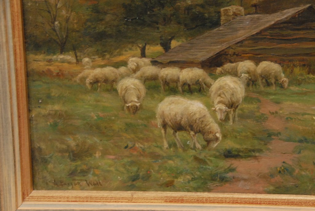 Alfred Bryan Wall 1861-1935 GRAZING SHEEP AND BARN oil on board signed lower left A. Bryan Wall 11 x 14 1/2