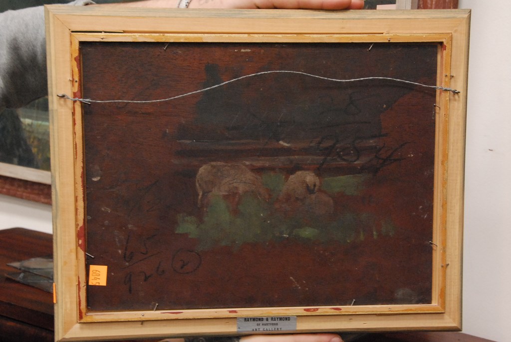 Lot 55: Alfred Bryan Wall 1861-1935 GRAZING SHEEP AND BARN oil on board signed lower left A. Bryan Wall 11 x 14 1/2