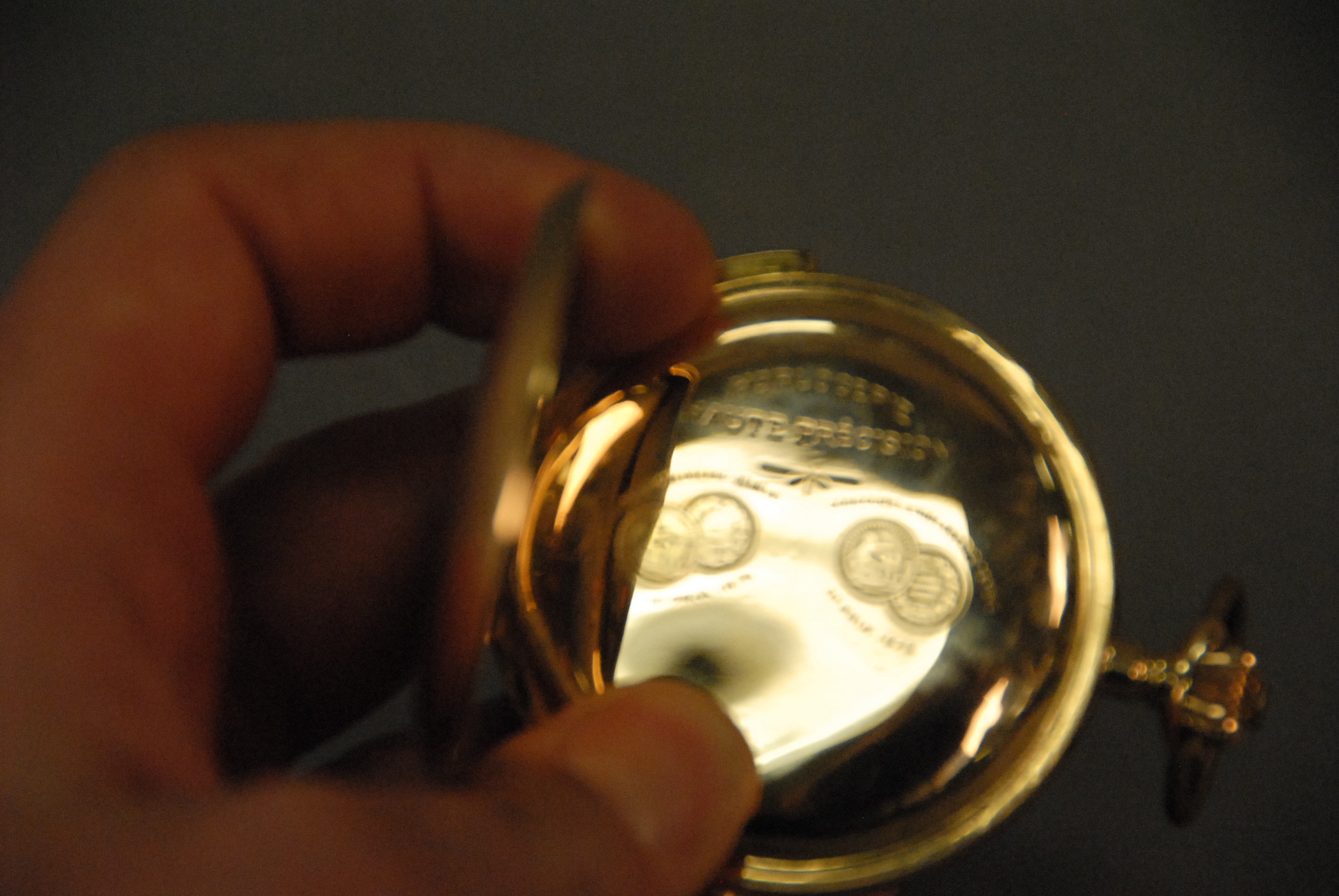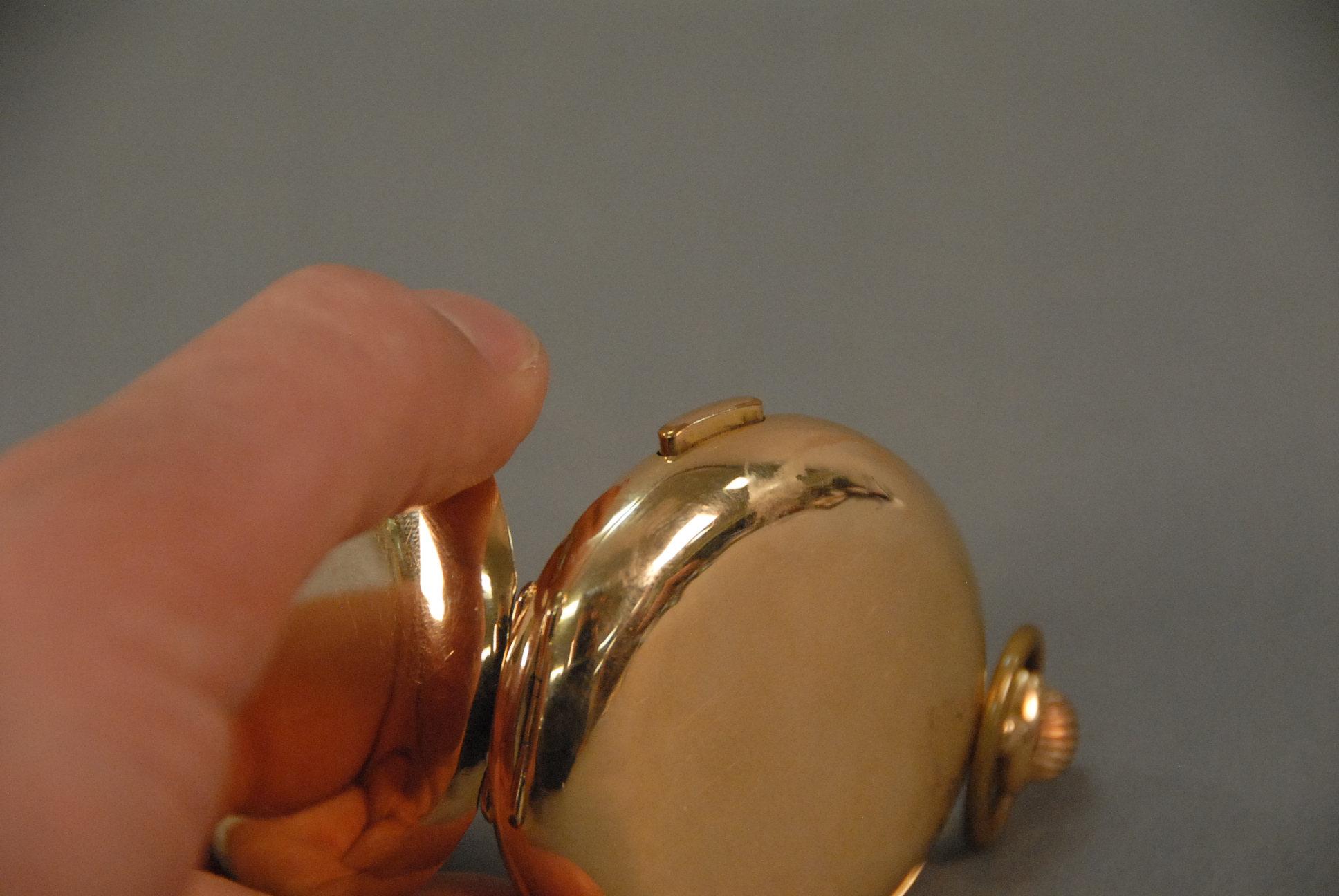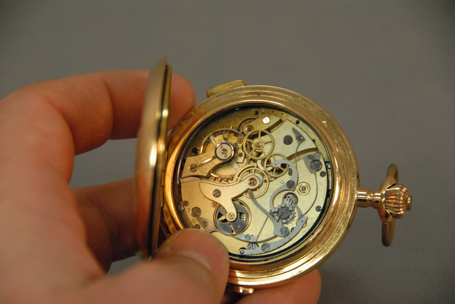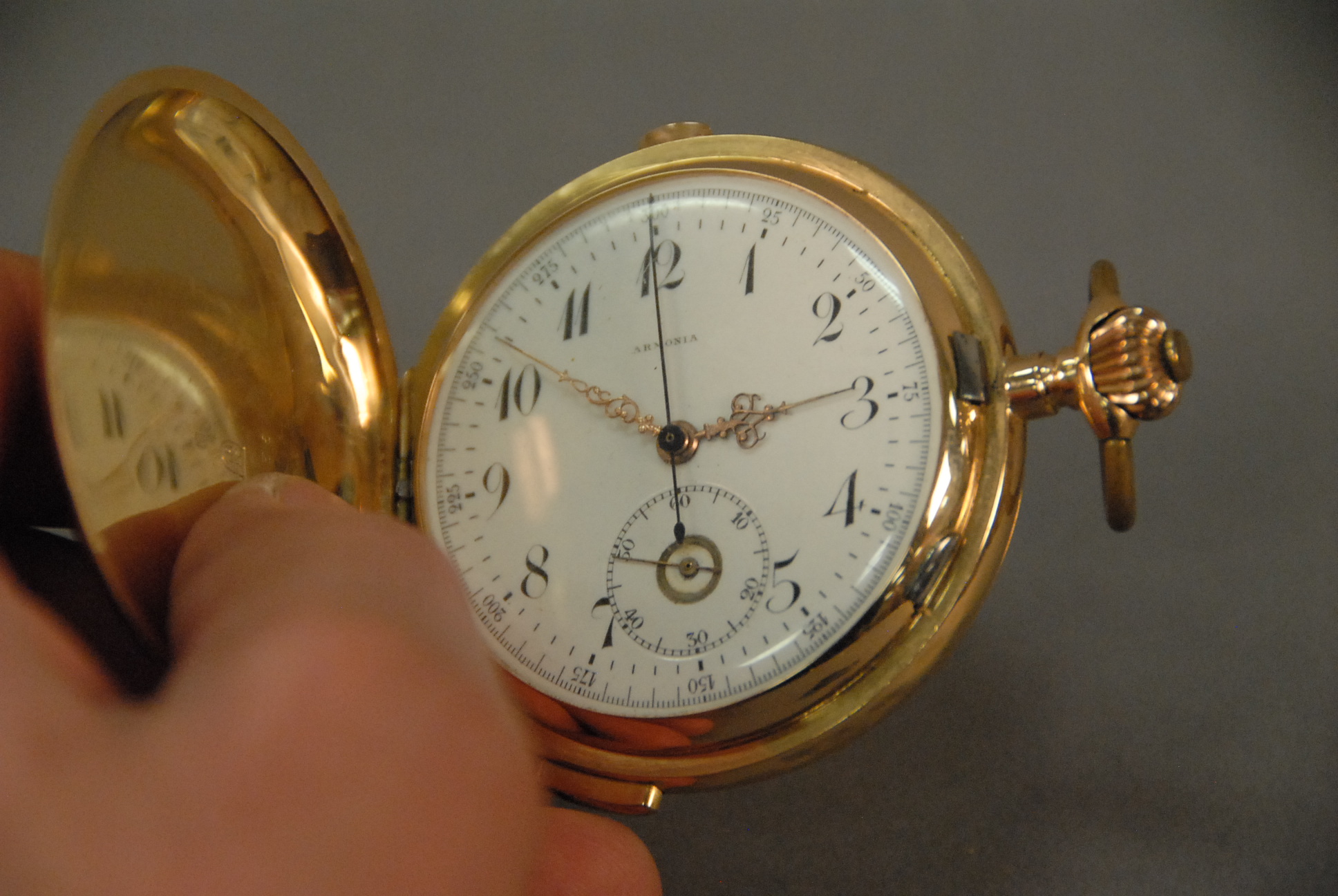 Lot 55: Armoni 18K gold closed face pocket watch with chronometer, second hand, and repeater top ring replaced. 116 grams total weight
