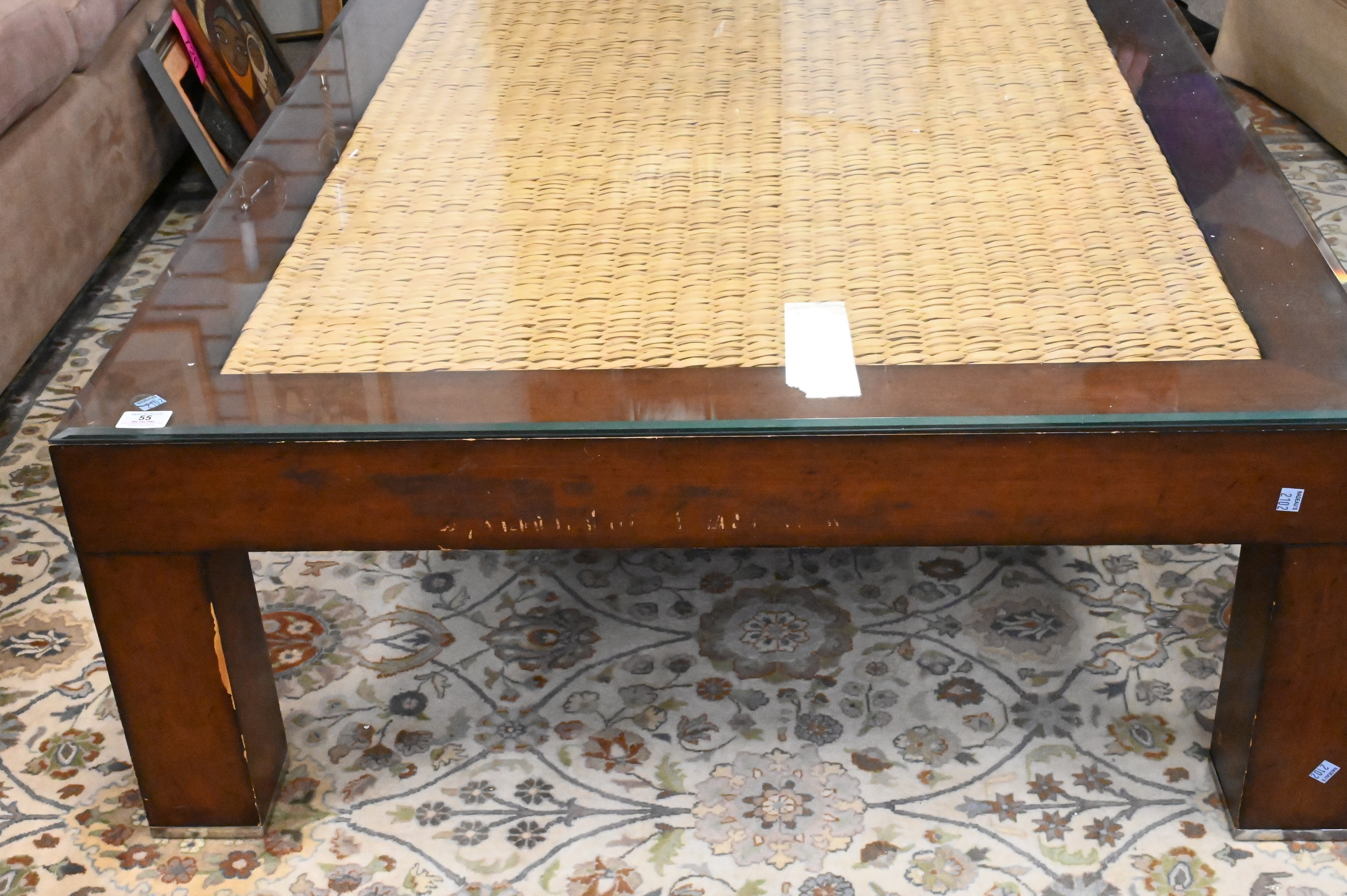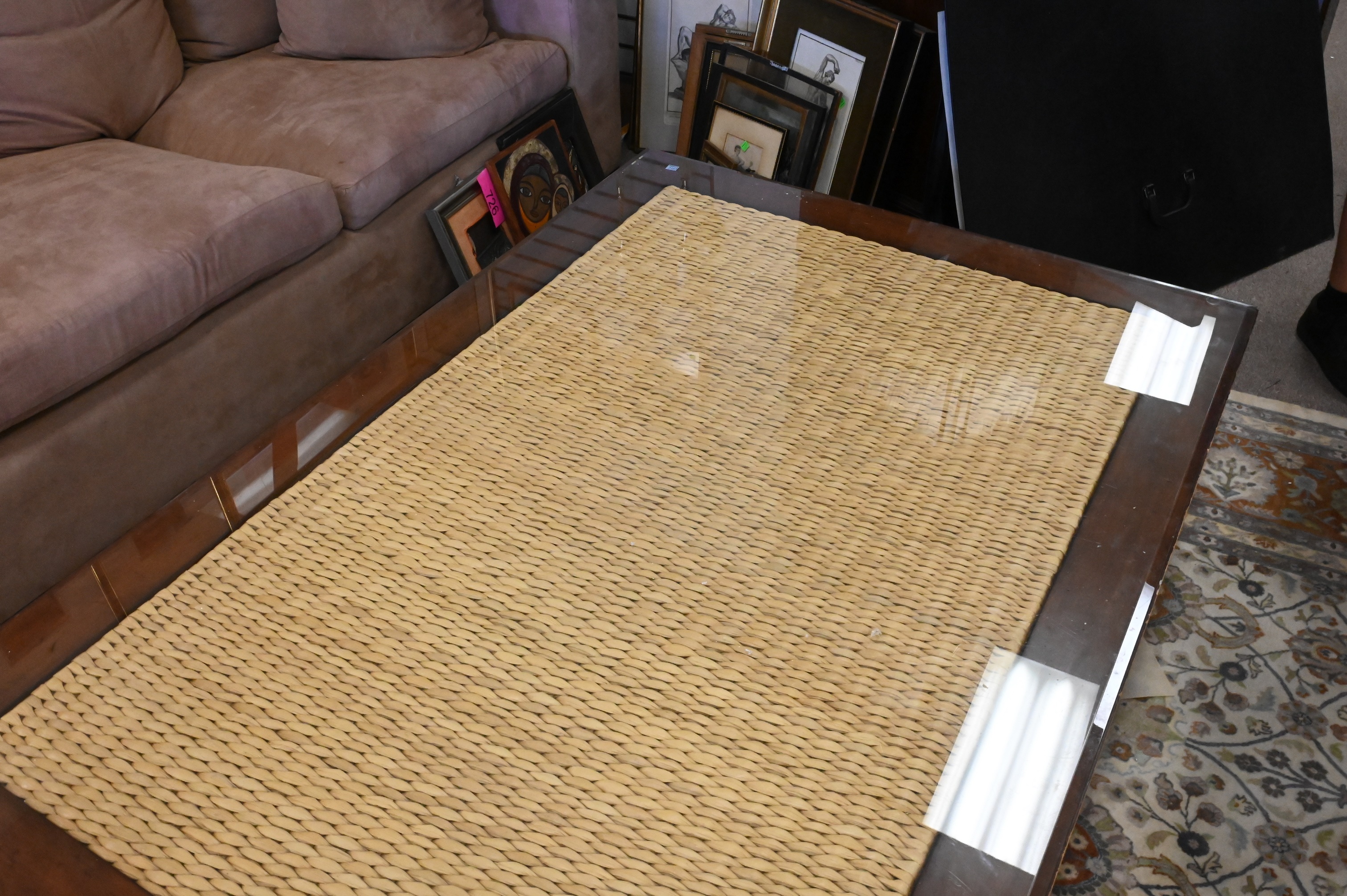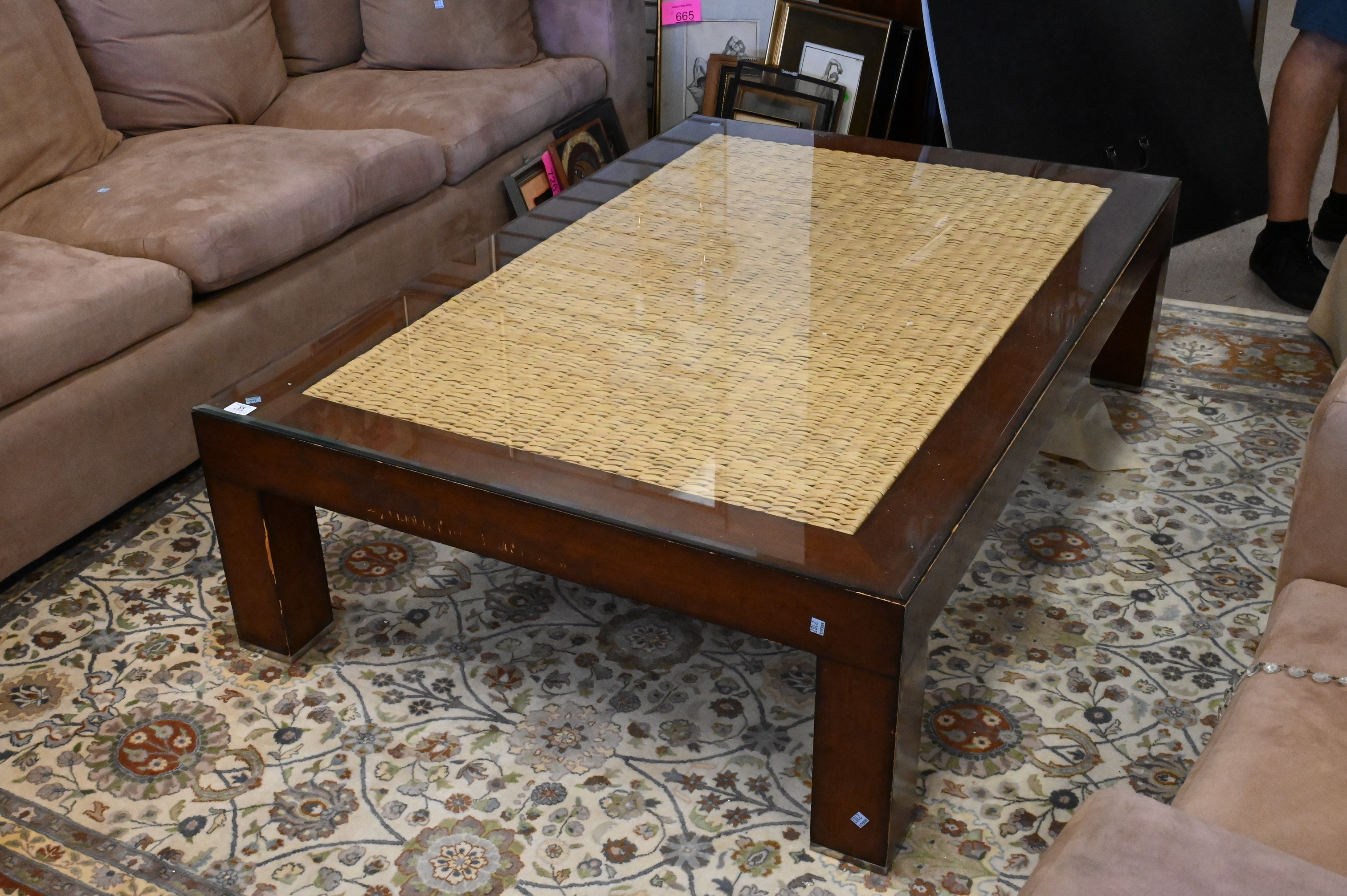 Contemporary Coffee Table, with glass top over woven center, height 16 inches, top 41″ x 60″