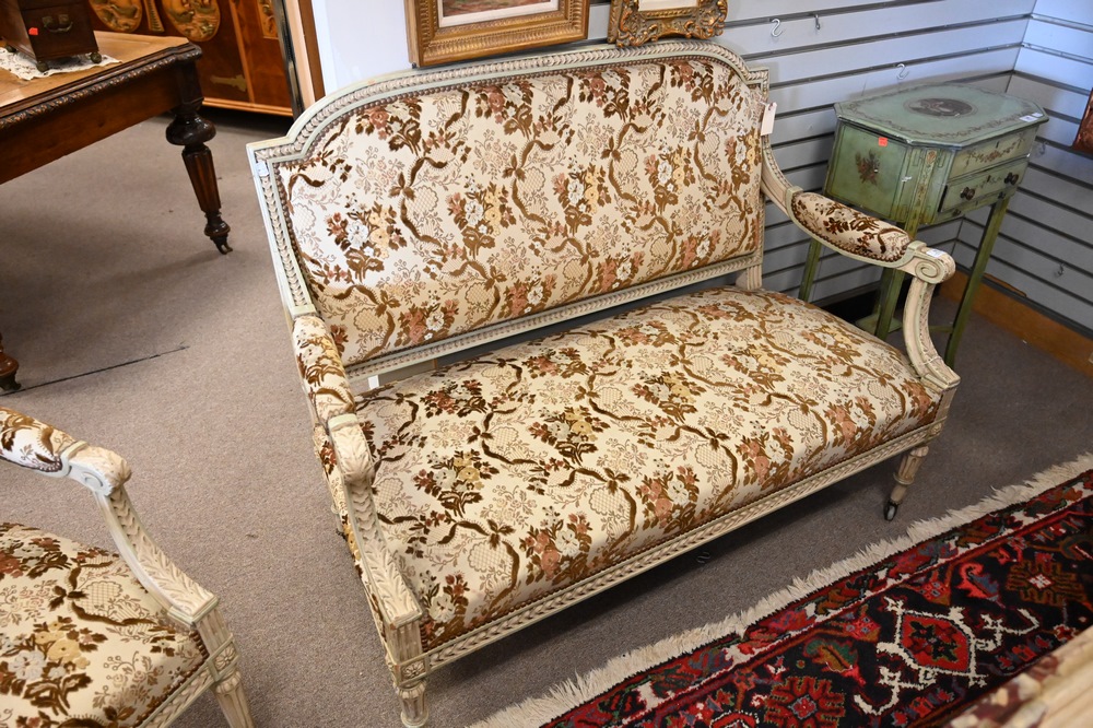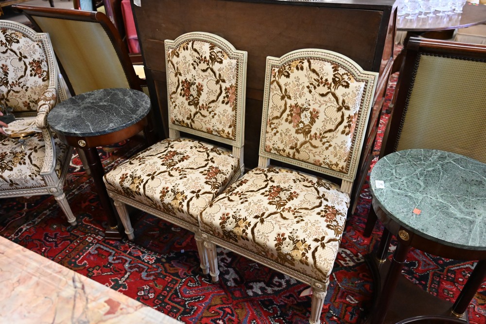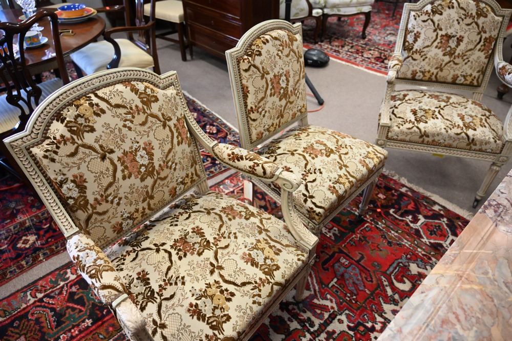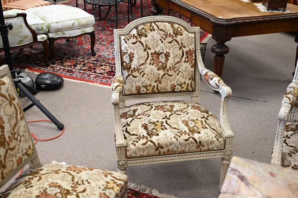 Lot 55: Eight Piece Louis XVI Style Salon Suite, having four armchairs, three side chairs, along with one loveseat, loveseat length 50 inches.