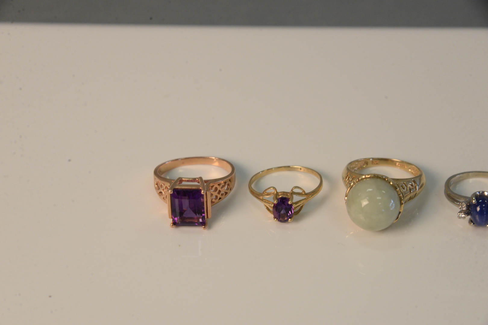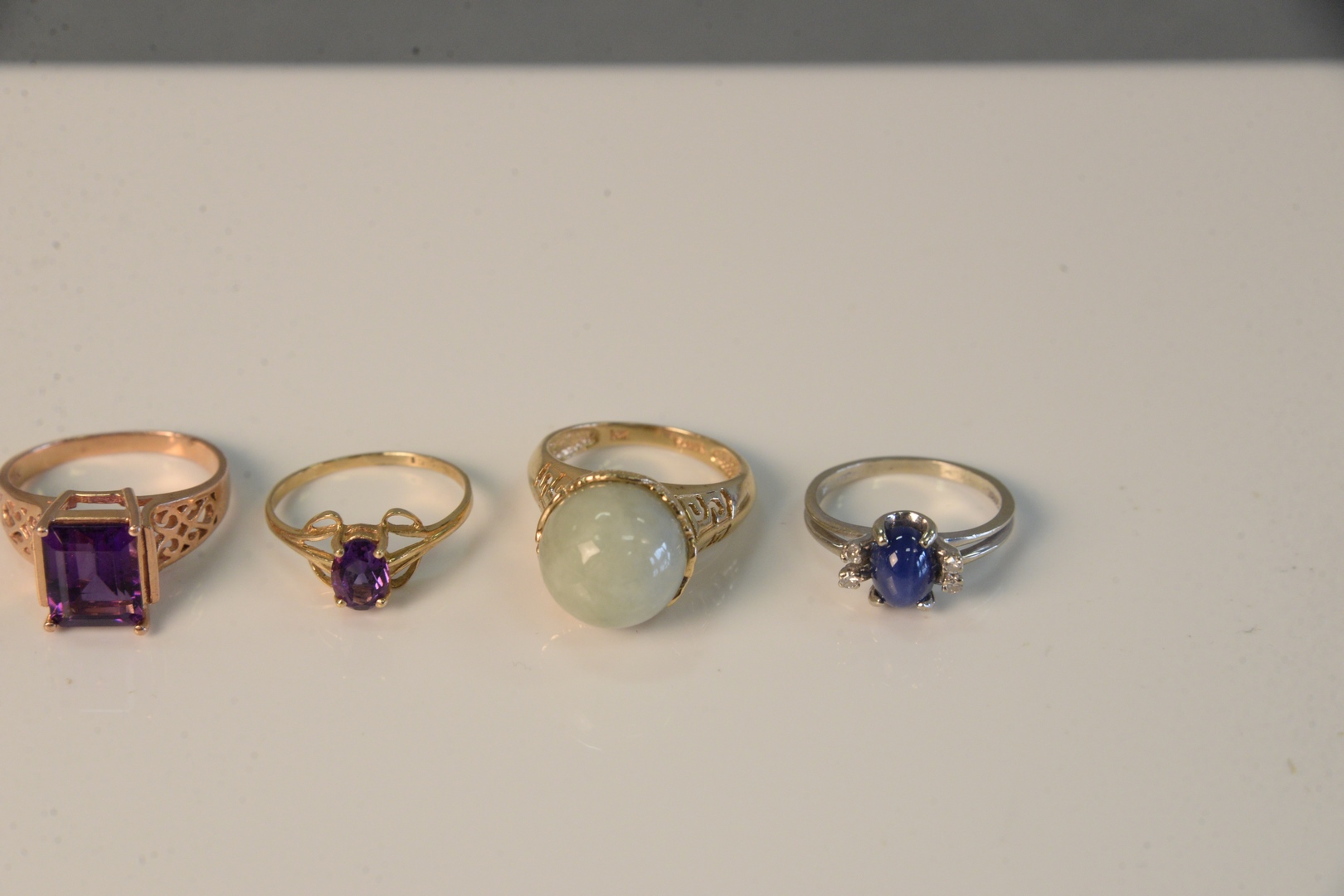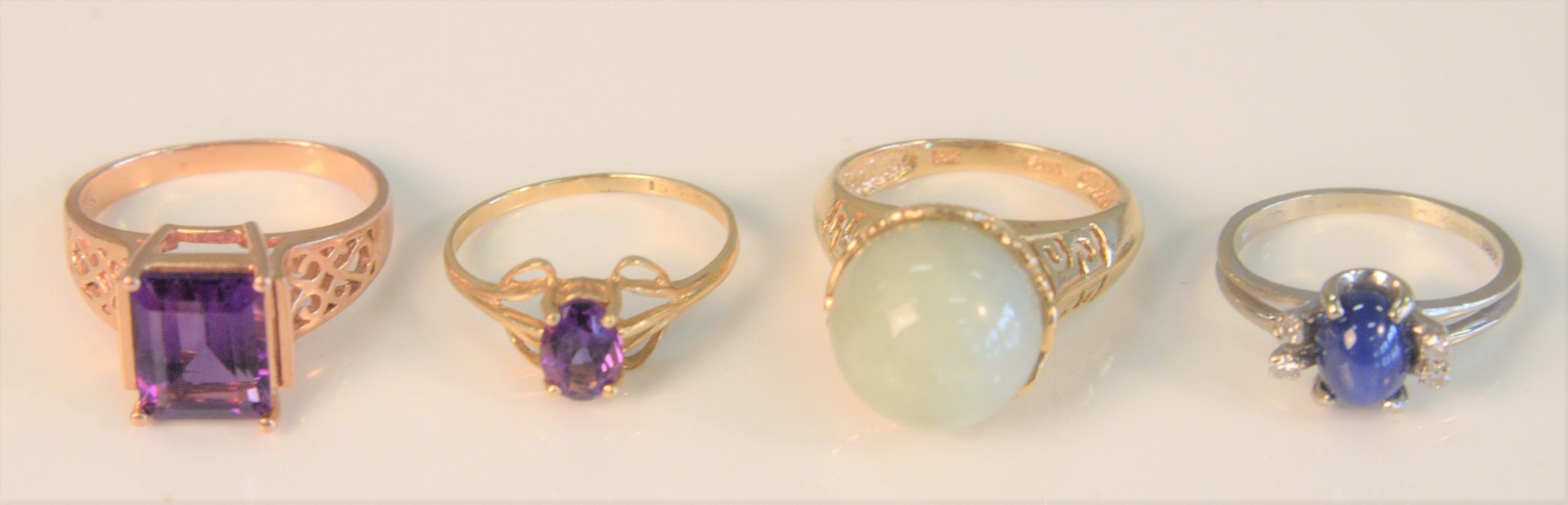 Lot 55: Four 14K Gold Rings one with cabochon jadeite, two with amethyst along with one star sapphire total weight 16.4 grams