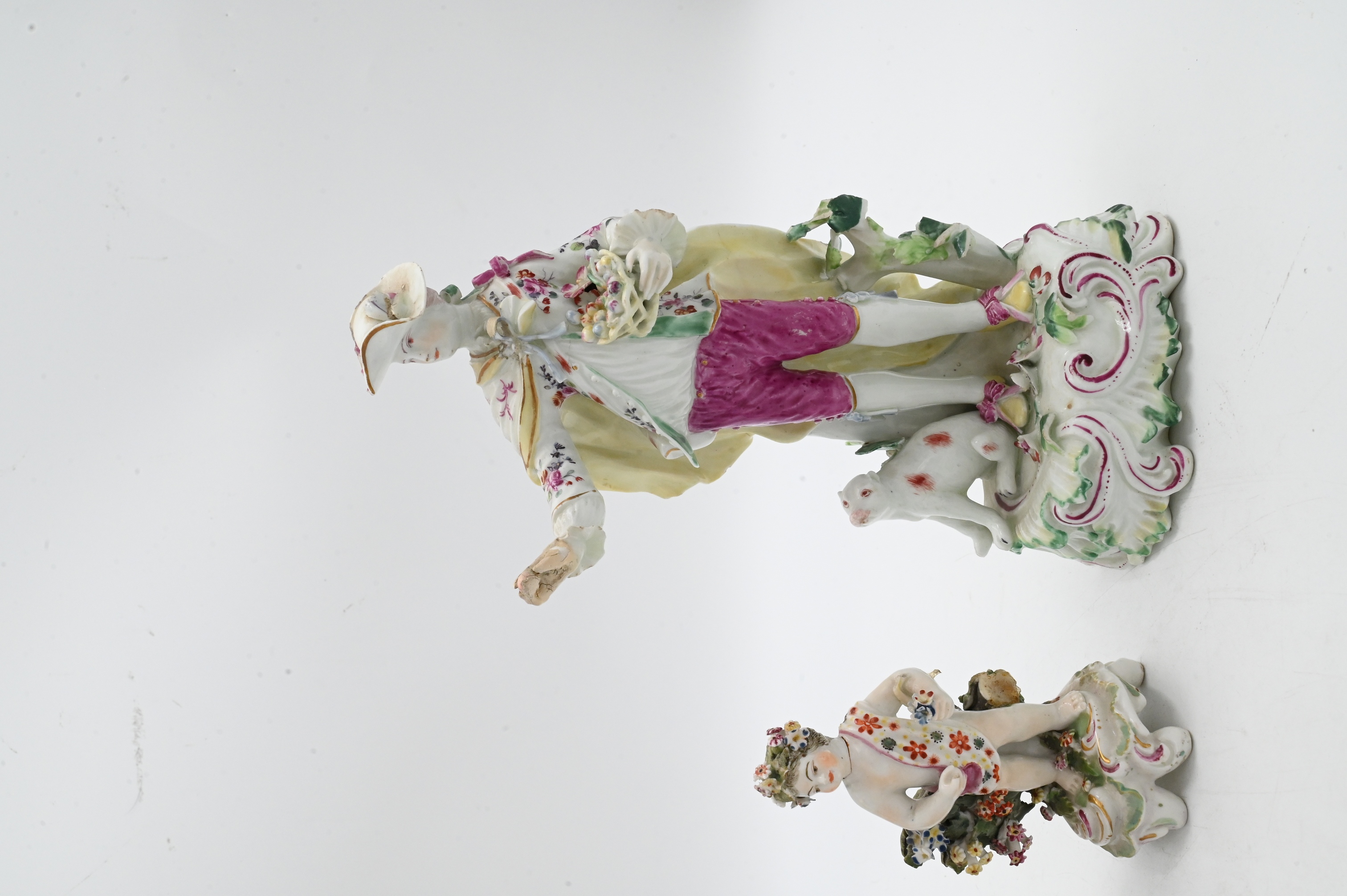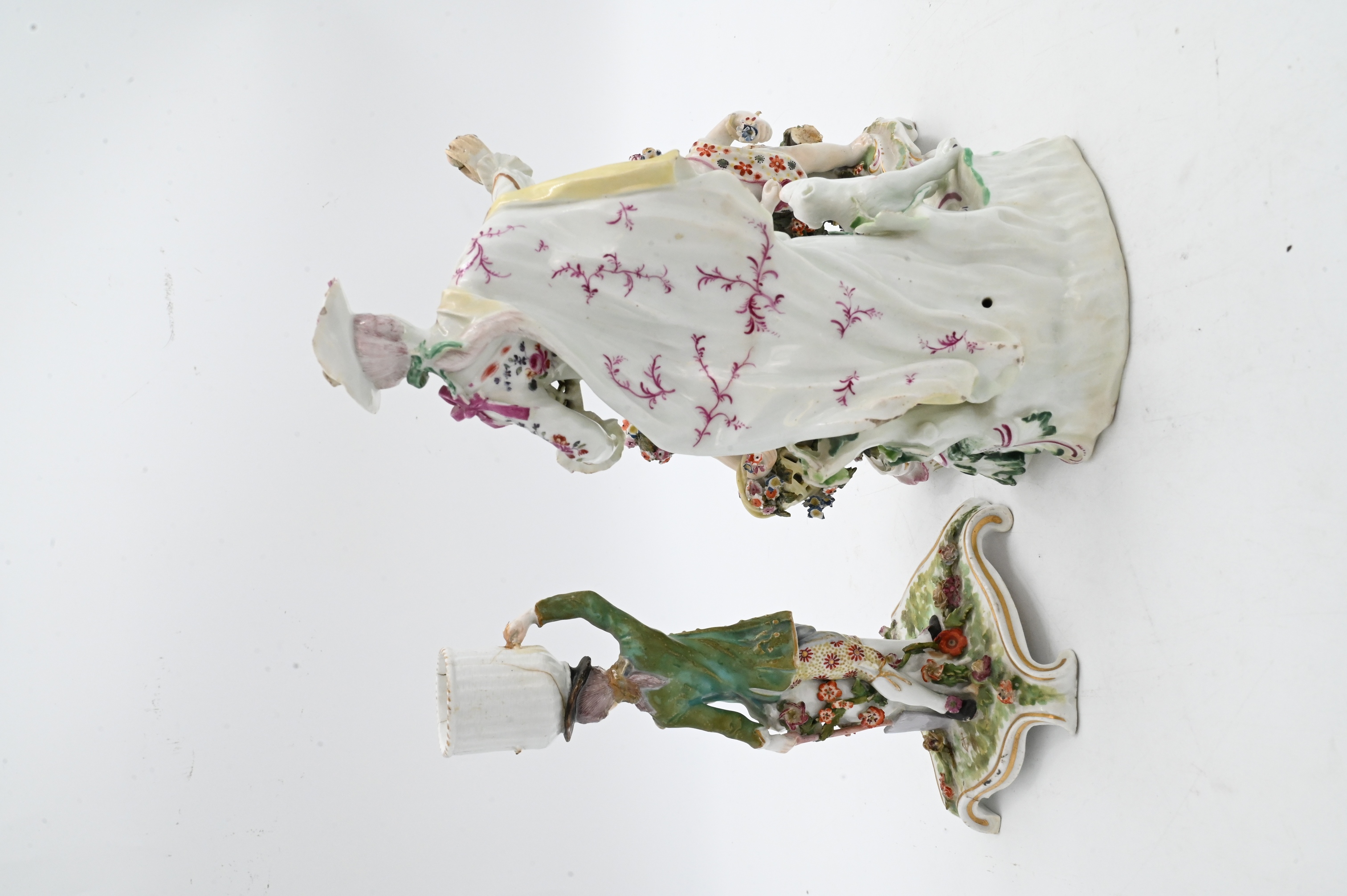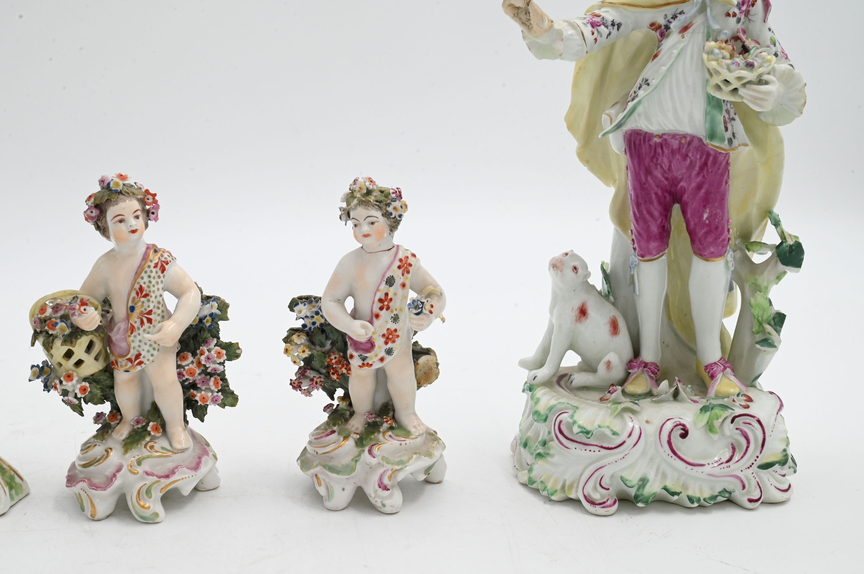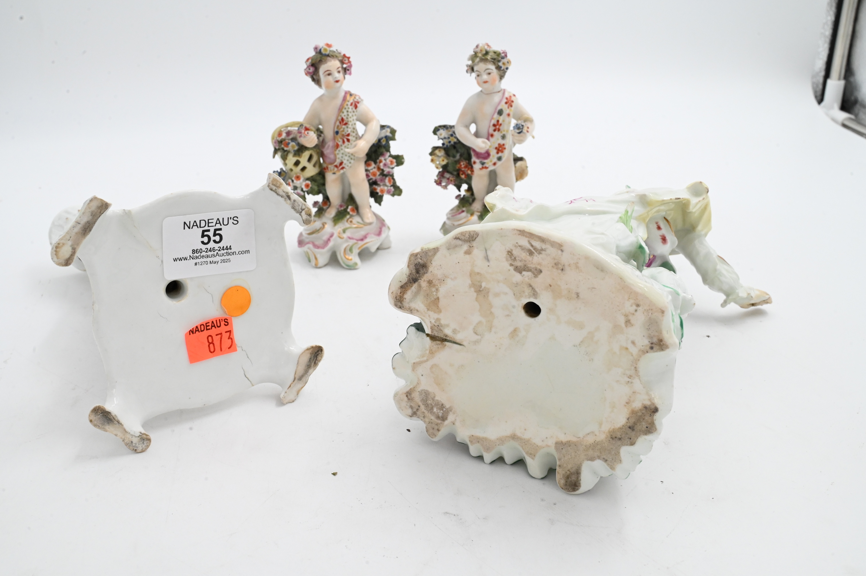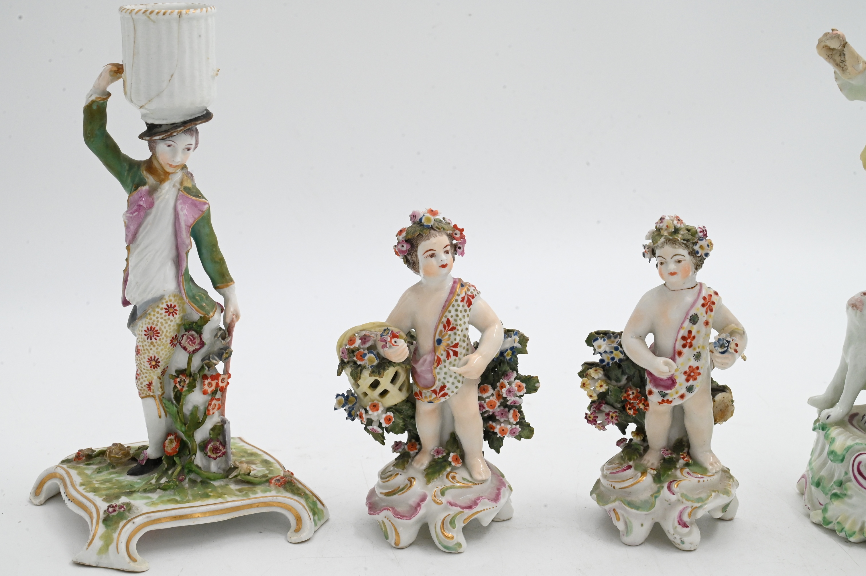 to include the Dresden shepherd figure holding a reticulated basket of flowers and eggs standing against a tree trunk beside crowns and baskets of flowers along with figural candlestick of a man beside a stump, each on gilt pedestal bases, 18th to 19th century (repairs and loss)