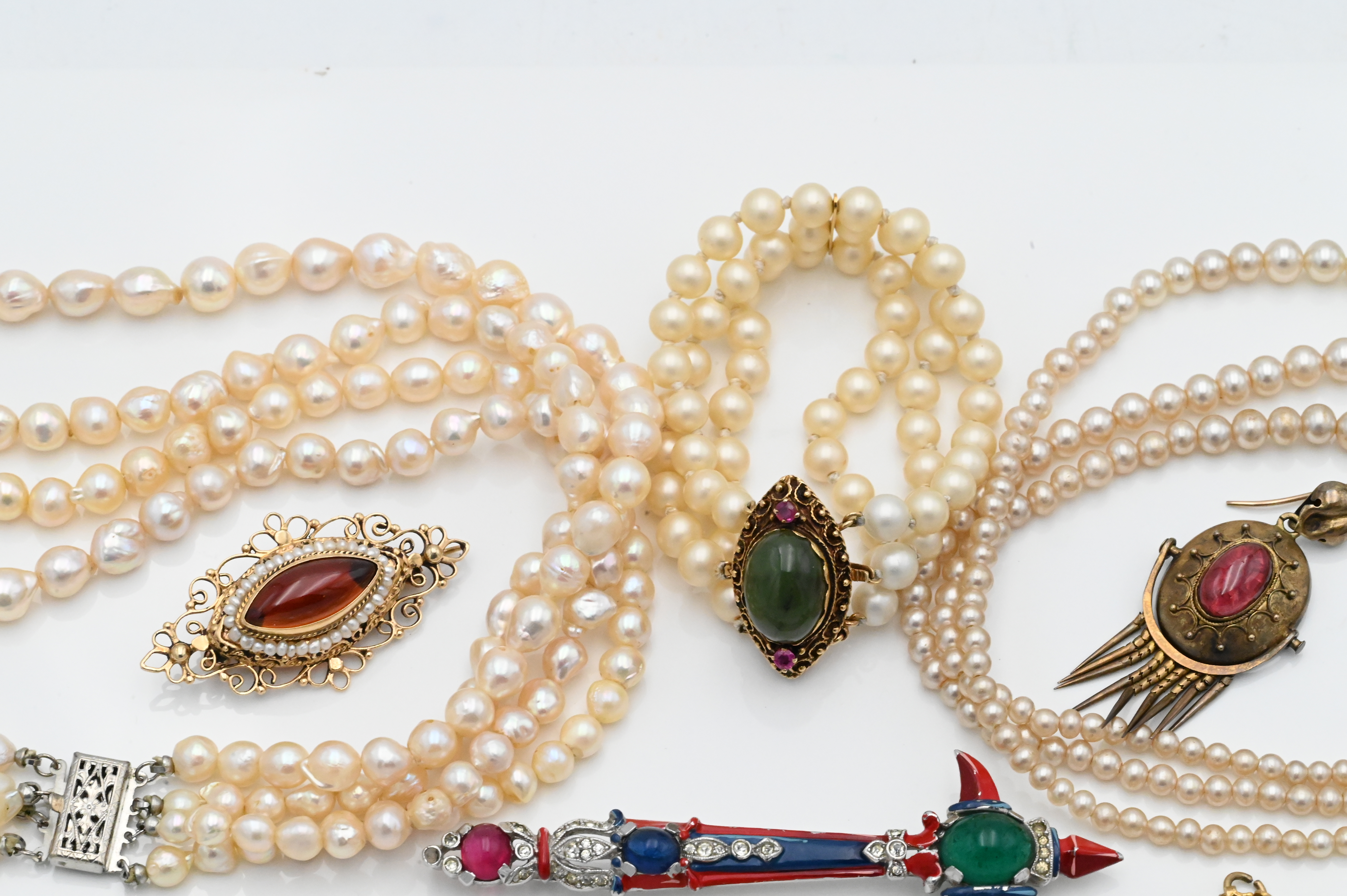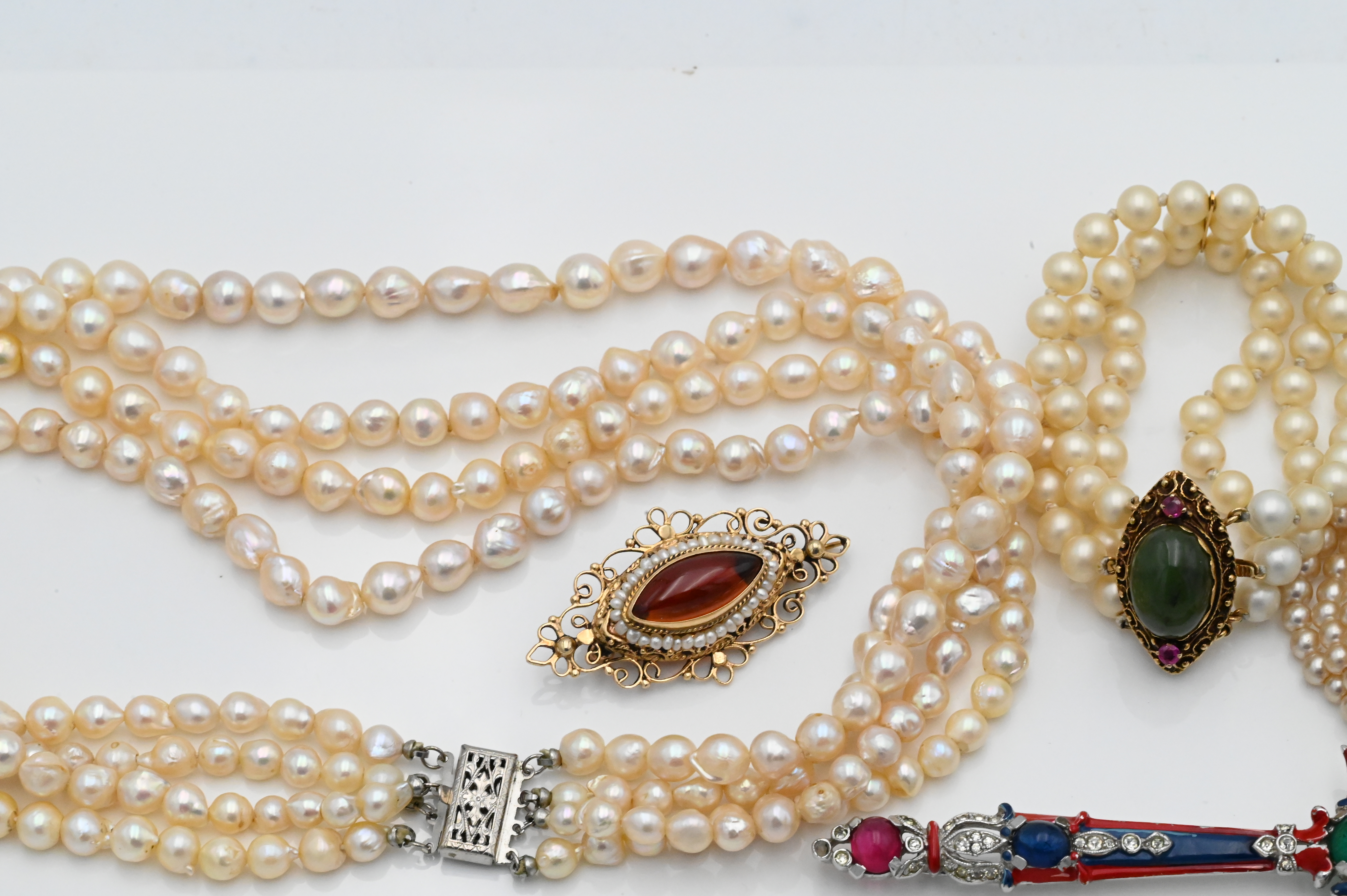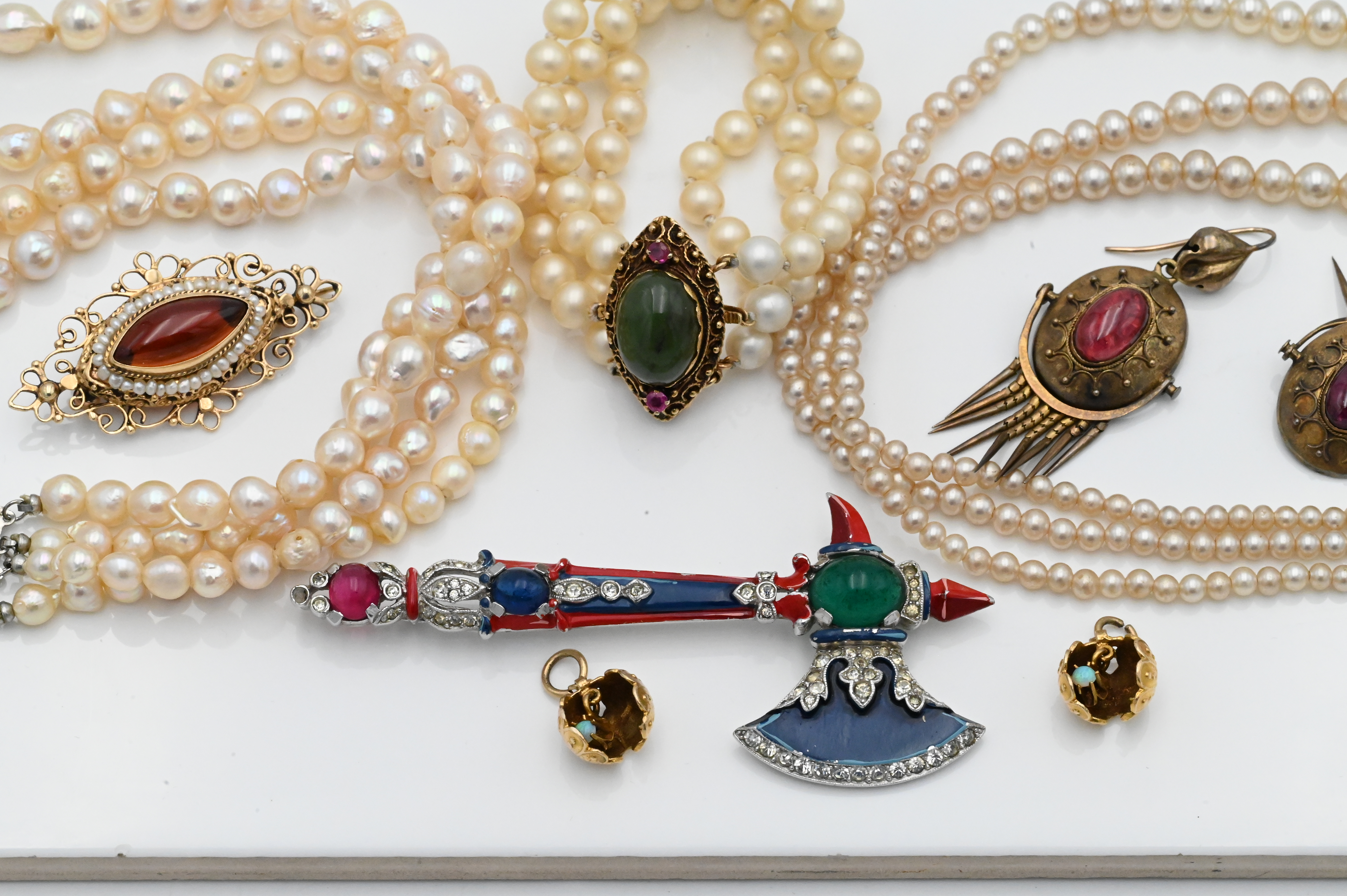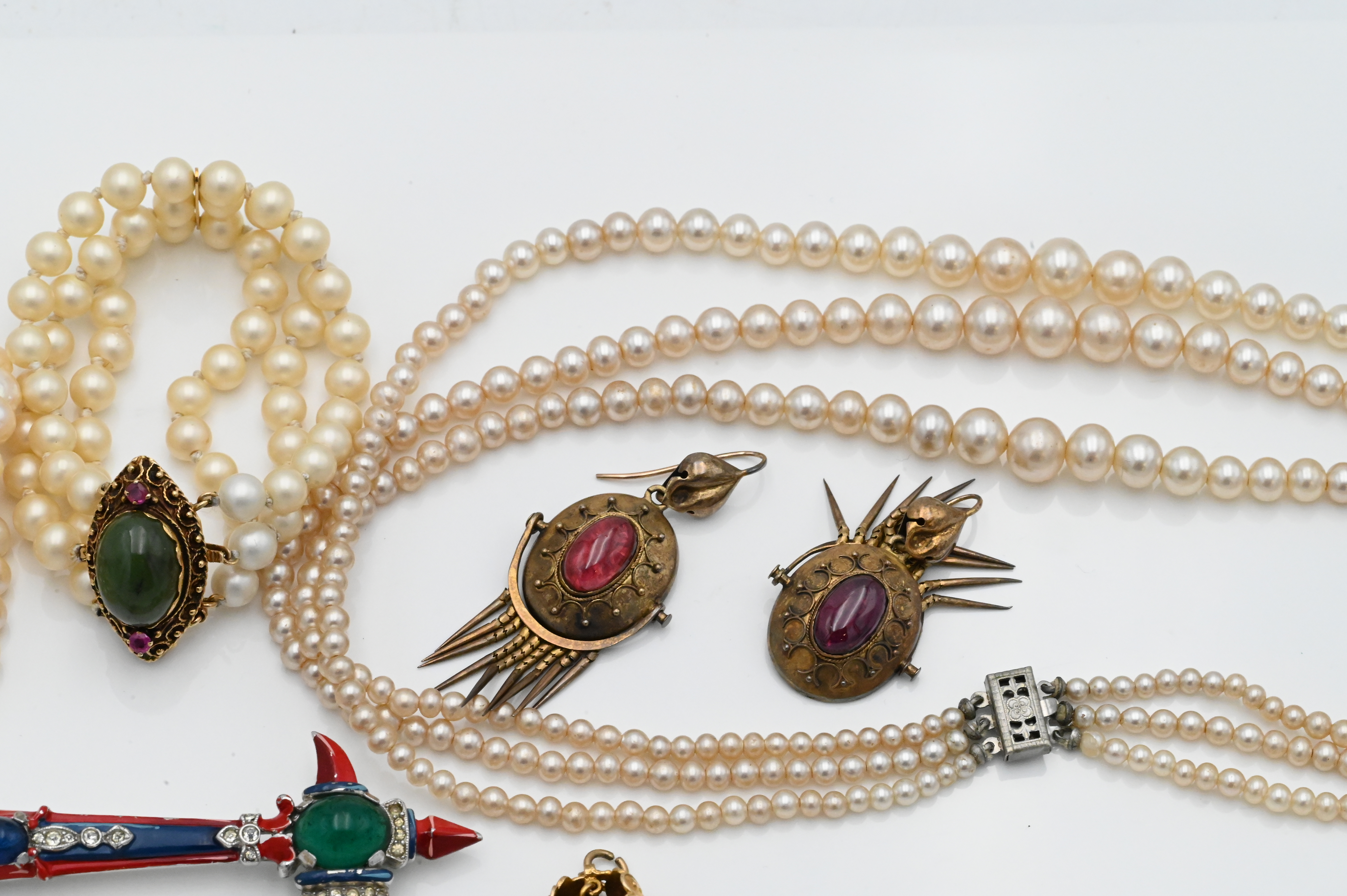 Group of Assorted Jewelry, to include 3 strand pearl bracelet, having 14 karat yellow gold clasp, mounted with green and pink stones, marked MCM 14 karat, along with a pair of earrings having mother of pearls, 14 karat gold Victorian brooch, along with Trifari ax pin, pearl necklace, etc.