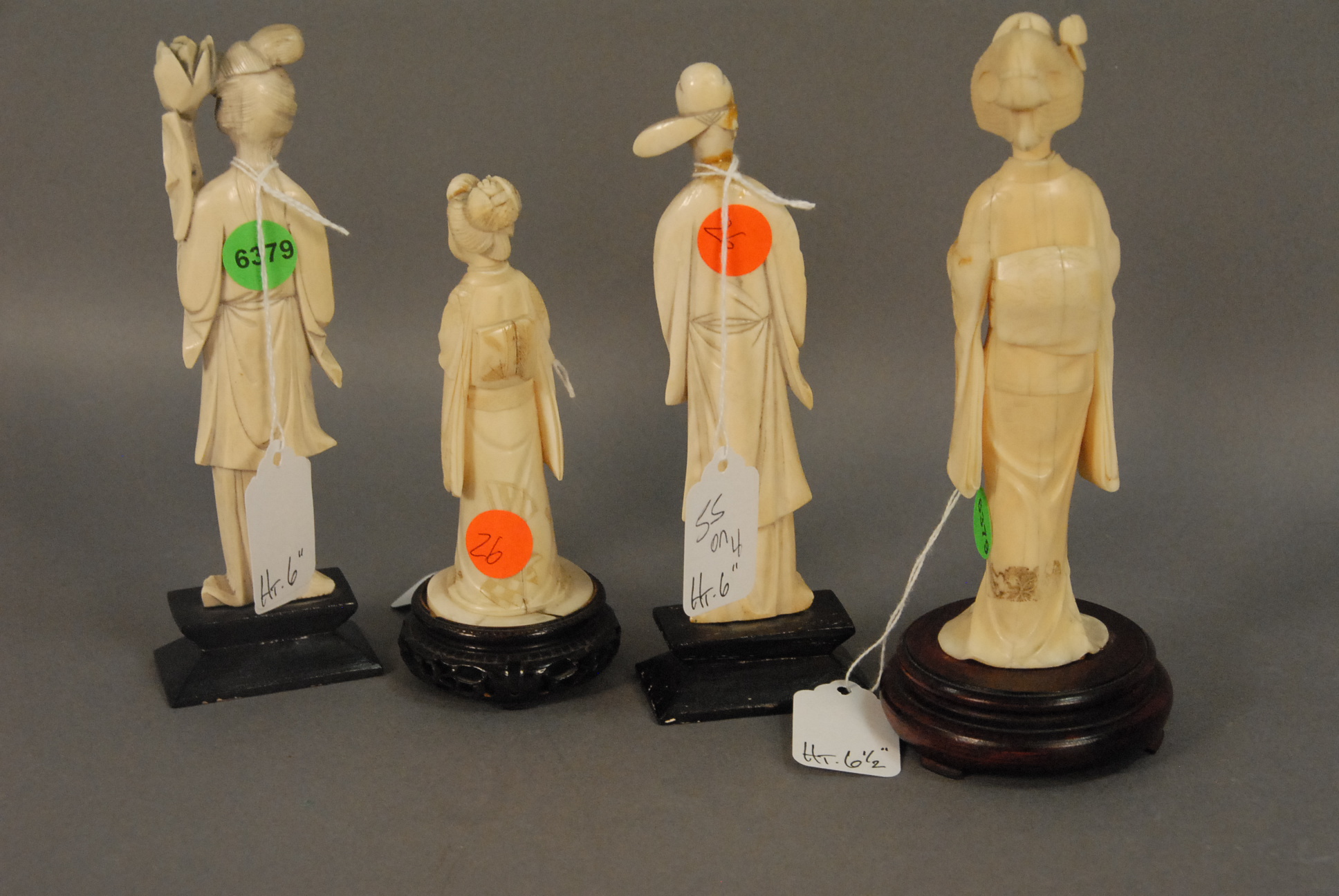 Group of four carved ivory guanyin figures, hts 4 3/4 – 6 1/2, missing minor parts, repairs.