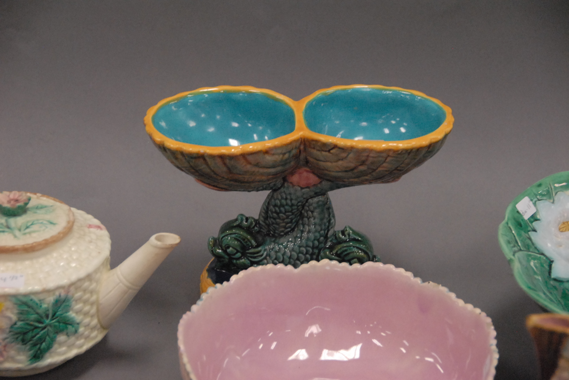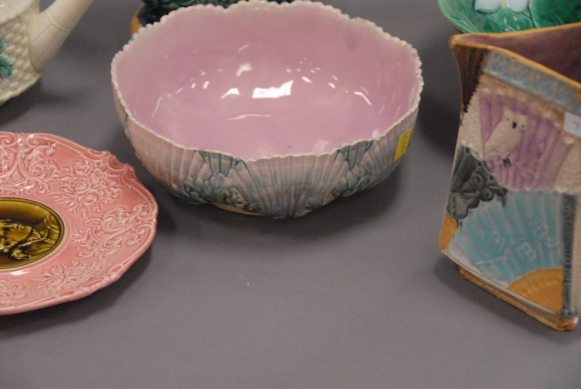 Lot 55: Group of seven Majolica pieces to include Etruscan bowl, tea pot, two pitchers, serving dish, plate, and large lotus bowl.