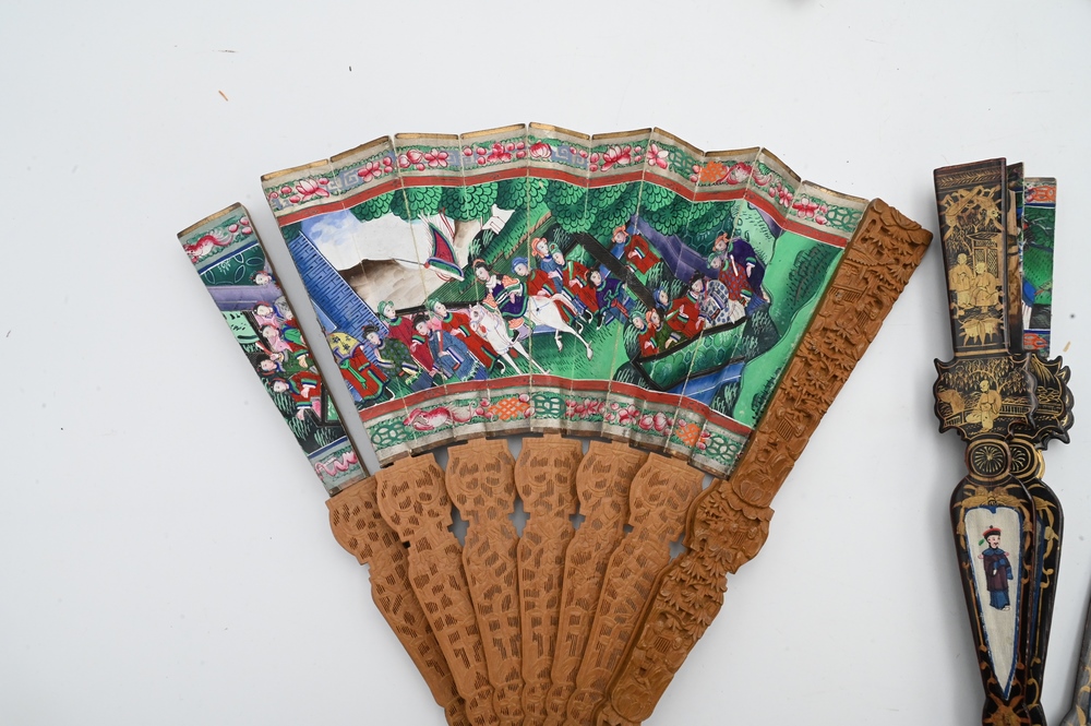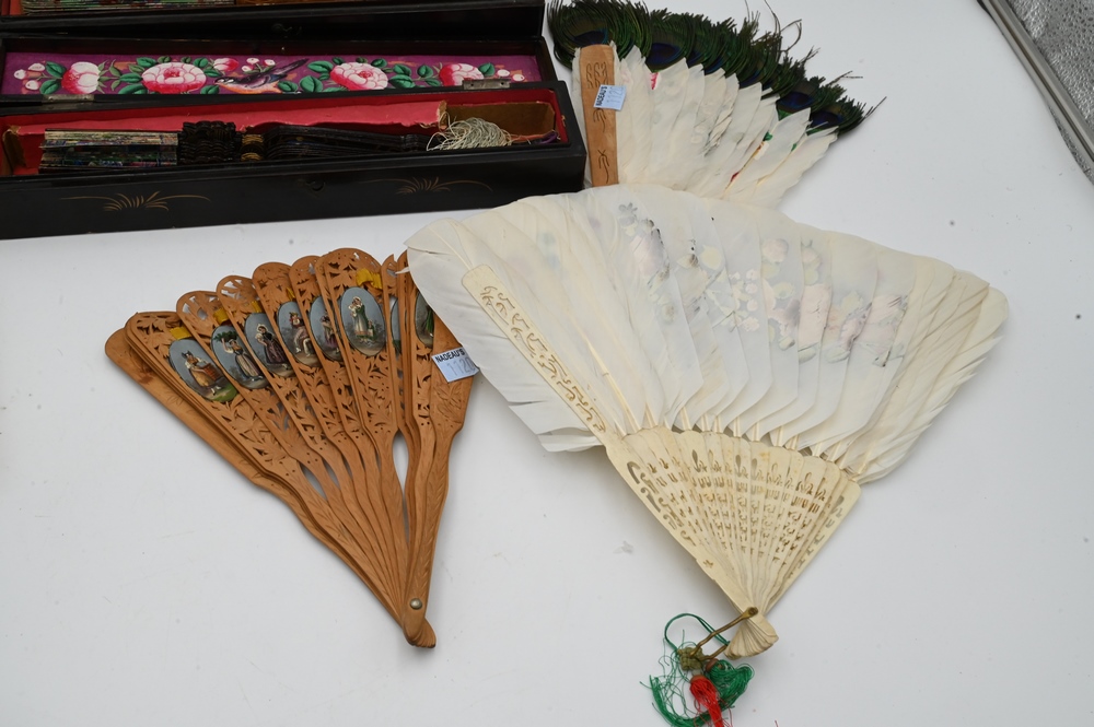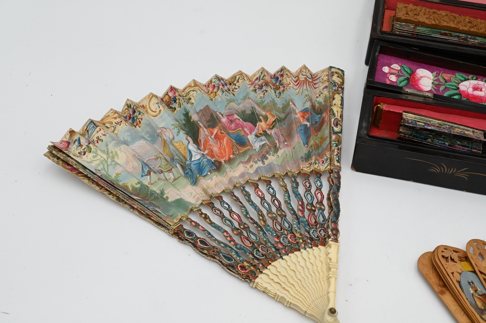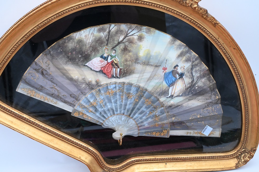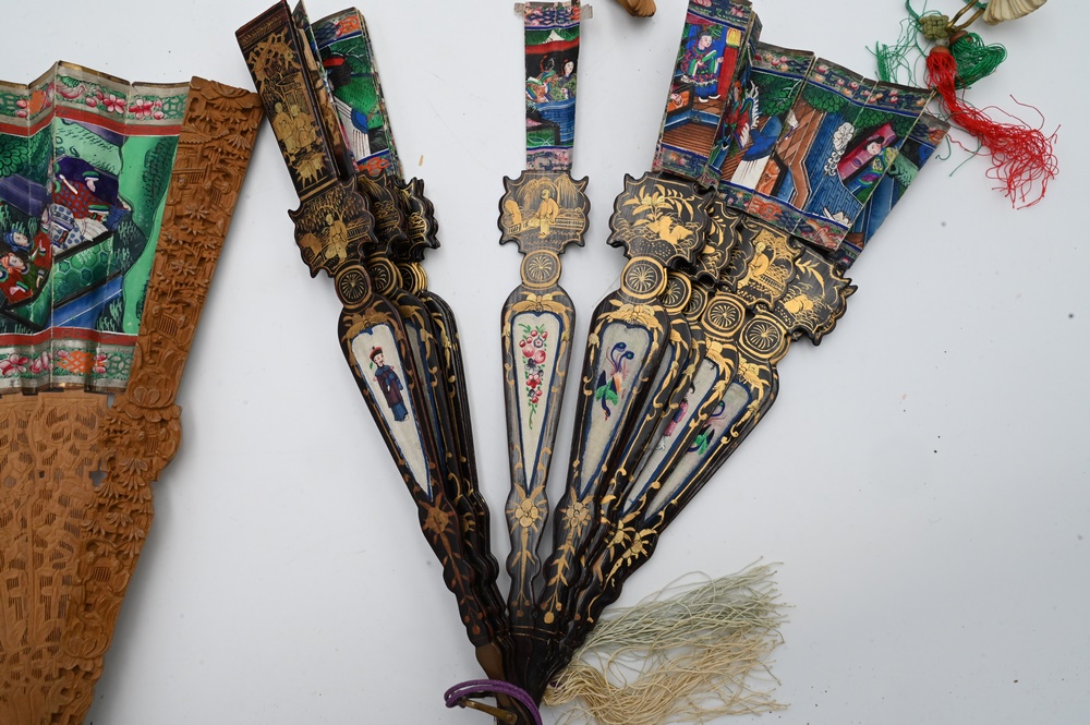 Lot 55: Group of Victorian and Chinese Fans, Watteau painted fan in shadowbox frame, 17″ x 22″; two Chinese fans in black lacquer boxes, along with four other frames.