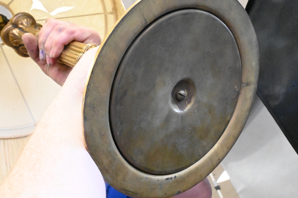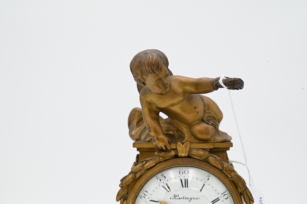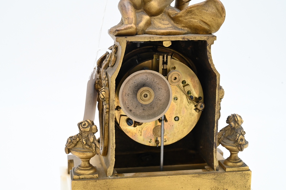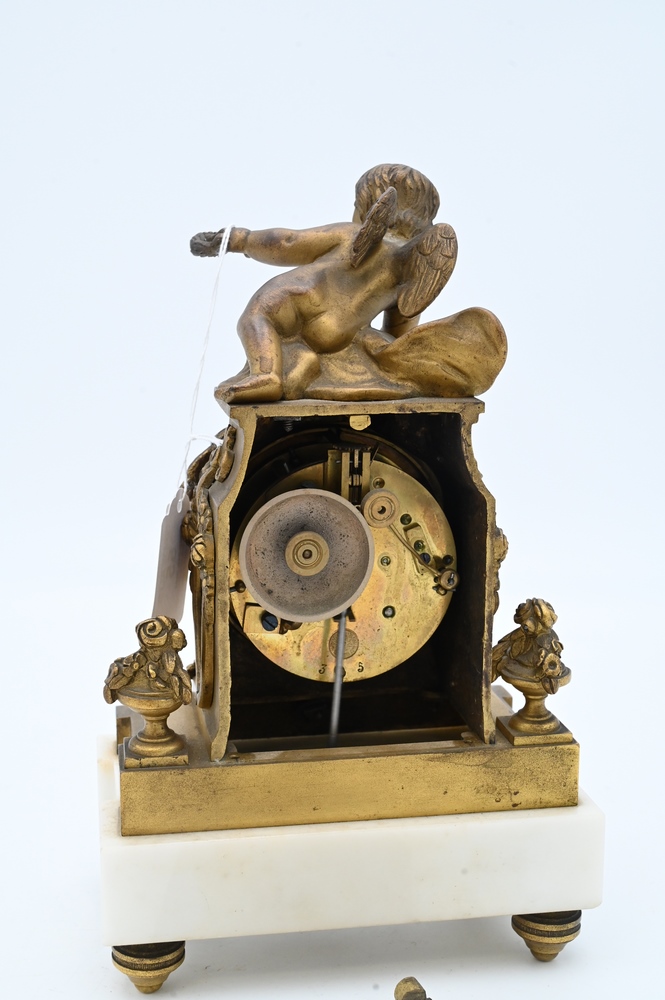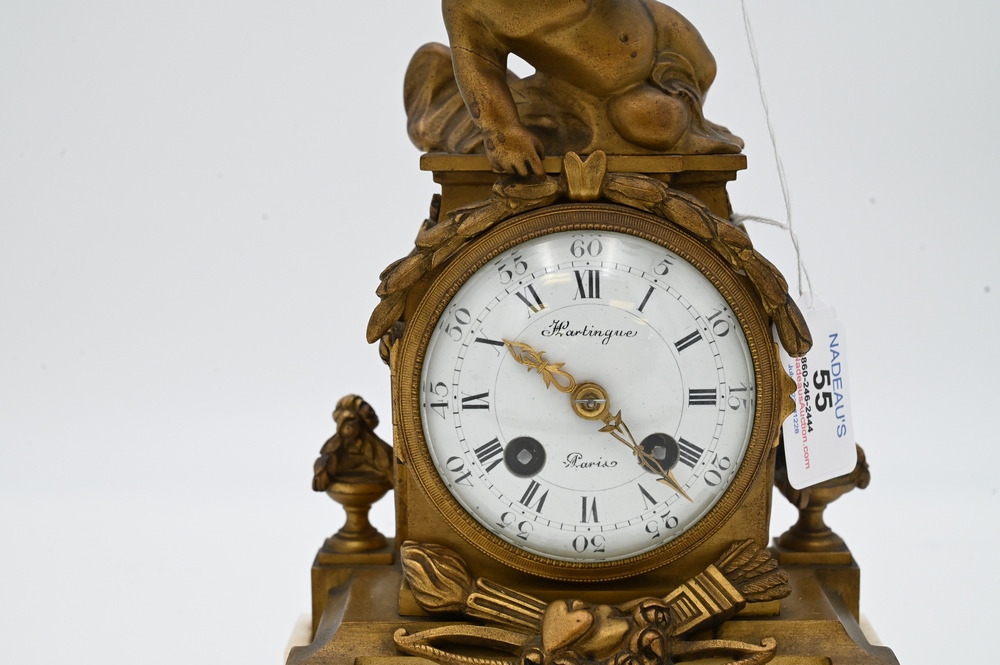 Hartingue French Bronze Figural Mantle Clock, having winged putti over round enameled clock face on white alabaster base, height 10 inches.