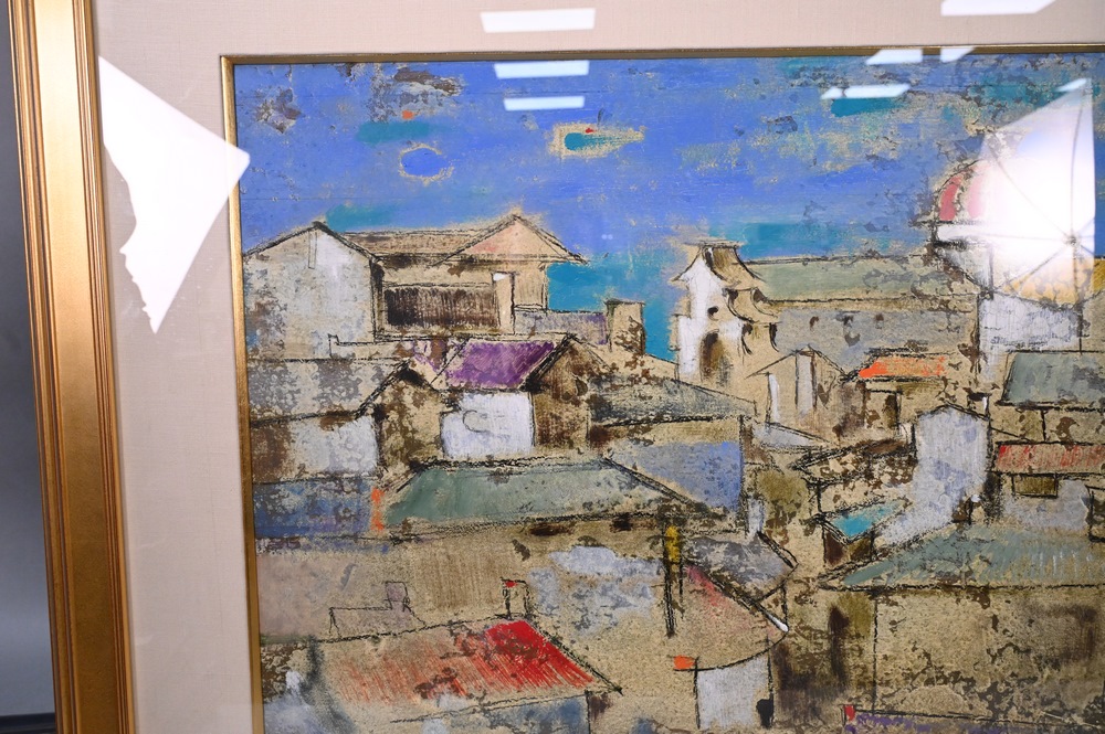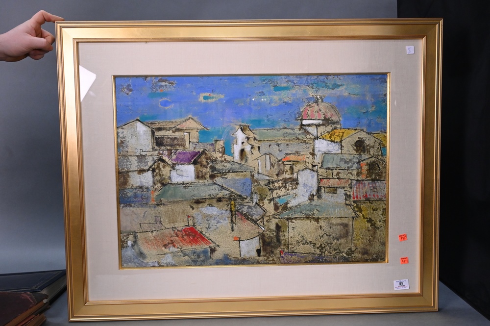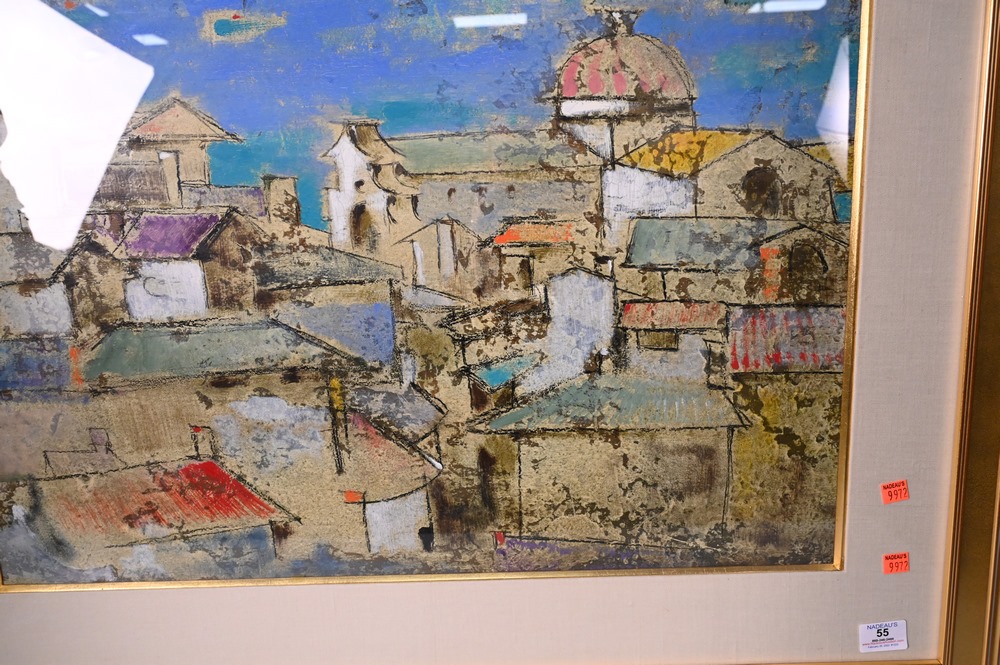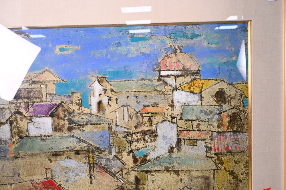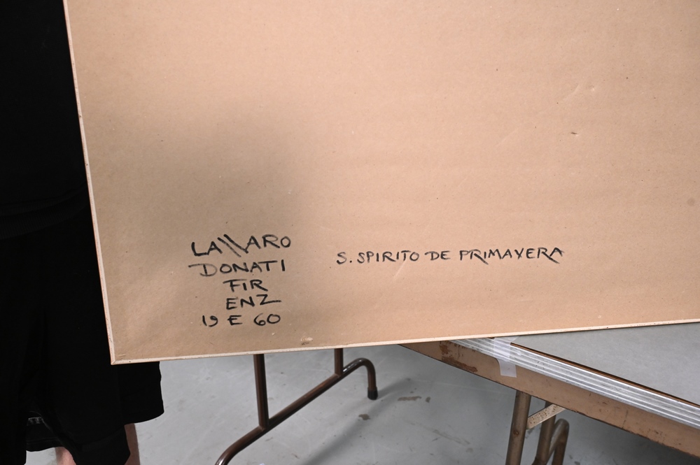 Lot 55: Lazzaro Donati (Italy, 1926 – 1977), S.Spirito De Primavera Cityscape, oil on panel, signed and dated on verso “Lazzaro Donati Firenze 19E”, 19″ x 26 3/4″.