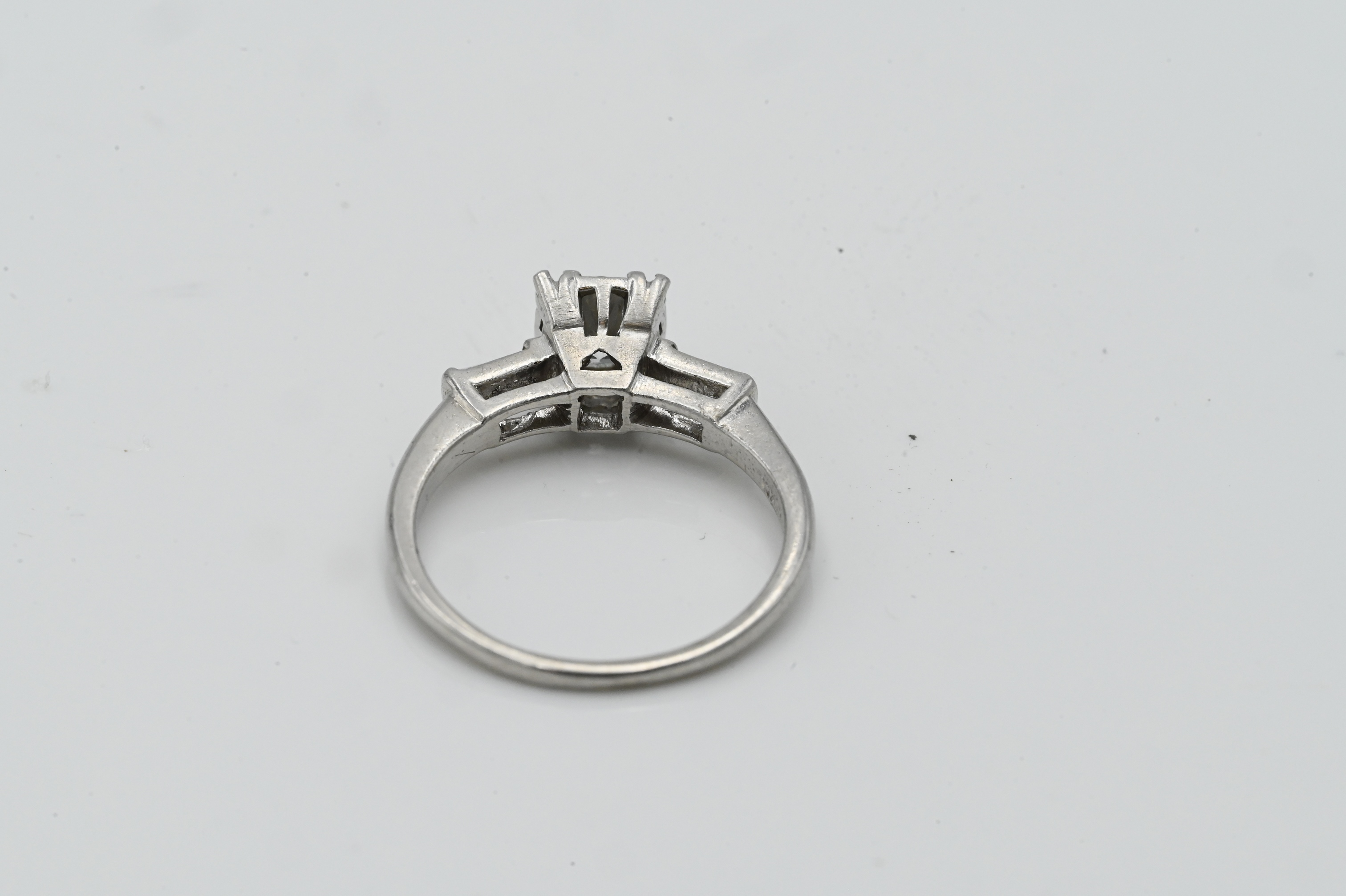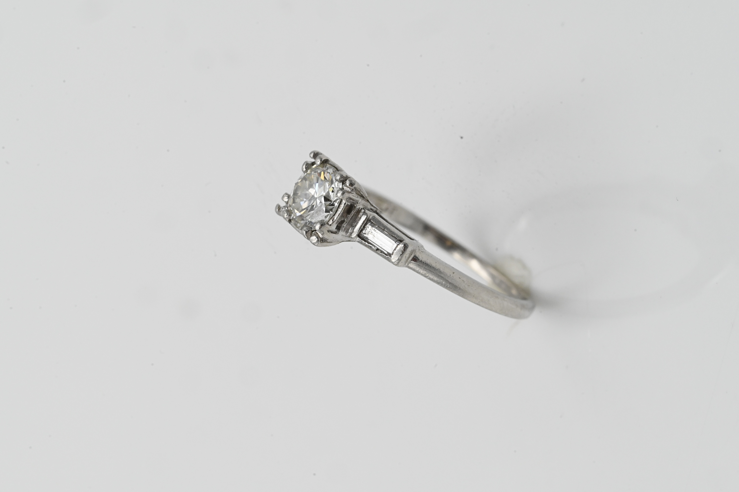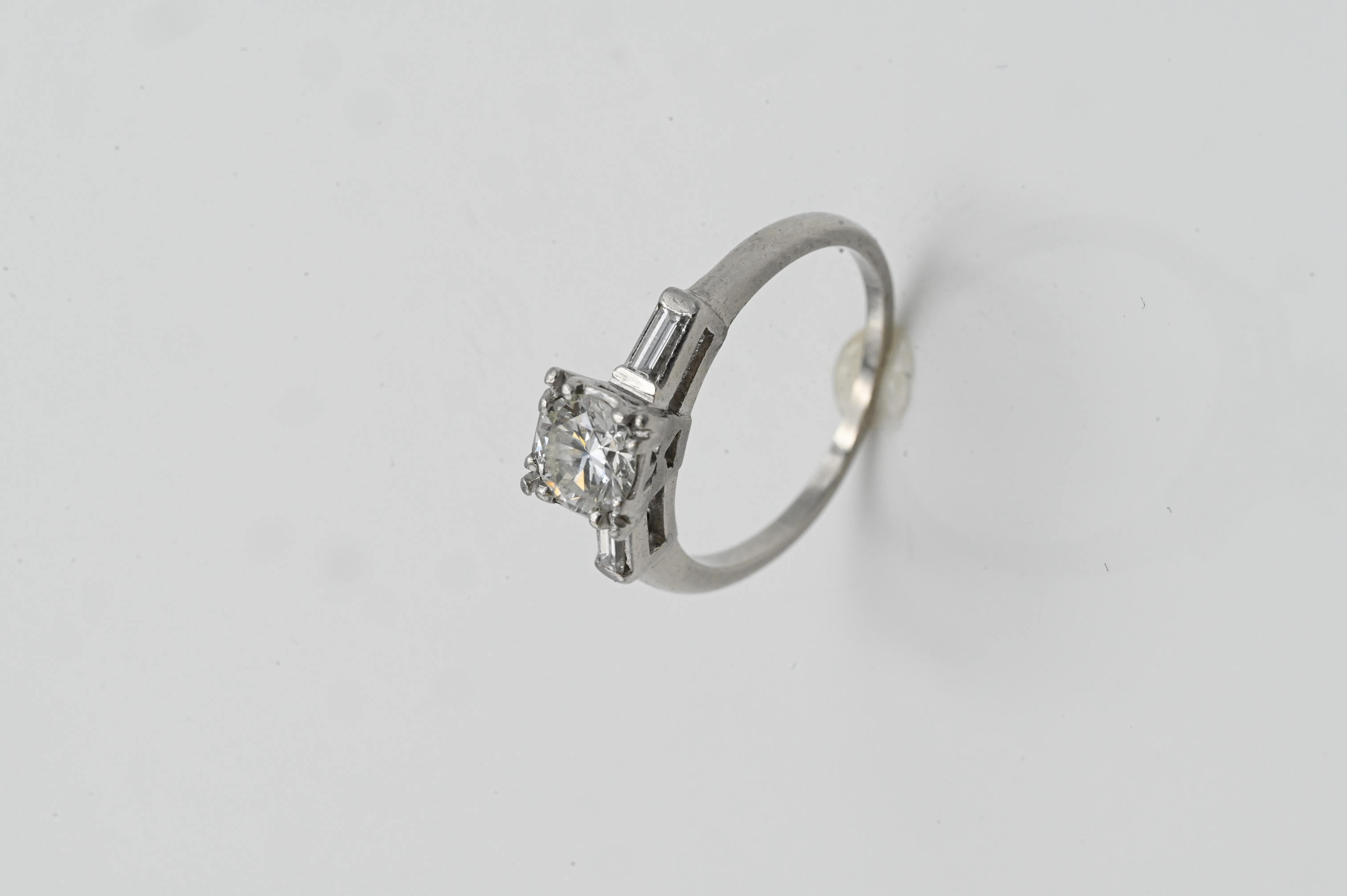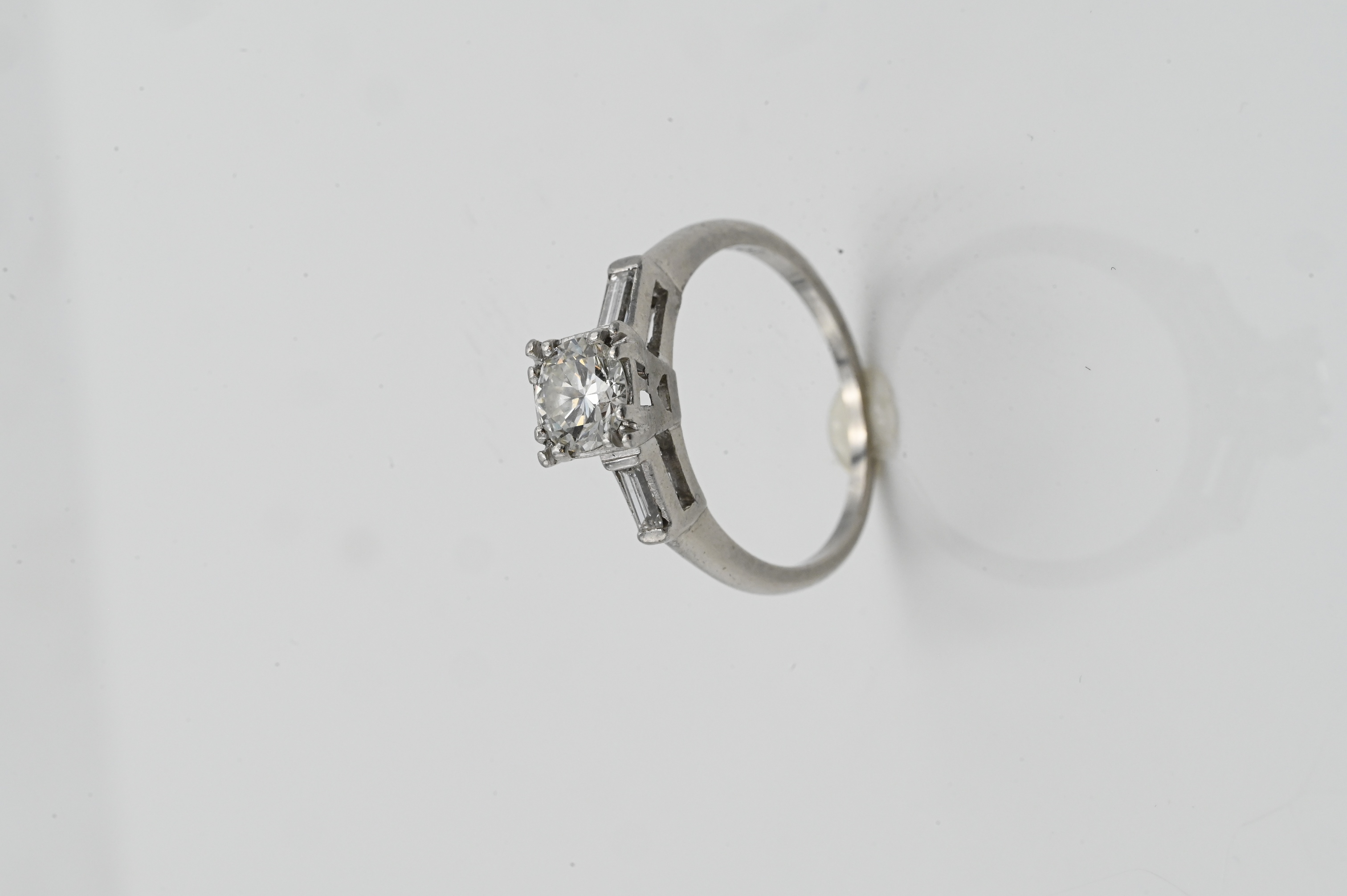 set with center 6.4 millimeter diamond, flanked by baguette diamonds