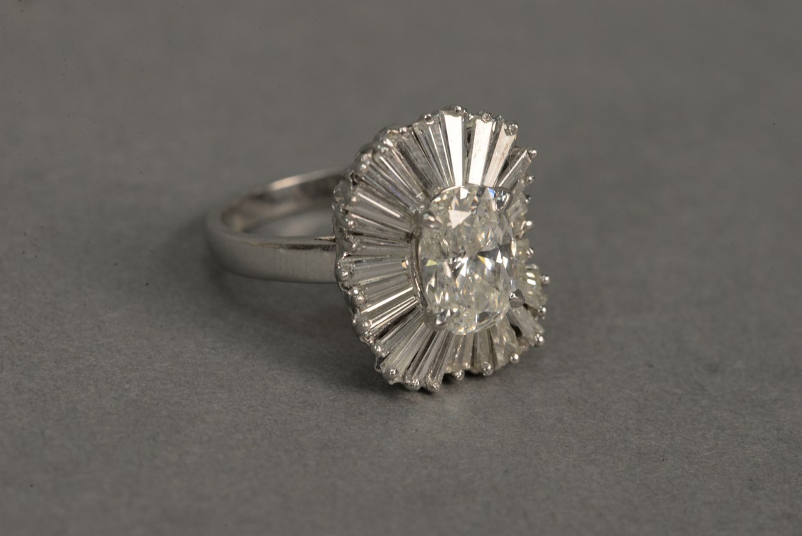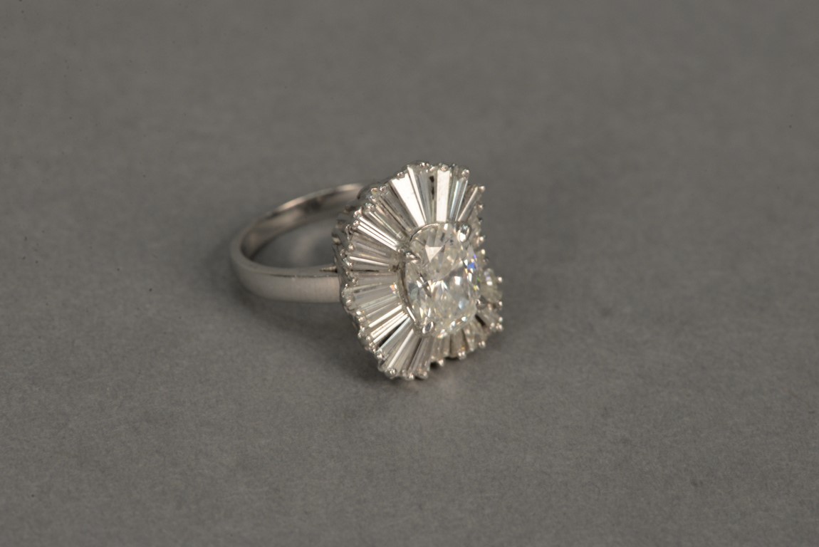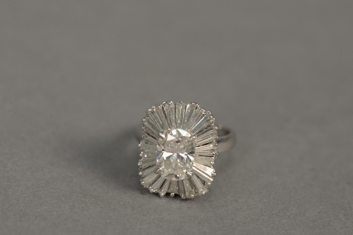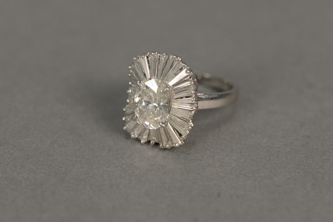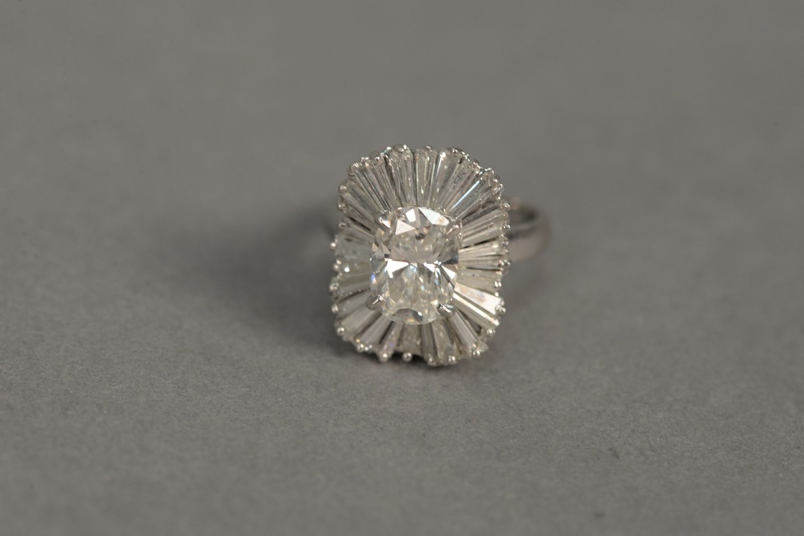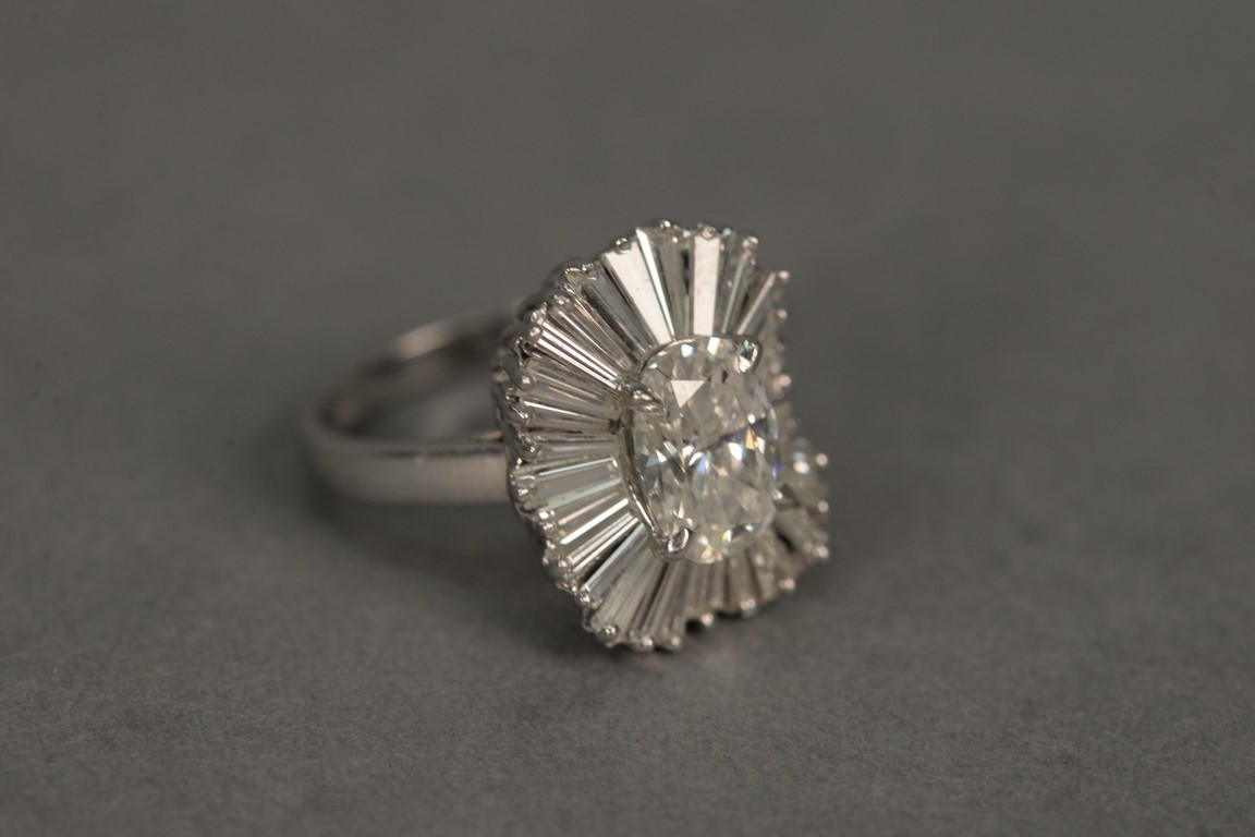 Lot 55: Platinum and diamond ring/pendant set with oval center diamond approximately 1.5ct surrounded by 31 baguette diamonds, comes apart t…