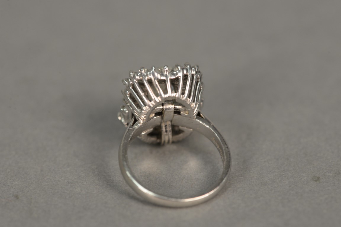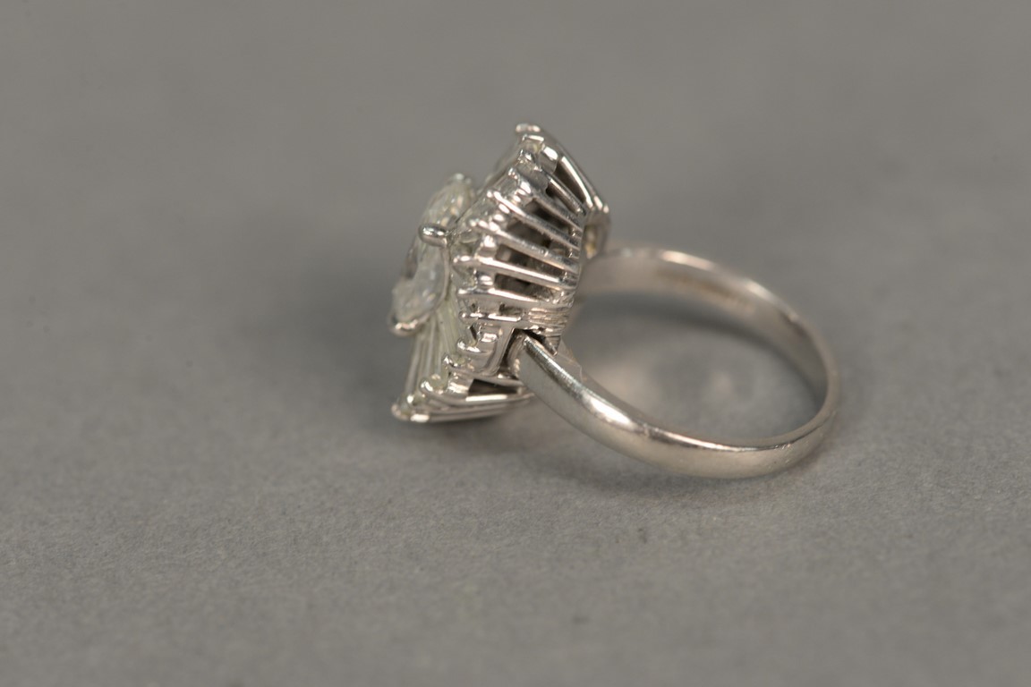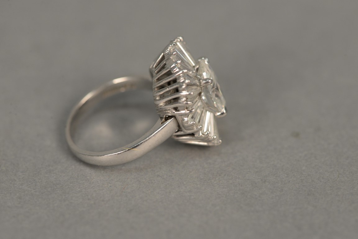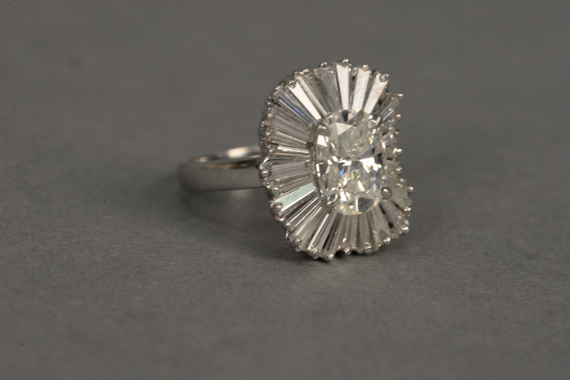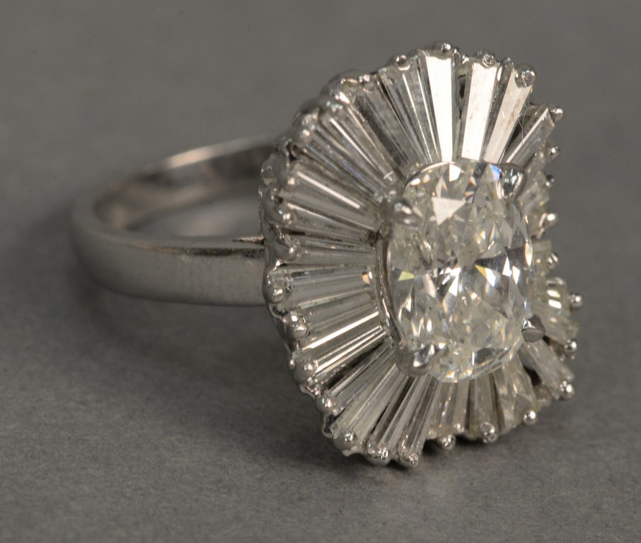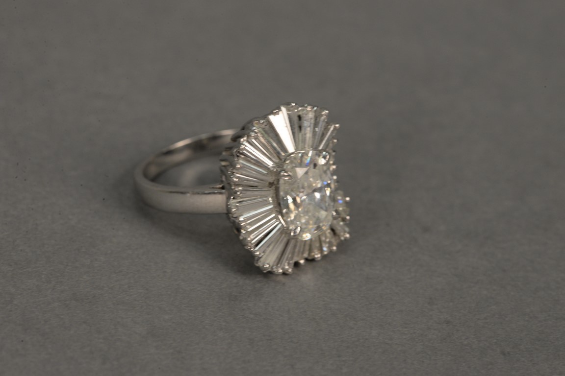 Lot 55: Platinum and diamond ring/pendant set with oval center diamond approximately 1.5ct surrounded by 31 baguette diamonds, comes apart t…