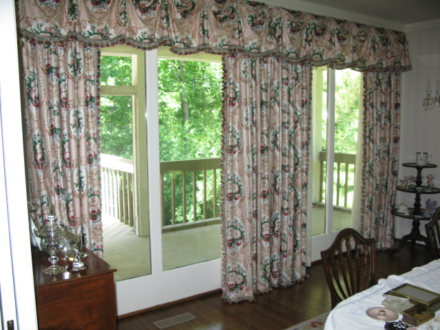 Set of three Chintz custom made decorator set of drapes with tassels and valances, all lined in like new condition