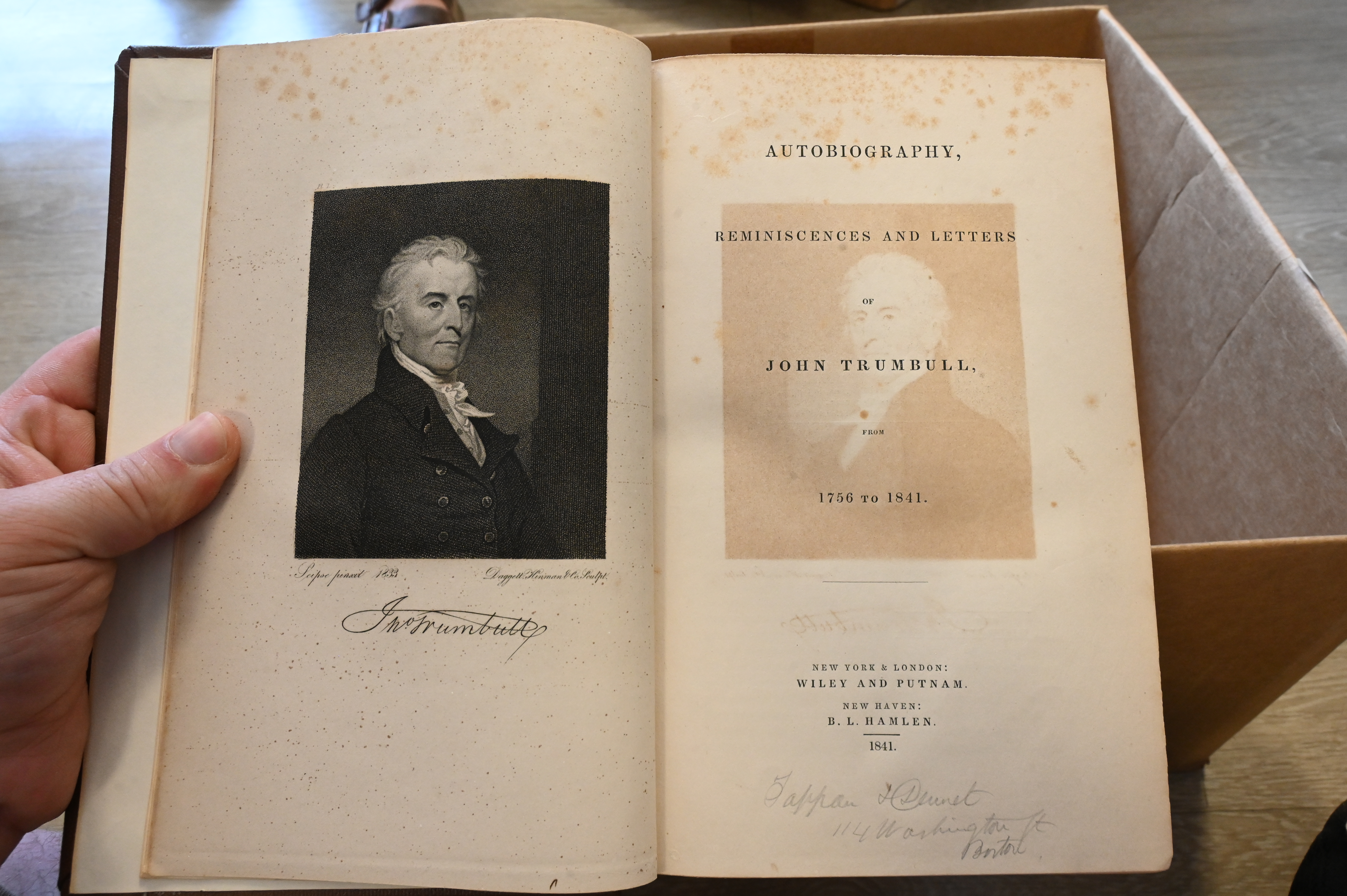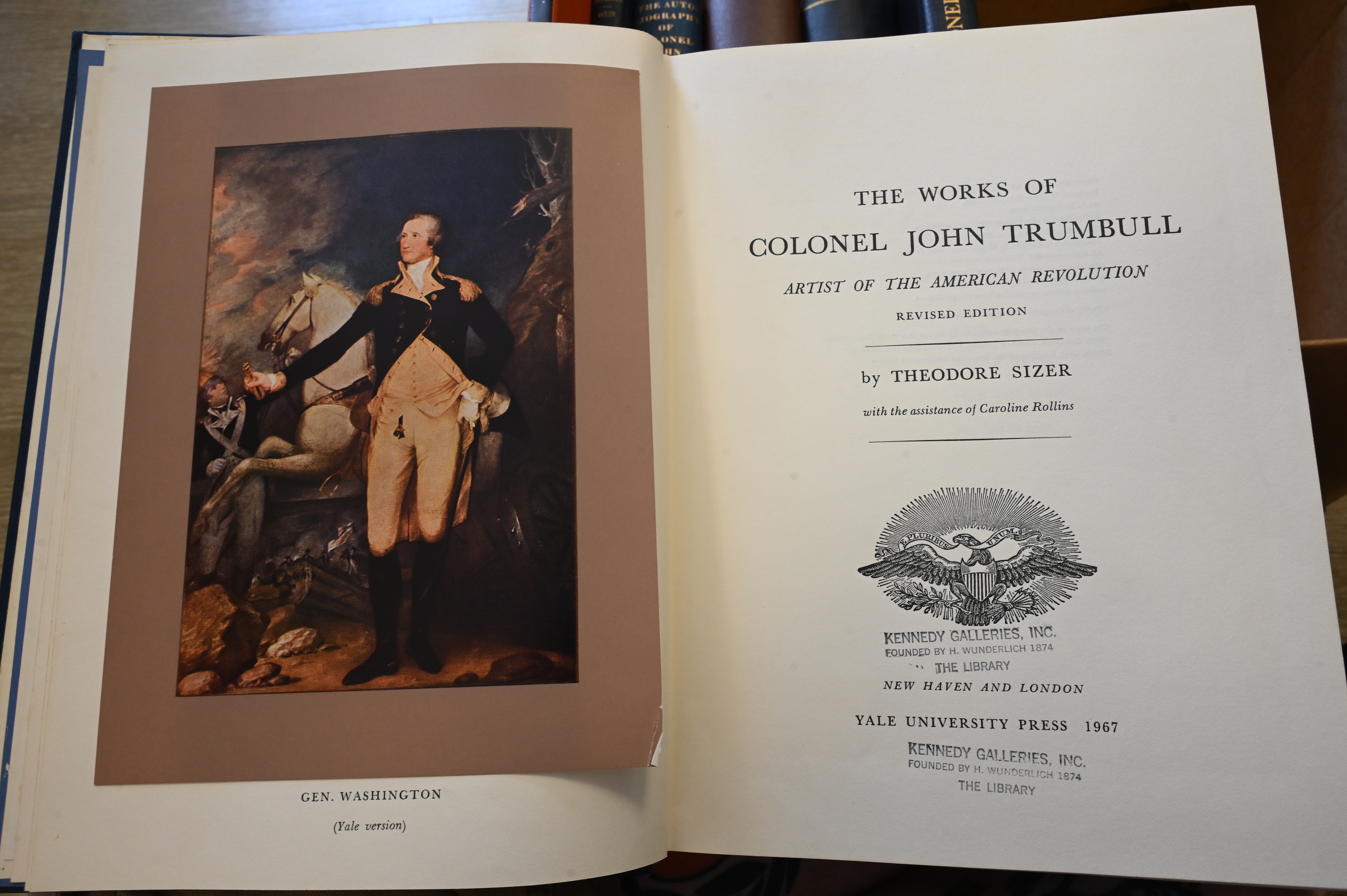 to include two autobiography reminiscences and letters of John Trumbull from 1756-1841, published in New York and London: Wiley and Putnam, New Haven, B.L. Hamlin 1841 with sketches and maps, two: The Works of Colonel John Trumbull by Theodore Sizer, 1950 and 1967 editions, The Autobiography of Colonel John Trumbull by Theodore Sizer published 1953, in Yale New Haven, John Trumbull and His Works by John Weir published 1901, John Trumbull by Durand 1881 reprinted from The American Art Review