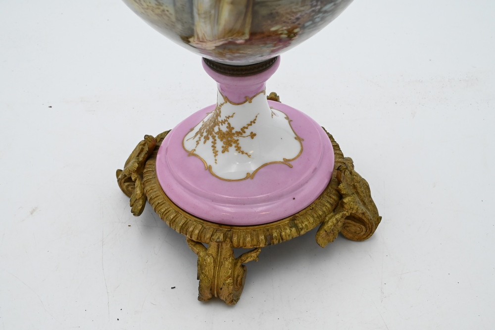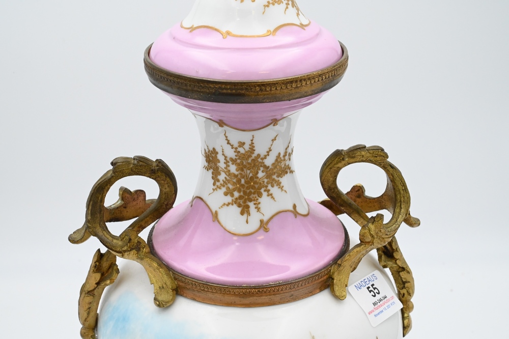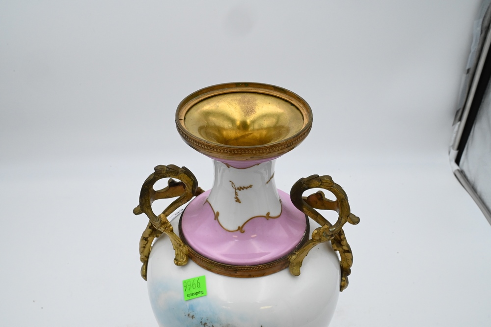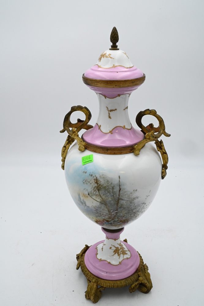 Lot 55: Sevres French Porcelain Urn, having pink ground with painted scene depicting girl at a well, bronze mounted handles on bronze base, height 20 inches.
