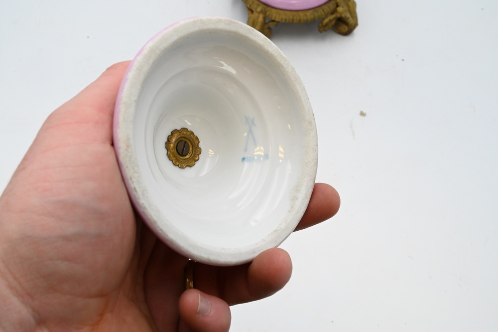 Sevres French Porcelain Urn, having pink ground with painted scene depicting girl at a well, bronze mounted handles on bronze base, height 20 inches.