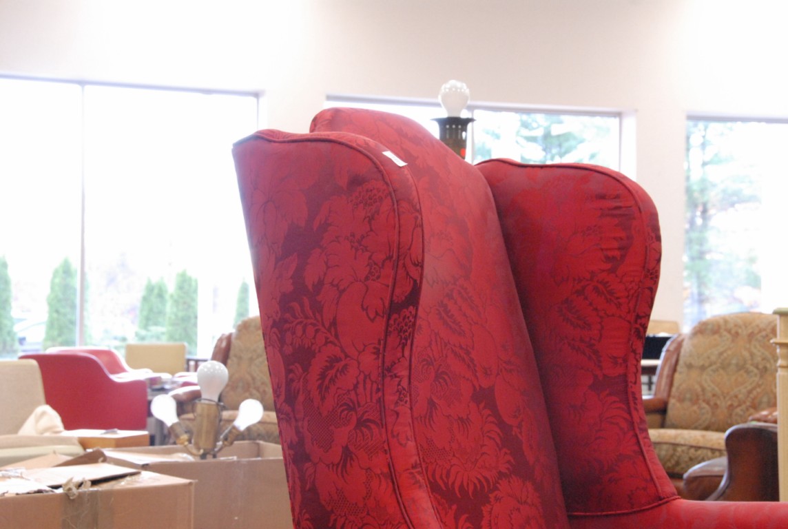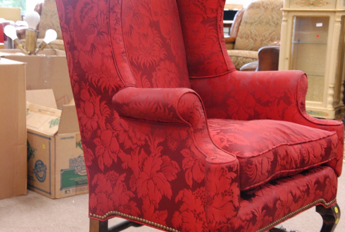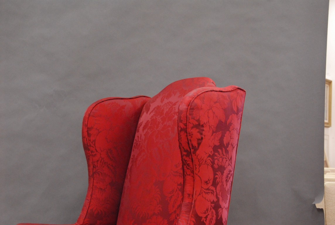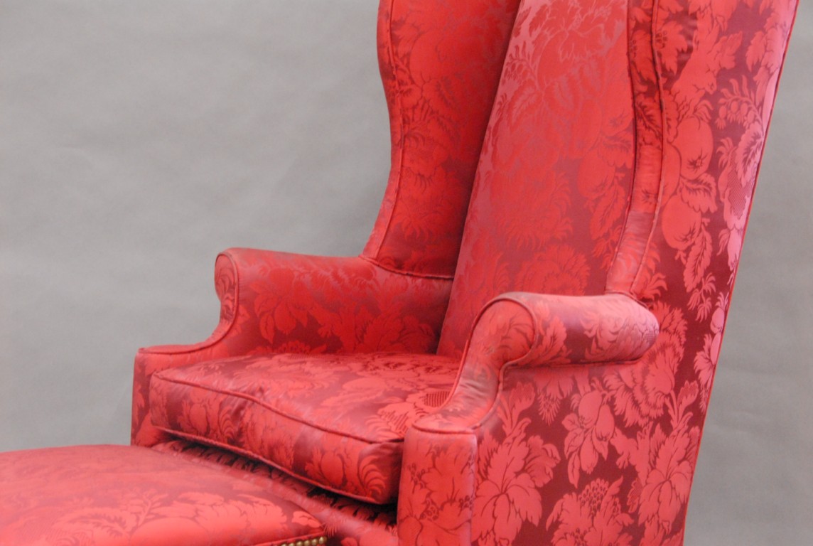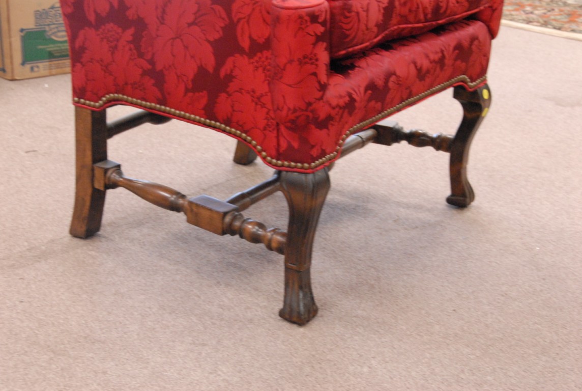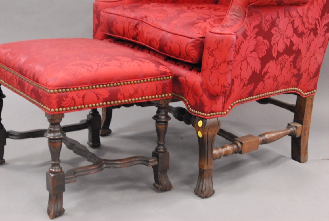 Three piece lot, a pair of William and Mary style wing chairs with Spanish feet and a footstool
