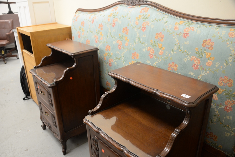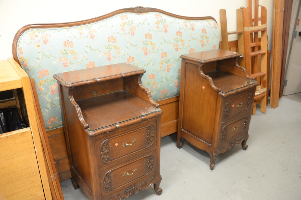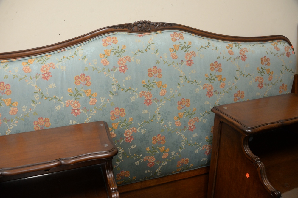 Three Piece Lot to include, upholstered king size headboard along with a pair of two drawer night stands, headboard height 57 inches, length 80 inches.