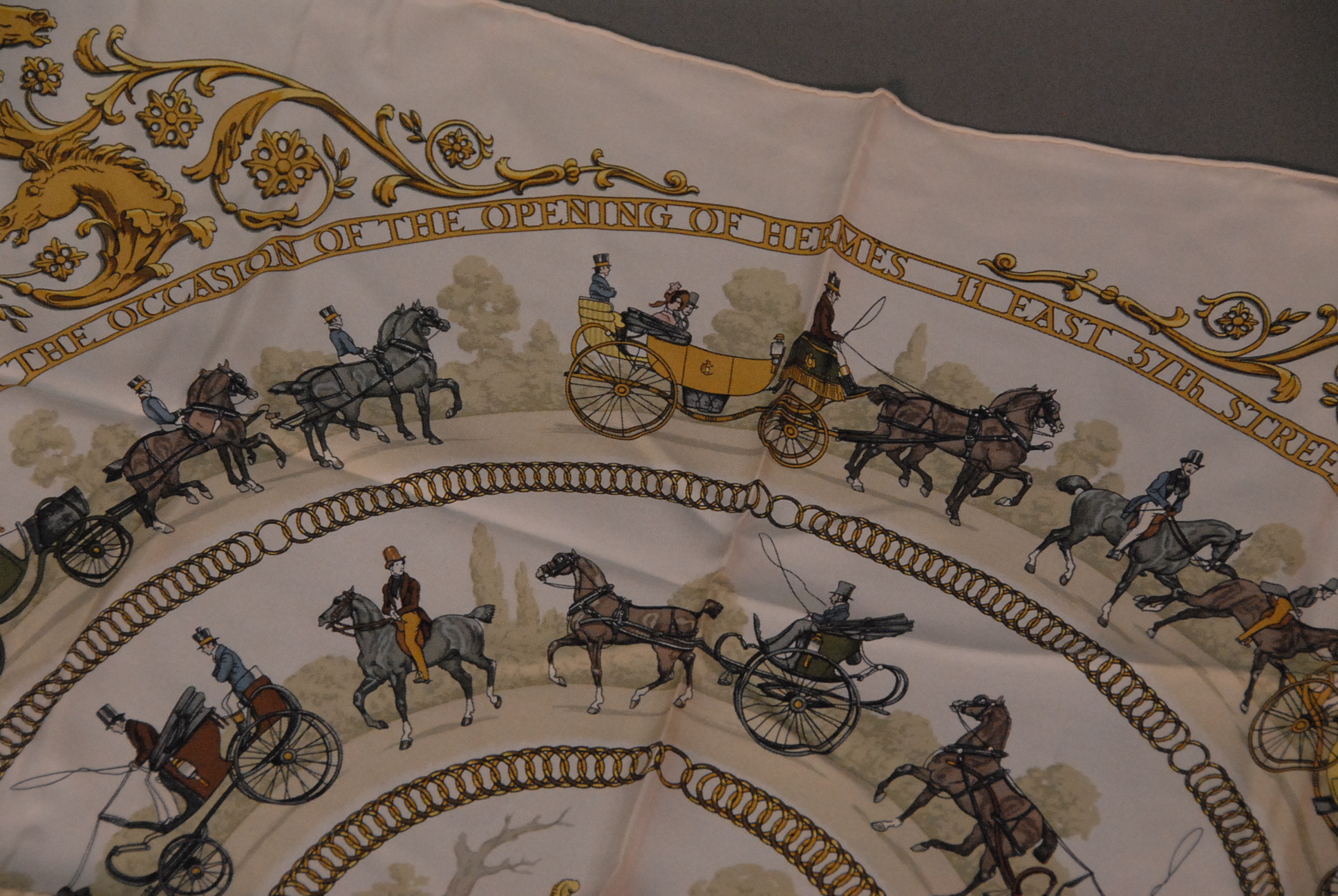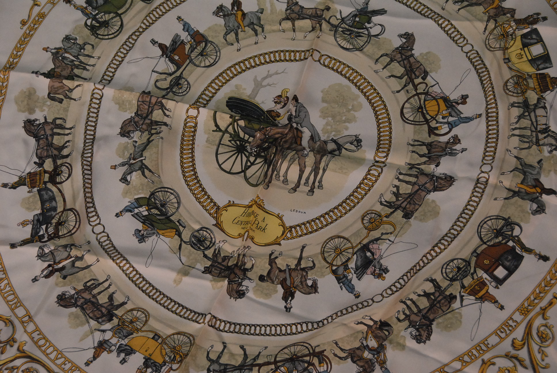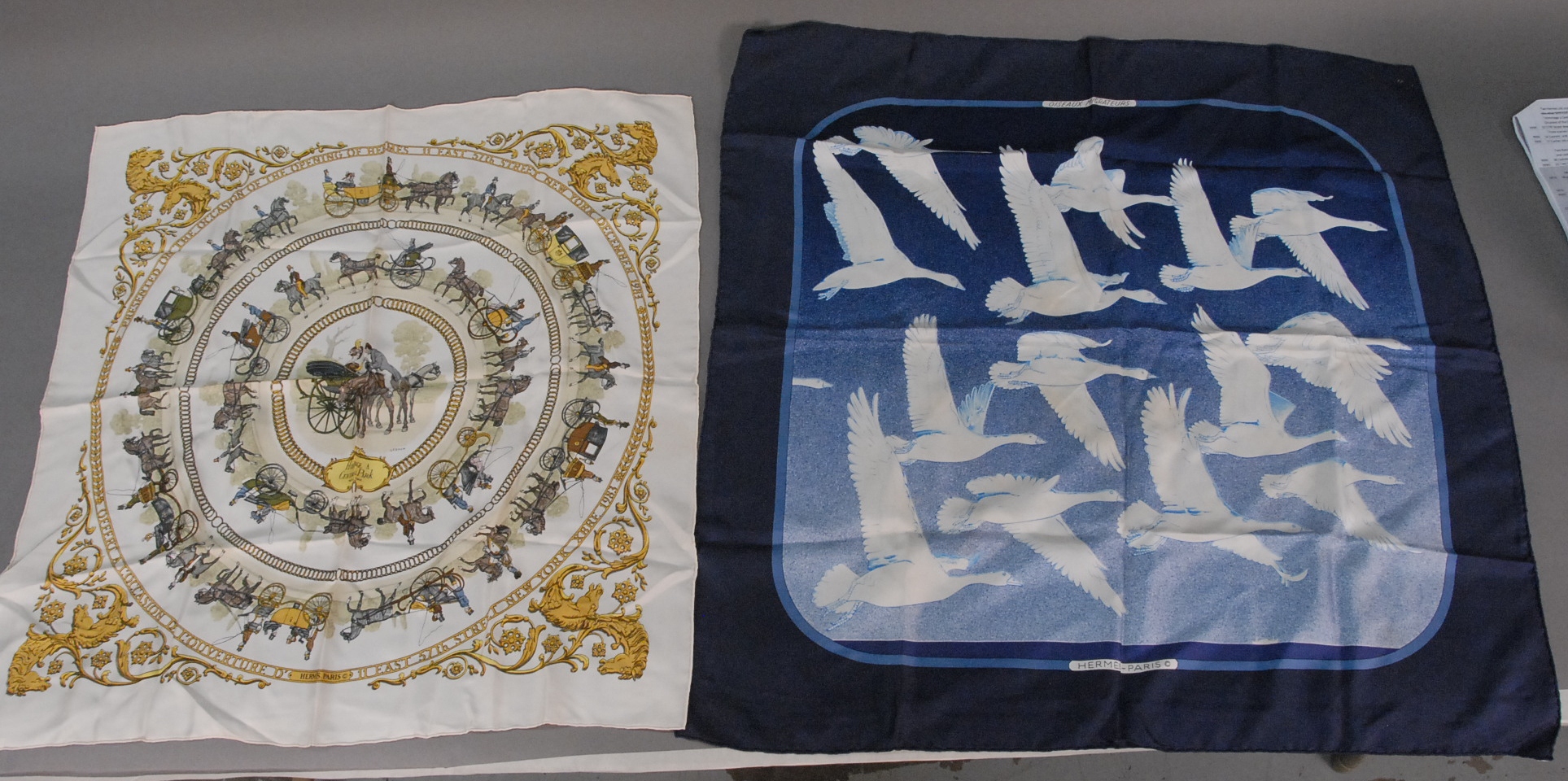 Lot 55: Two Hermes silk scarves, Oiseaux Migrateurs and Hommage a Central Park Presented on the Occasion of the Opening of Hermes, East…