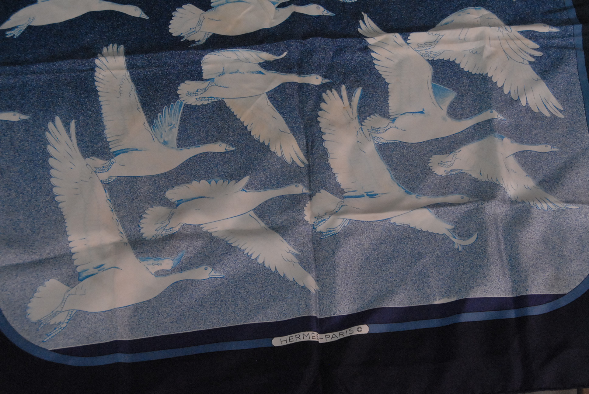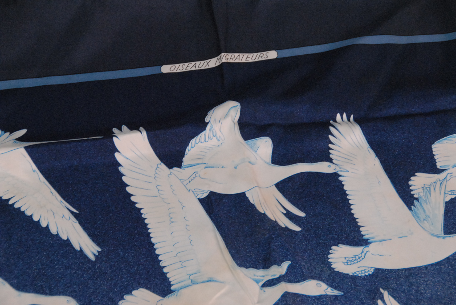 Two Hermes silk scarves, Oiseaux Migrateurs and Hommage a Central Park Presented on the Occasion of the Opening of Hermes, East 57th Street New York December 1983.