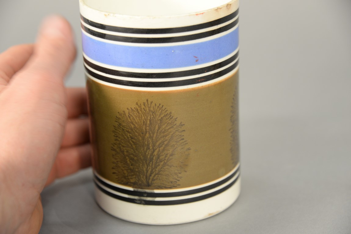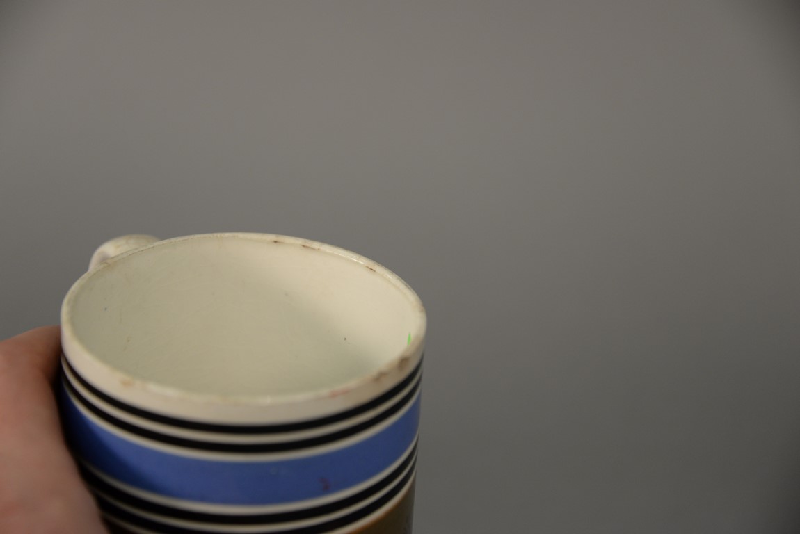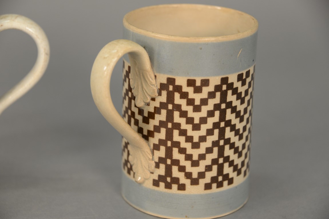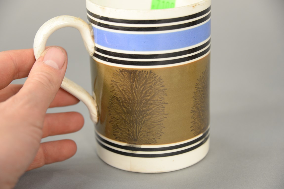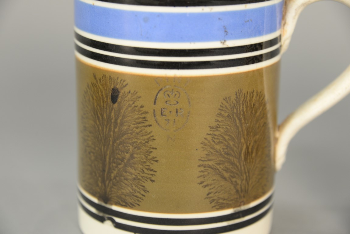 Lot 55: Two Mocha mugs with handles, one with impressed crown and E R 71 on side and painted with brown and blue bands and trees and the other with brown checkering. ht. 6 in. & ht. 5 3/4 in.