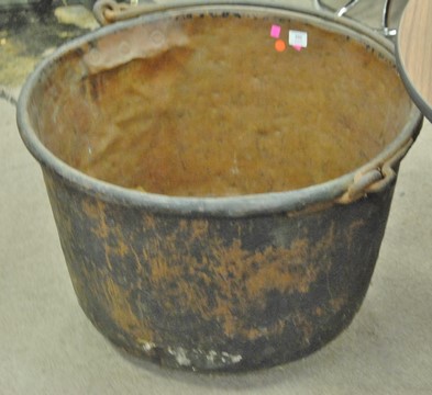Large copper pot with iron handle, dia. 28 along with two Victorian lamps.