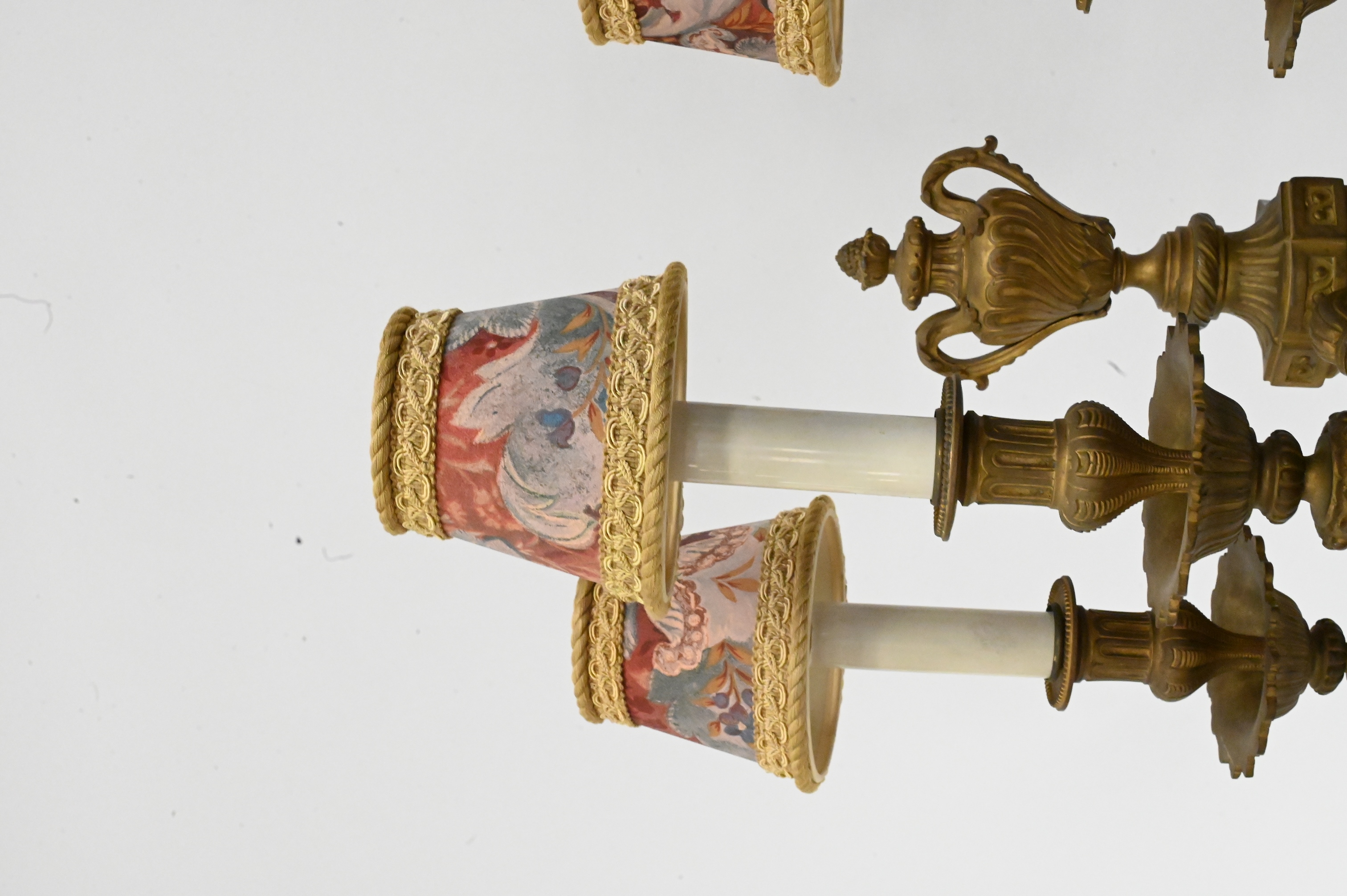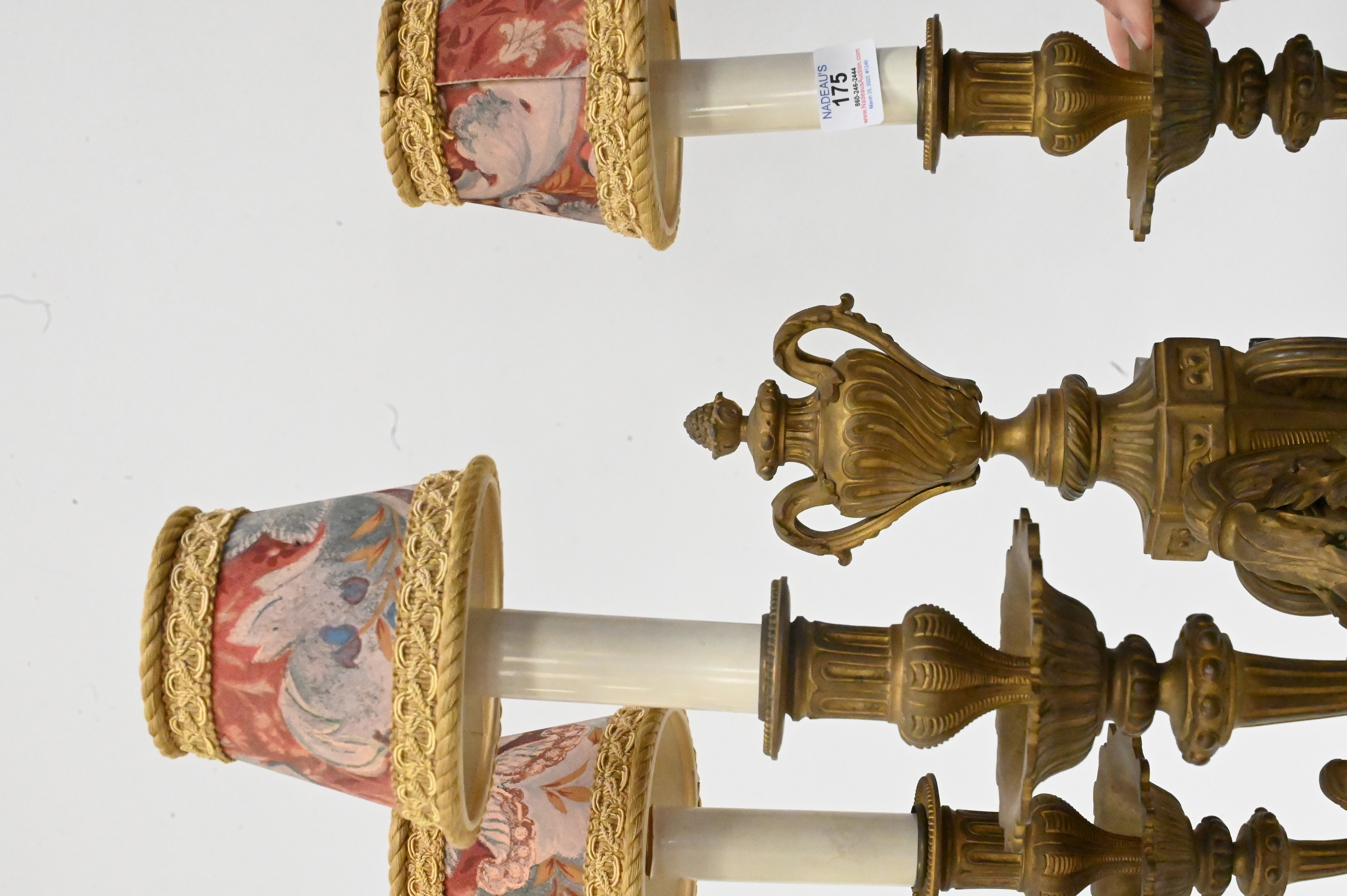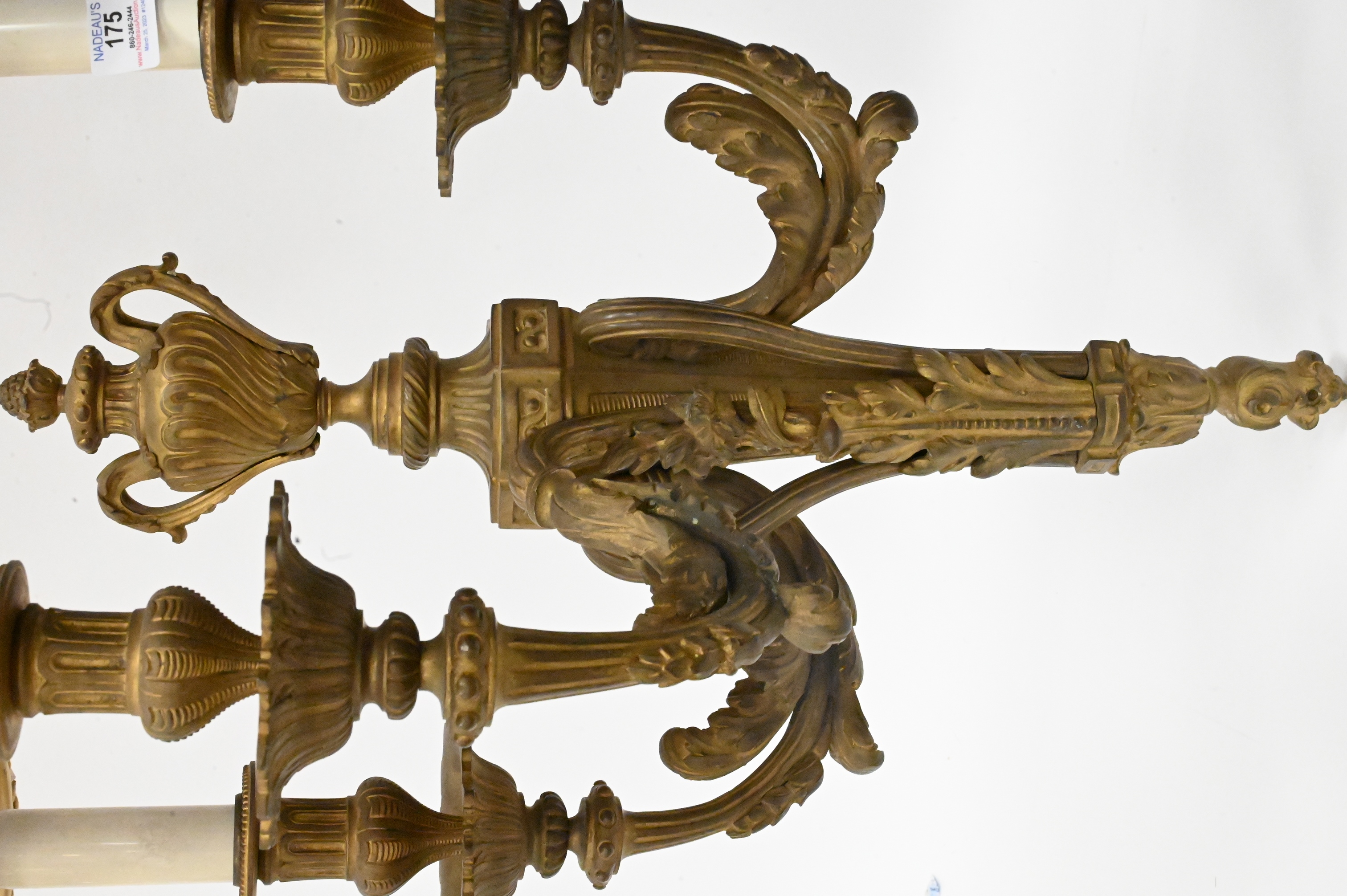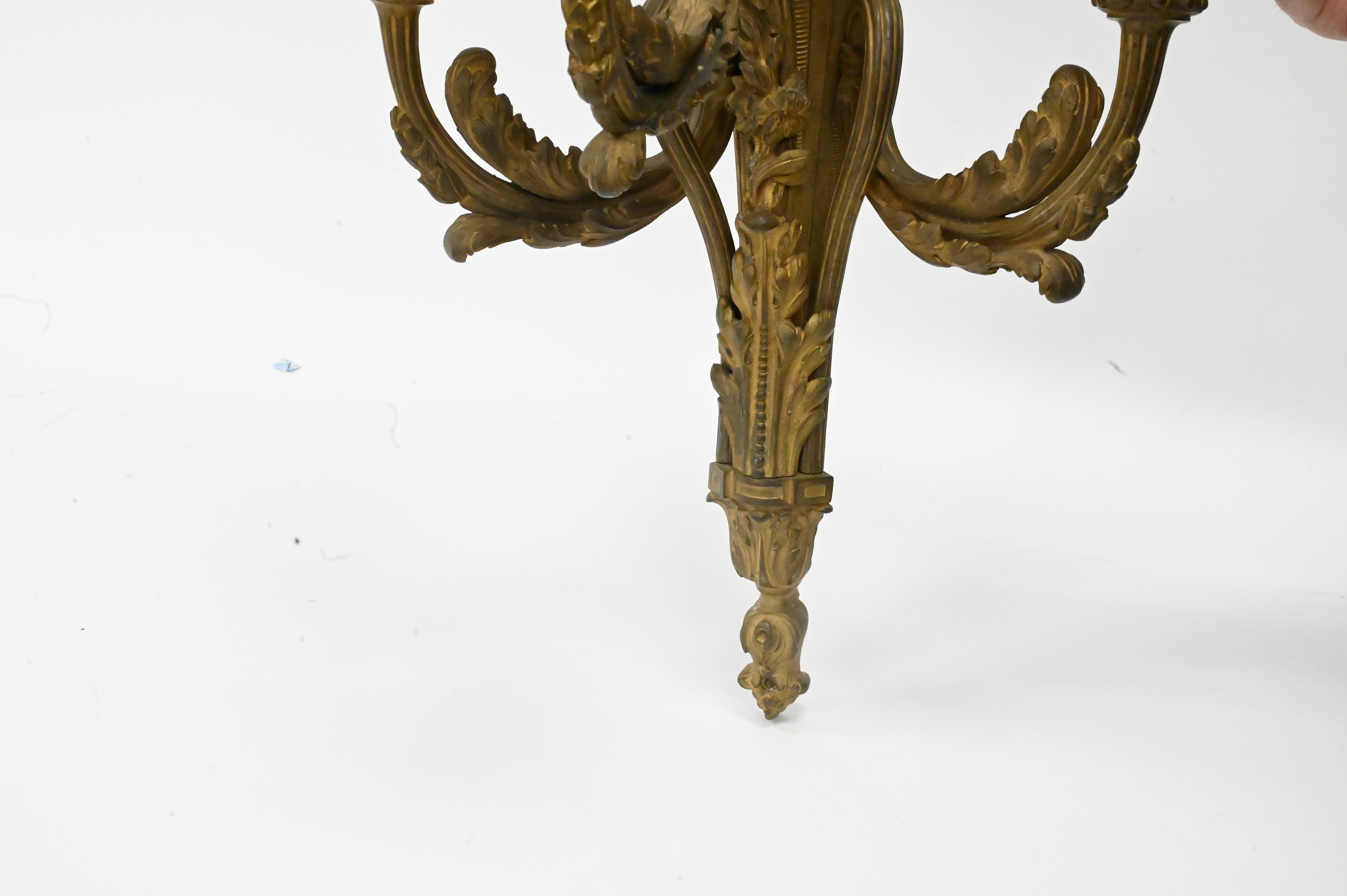 Large French Bronze Wall Sconce, Louis XVI style, having torch form back plate along with three scrolling arms, electrified