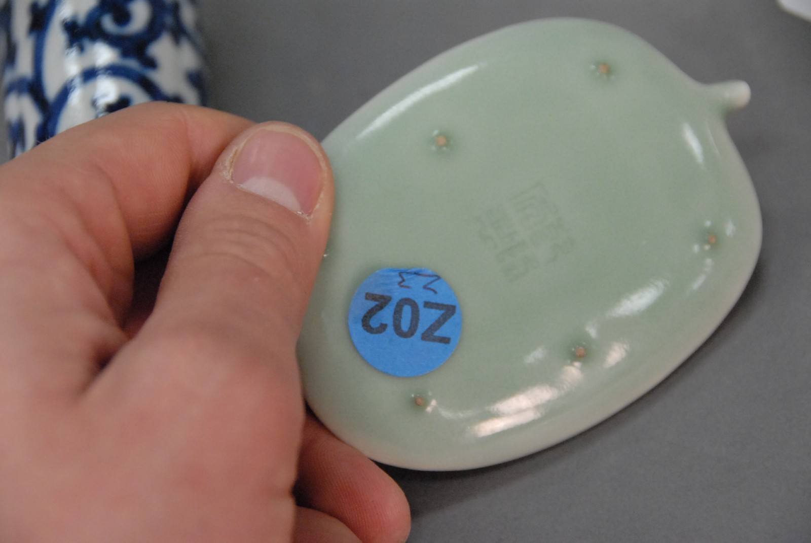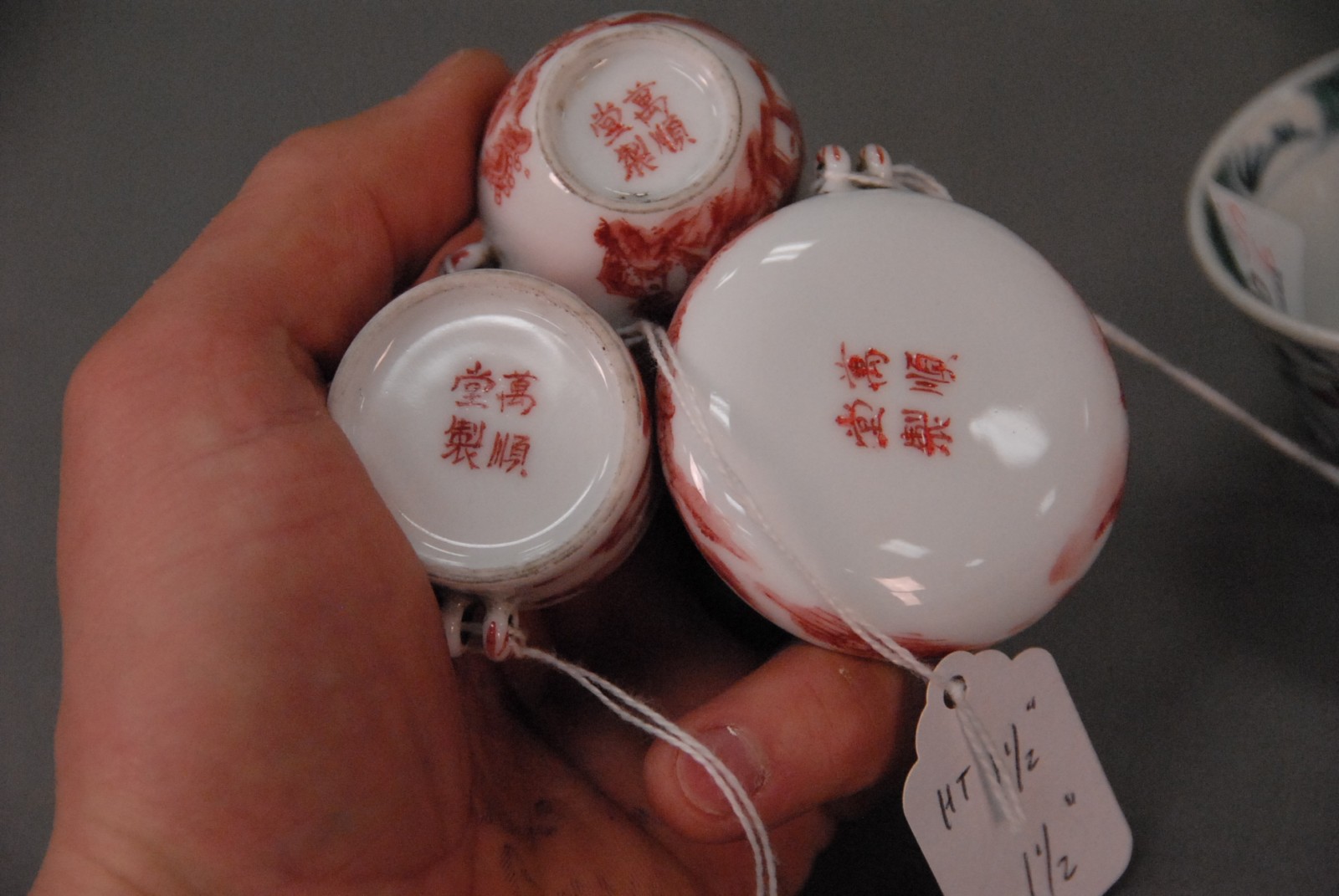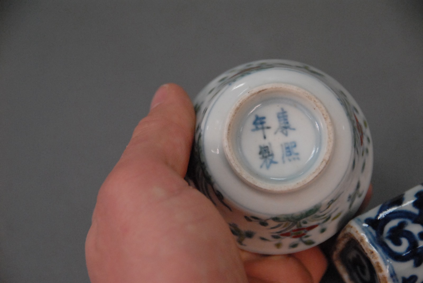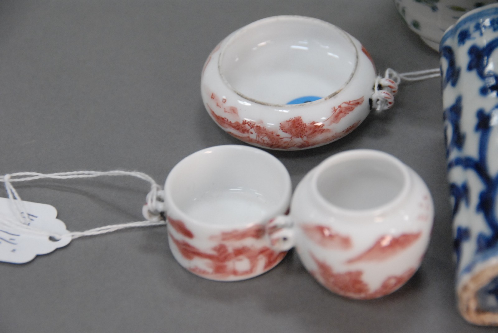 Six Chinese porcelain articles: four bird feeders, a miniature doucai bowl with spurious Kangxi mark and a small celadon in the form of an ink stone with an impressed Qianlong mark, 19C