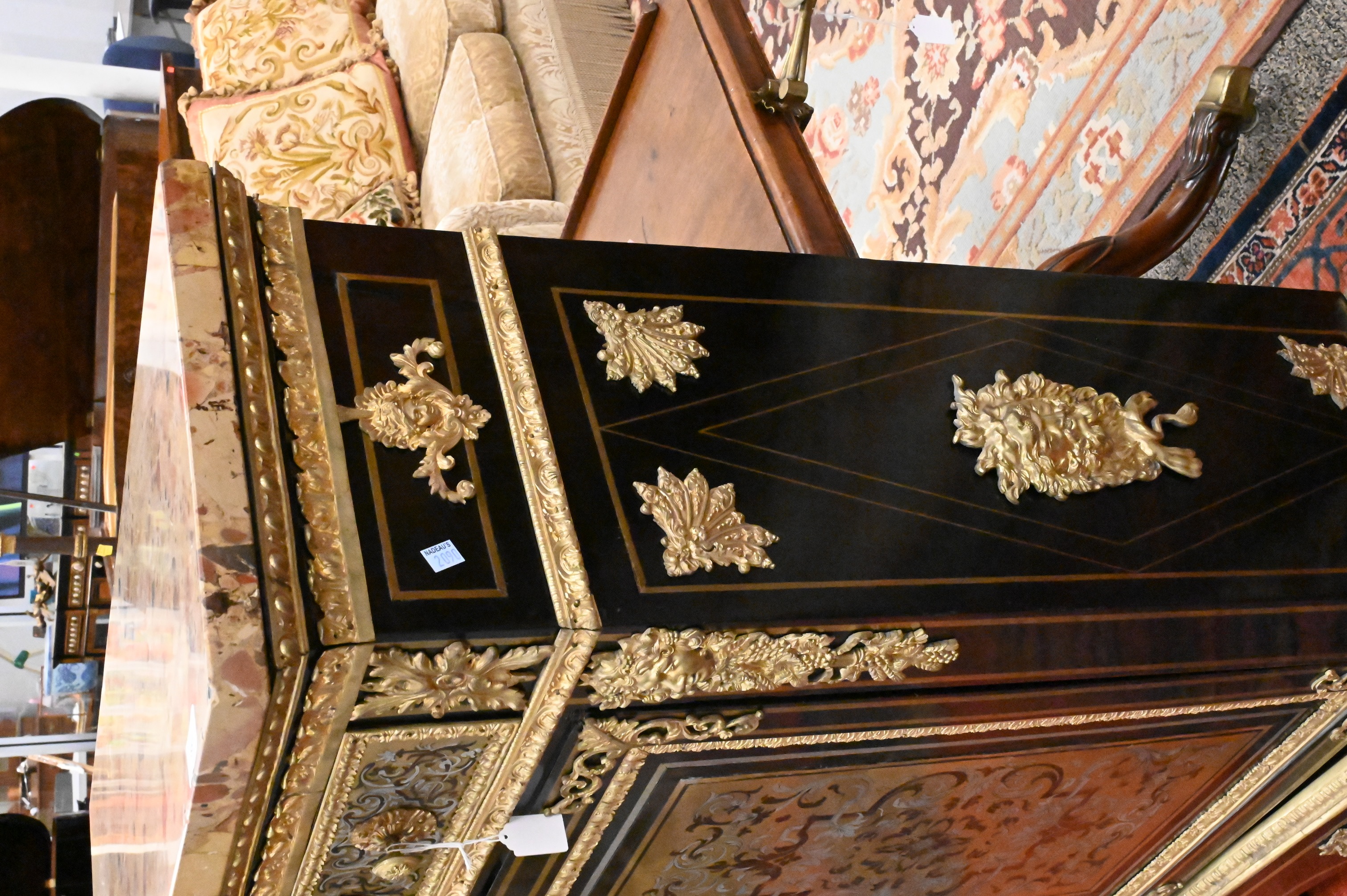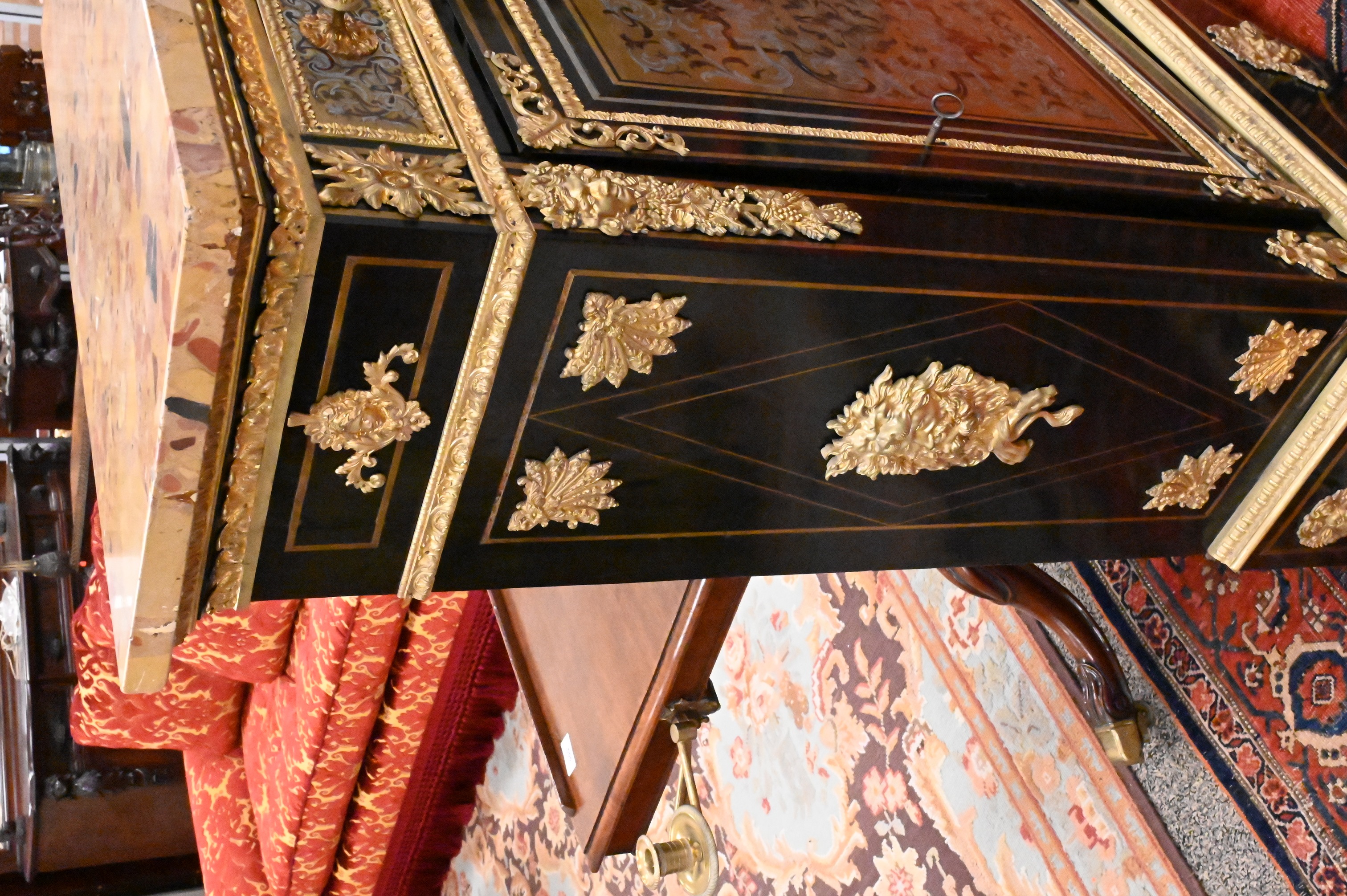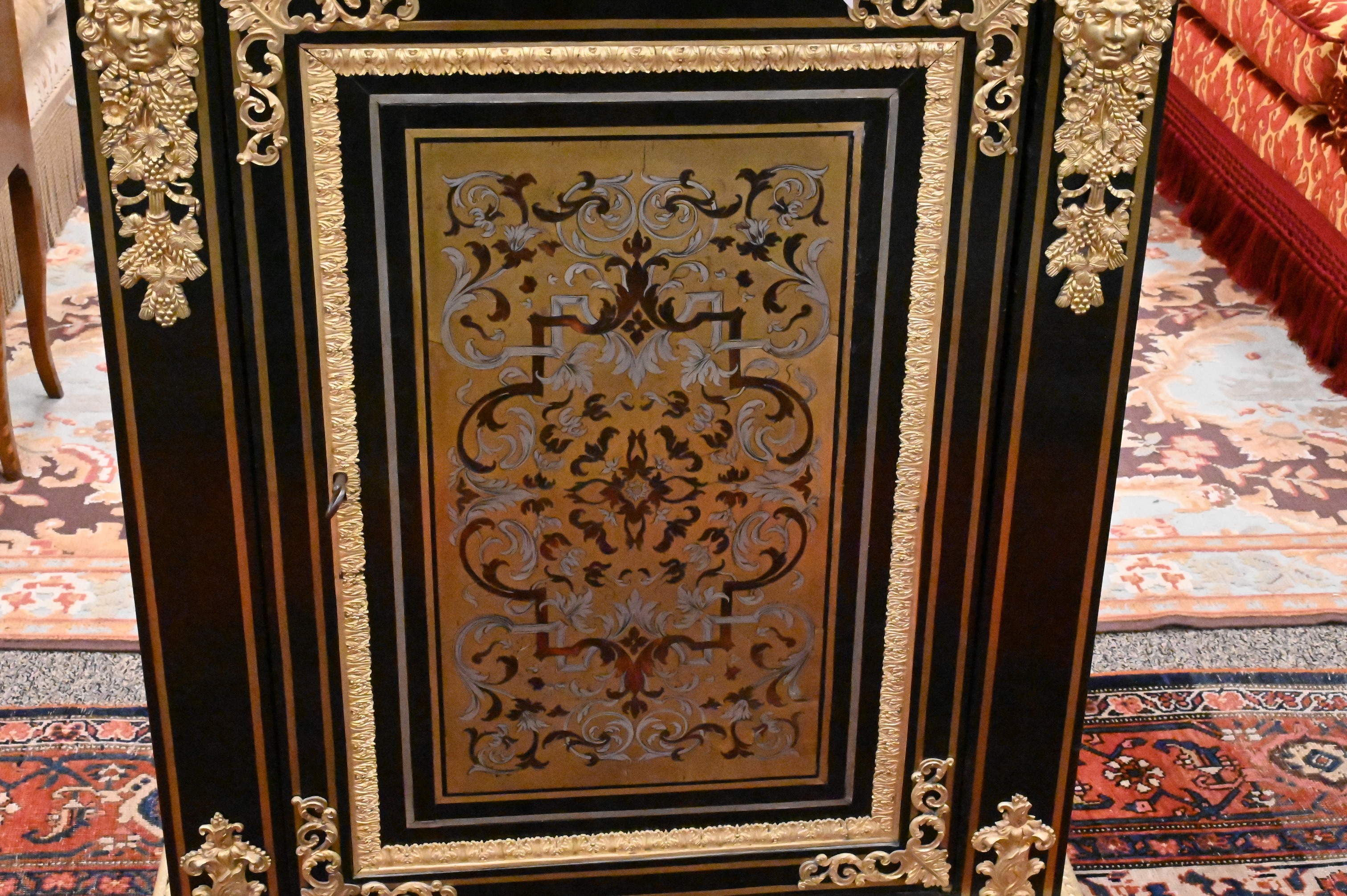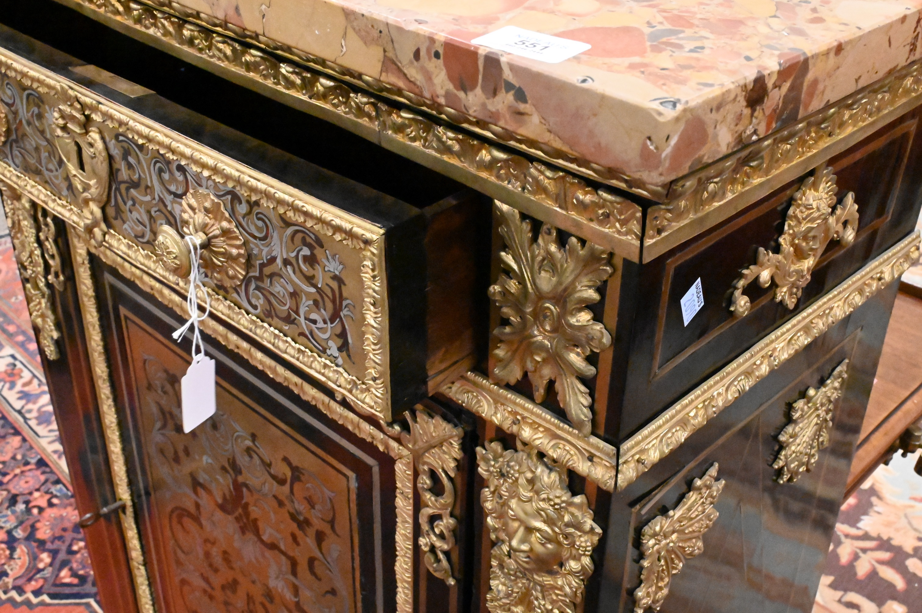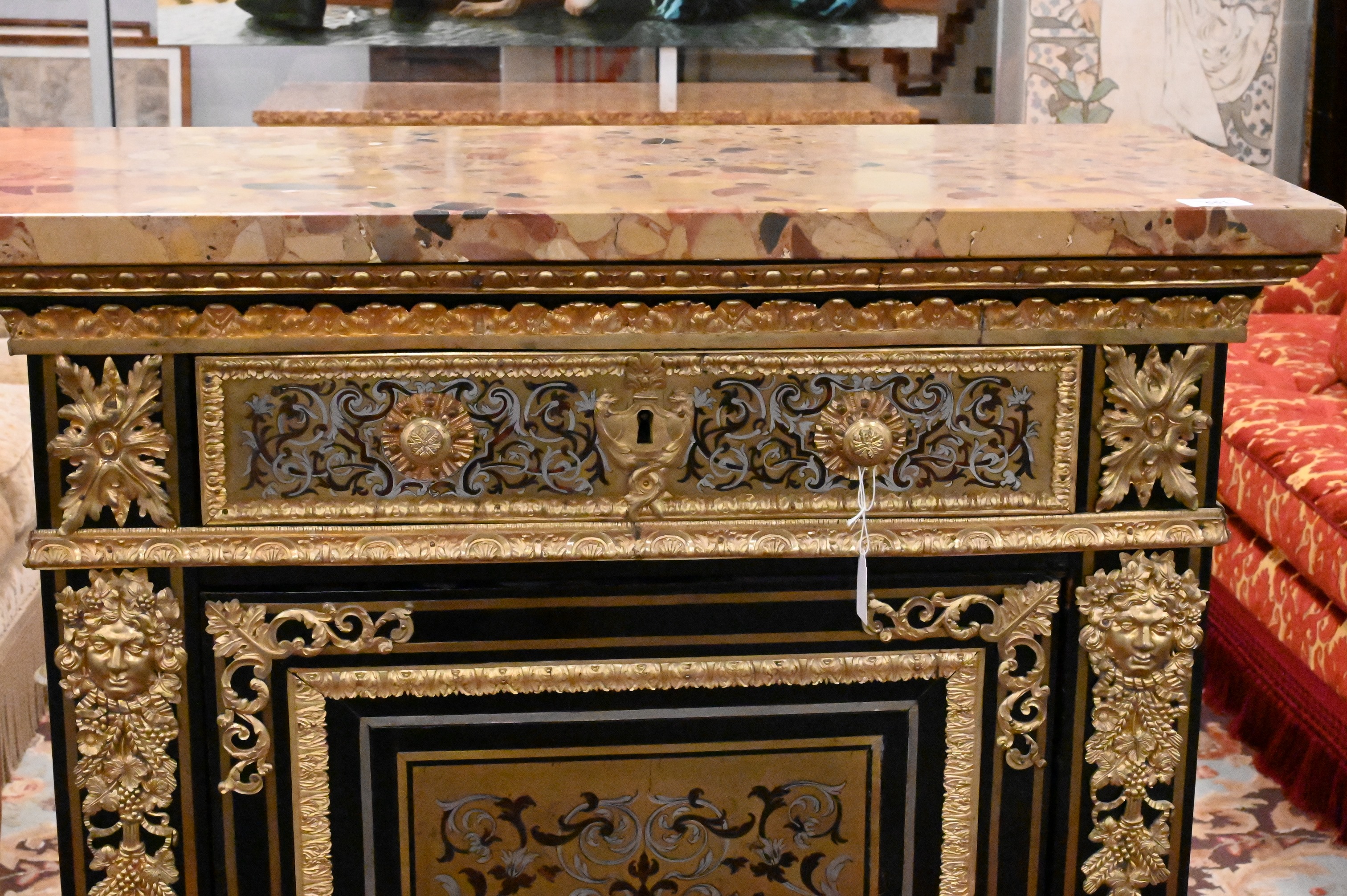having gilt bronze mounts and Breche D’Alep marble top over drawer and door, gilt bronze lion masks on sides, 19th century