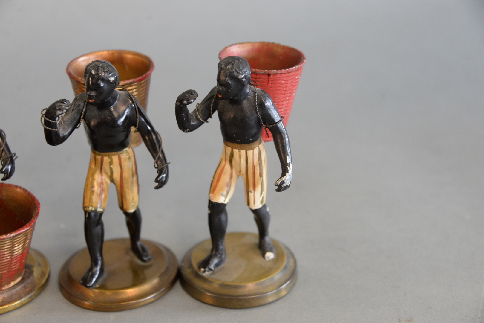 Lot 551: Four Blackamoor Figures carrying baskets to be toothpick holders, one missing a left arm height 4 1/2 inches Provenance: The Gloria…