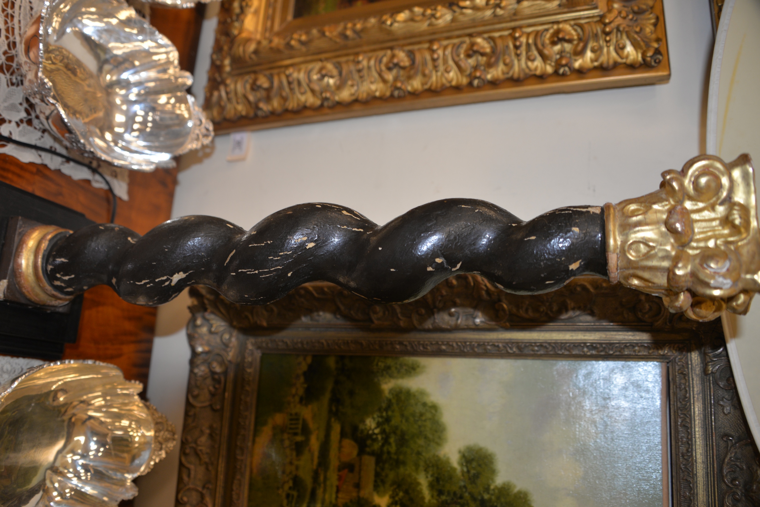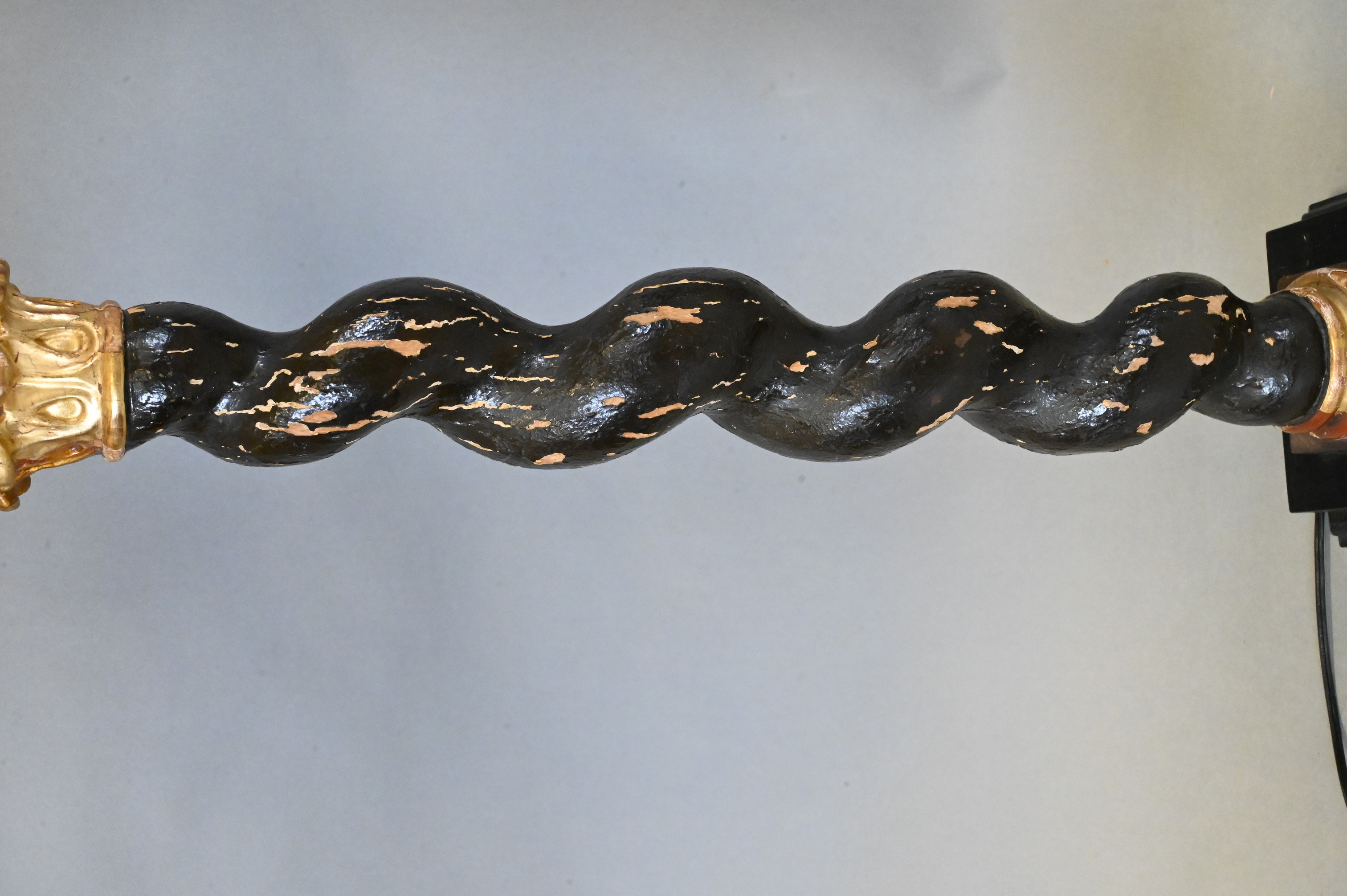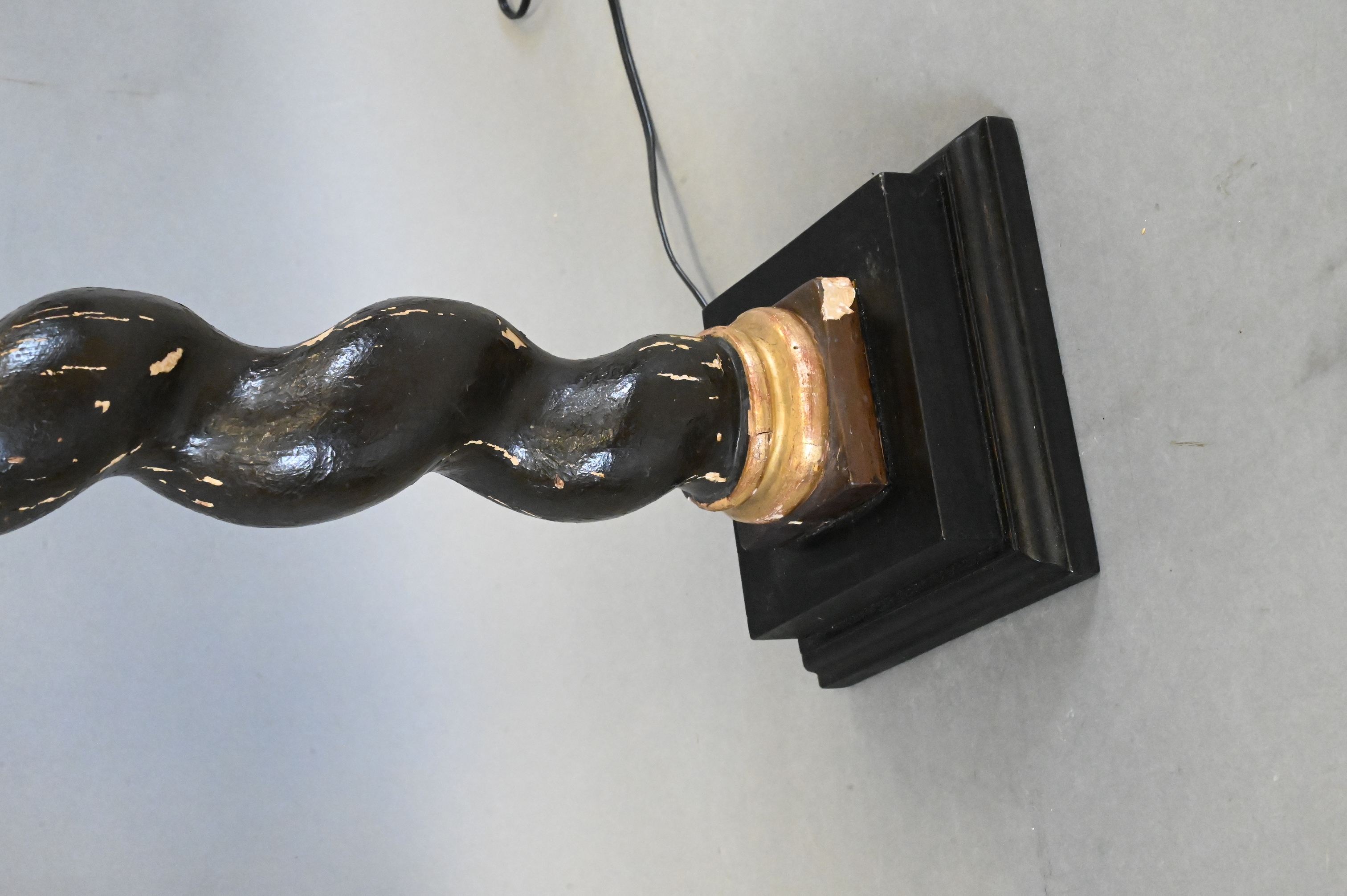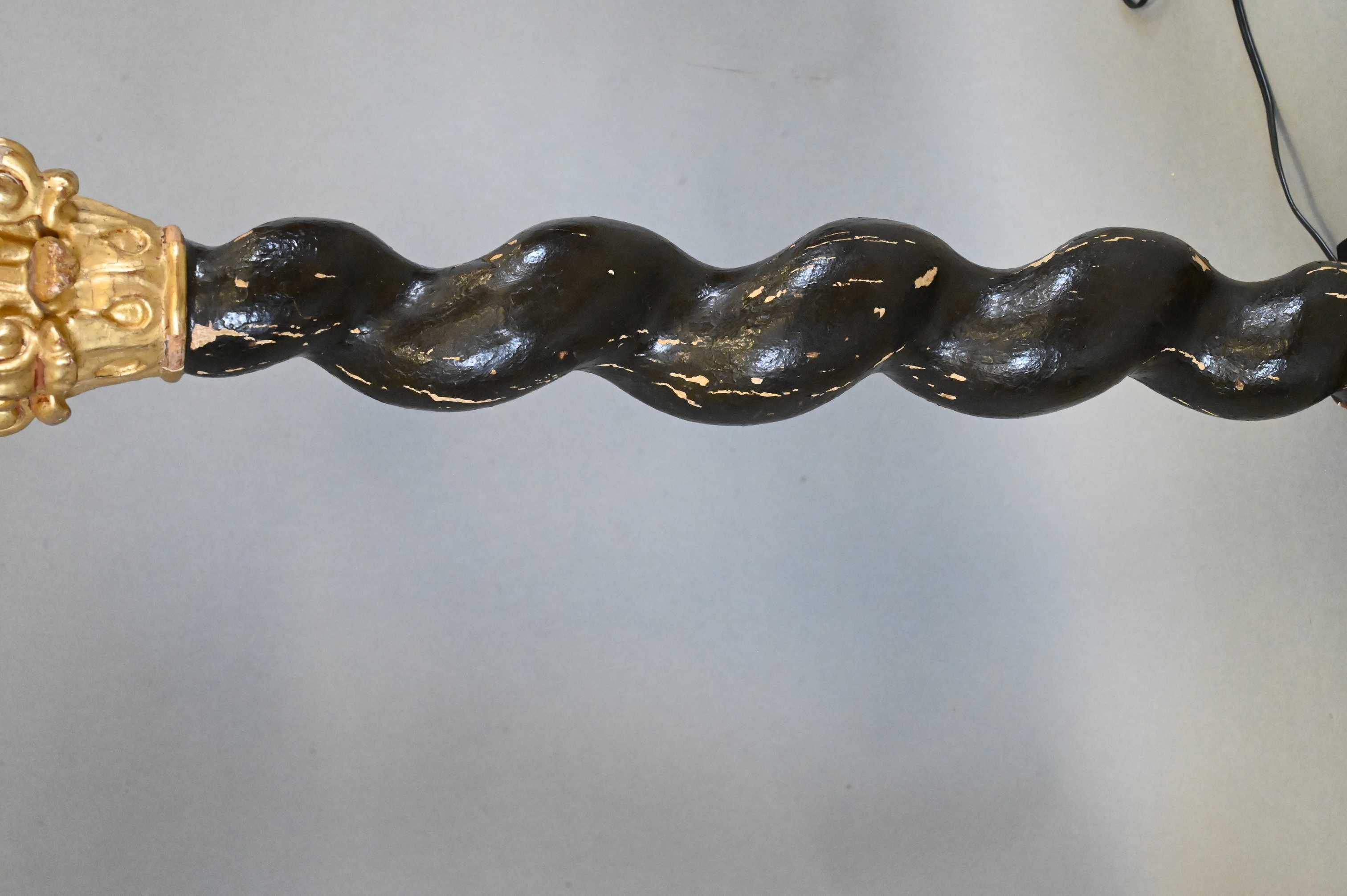 having black painted twisted column body surmounted by gilt corinthian capital, set on stepped pedestal base