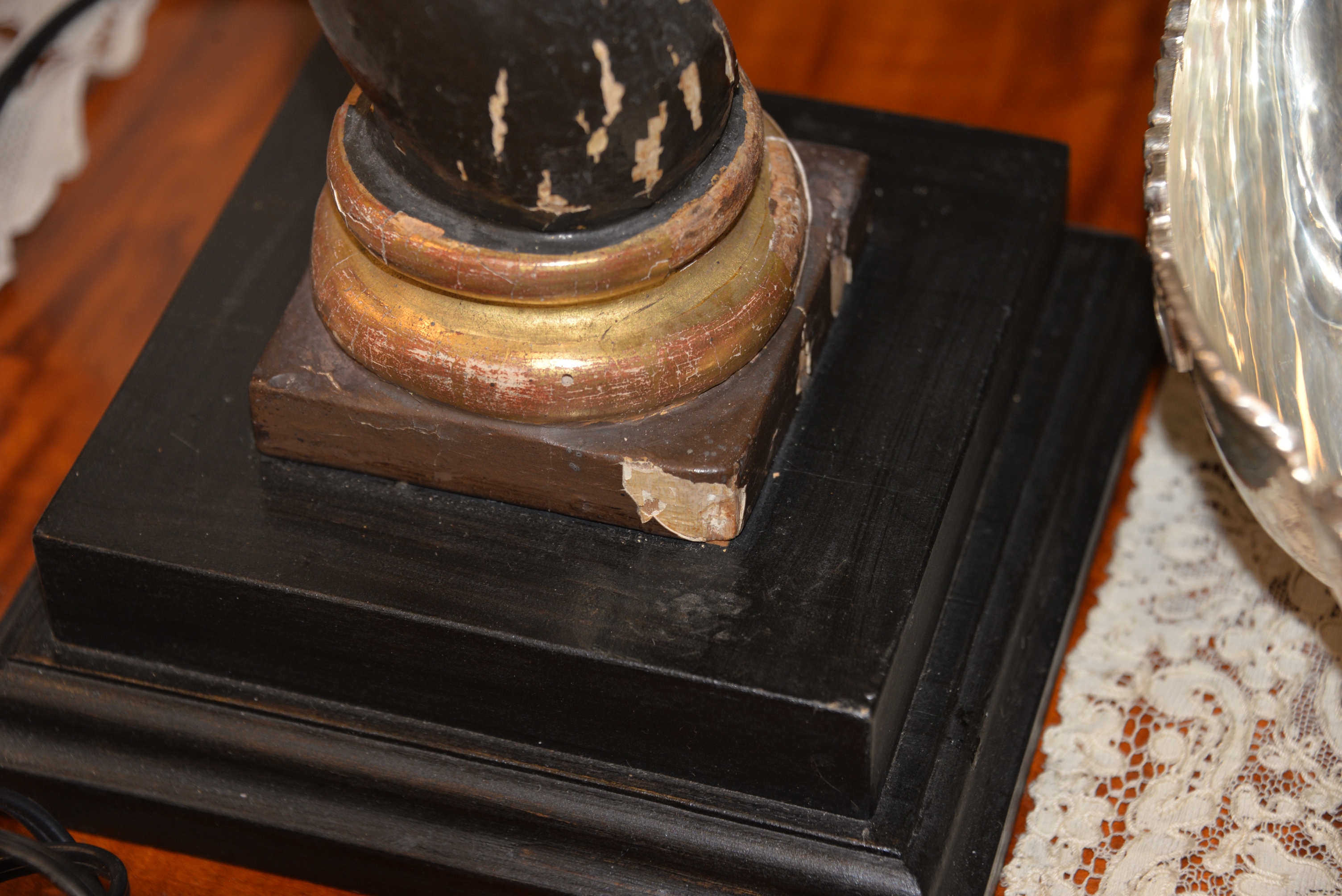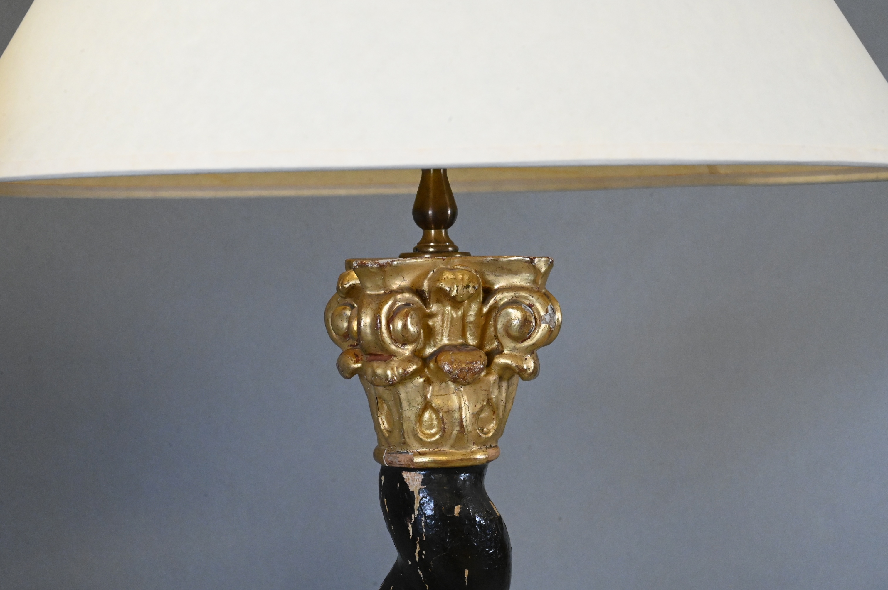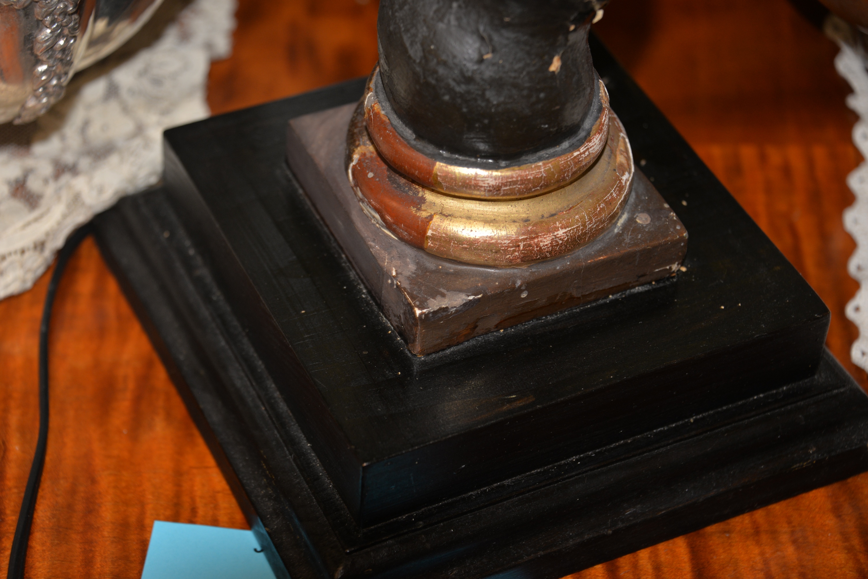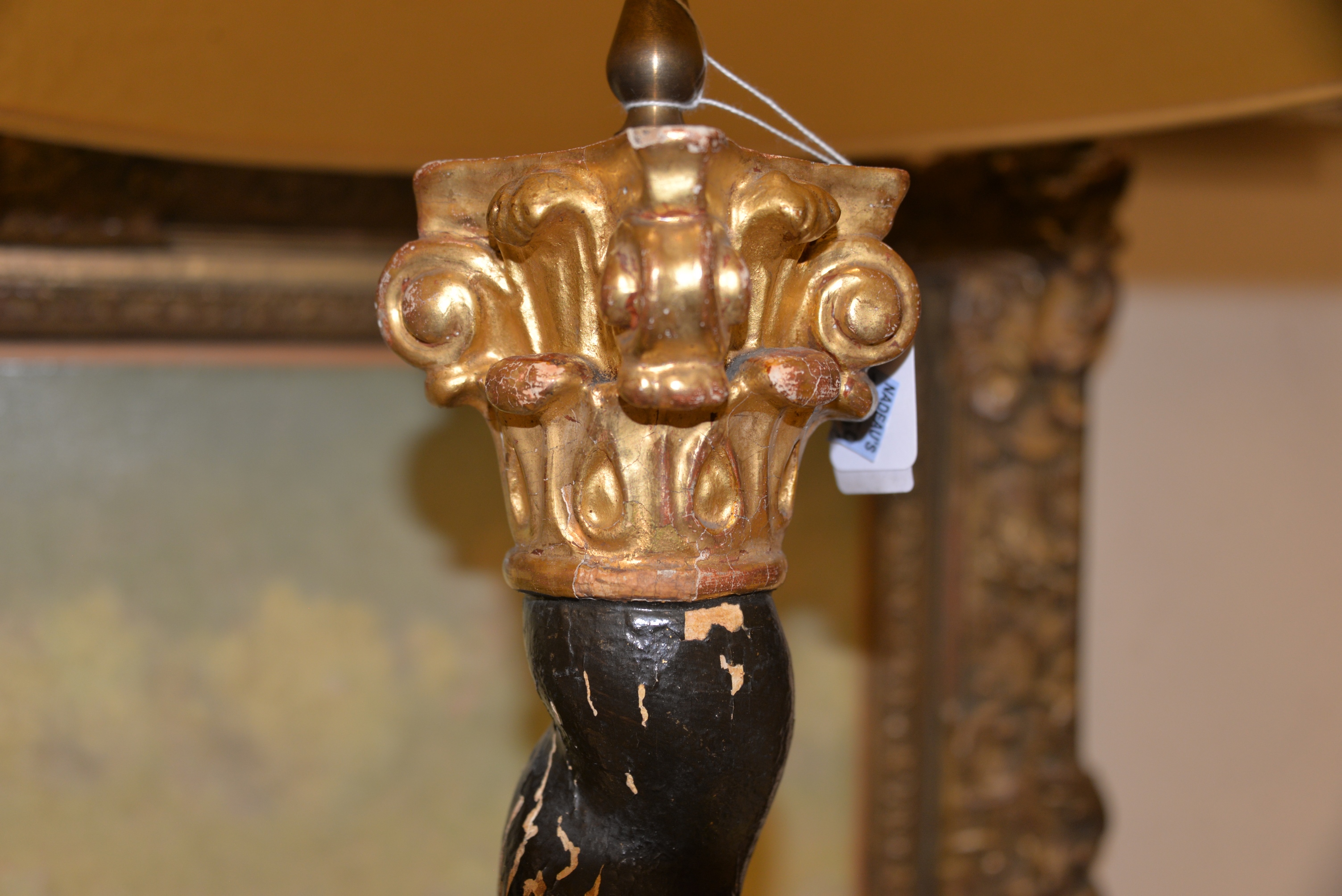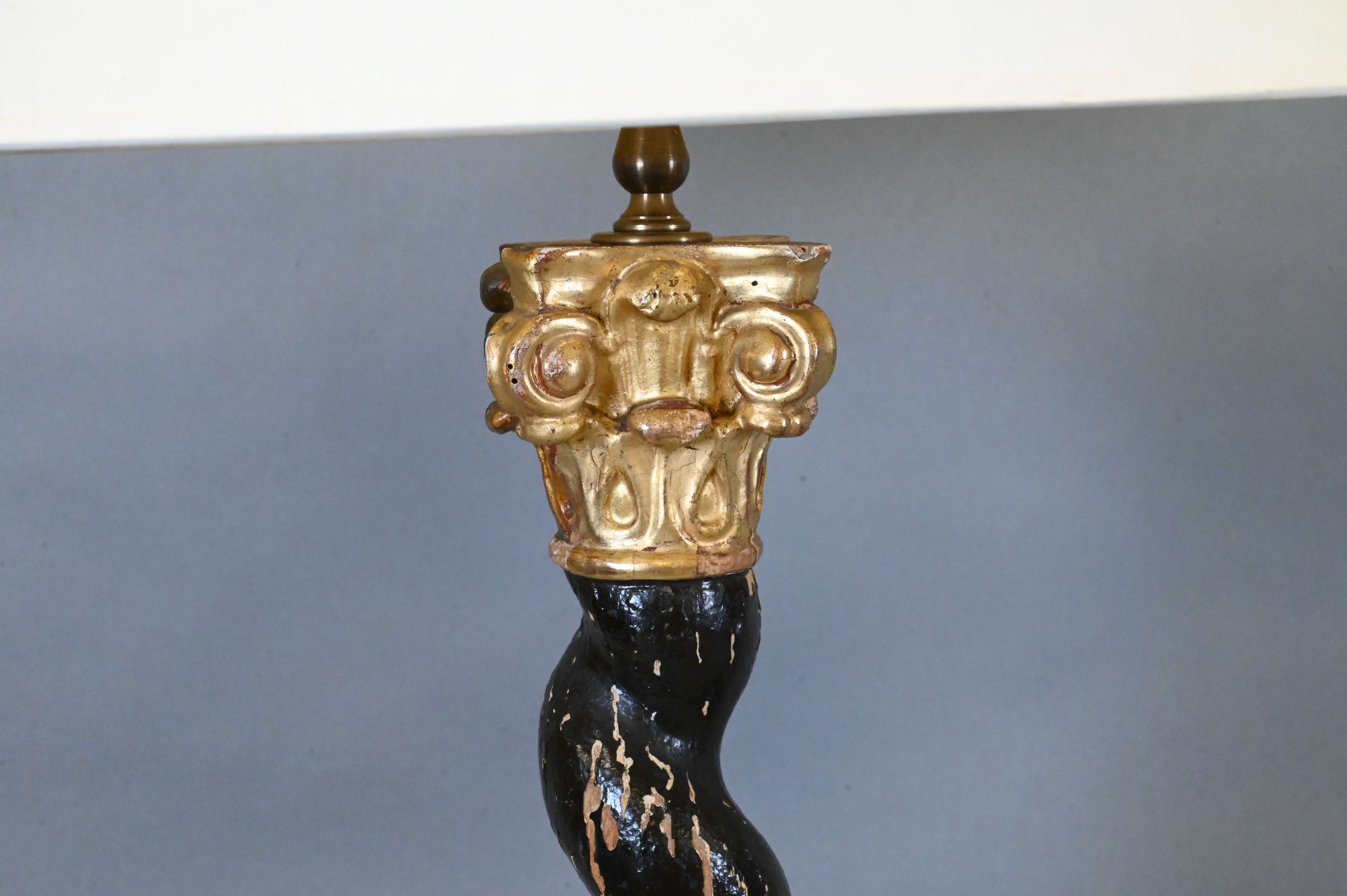 having black painted twisted column body surmounted by gilt corinthian capital, set on stepped pedestal base