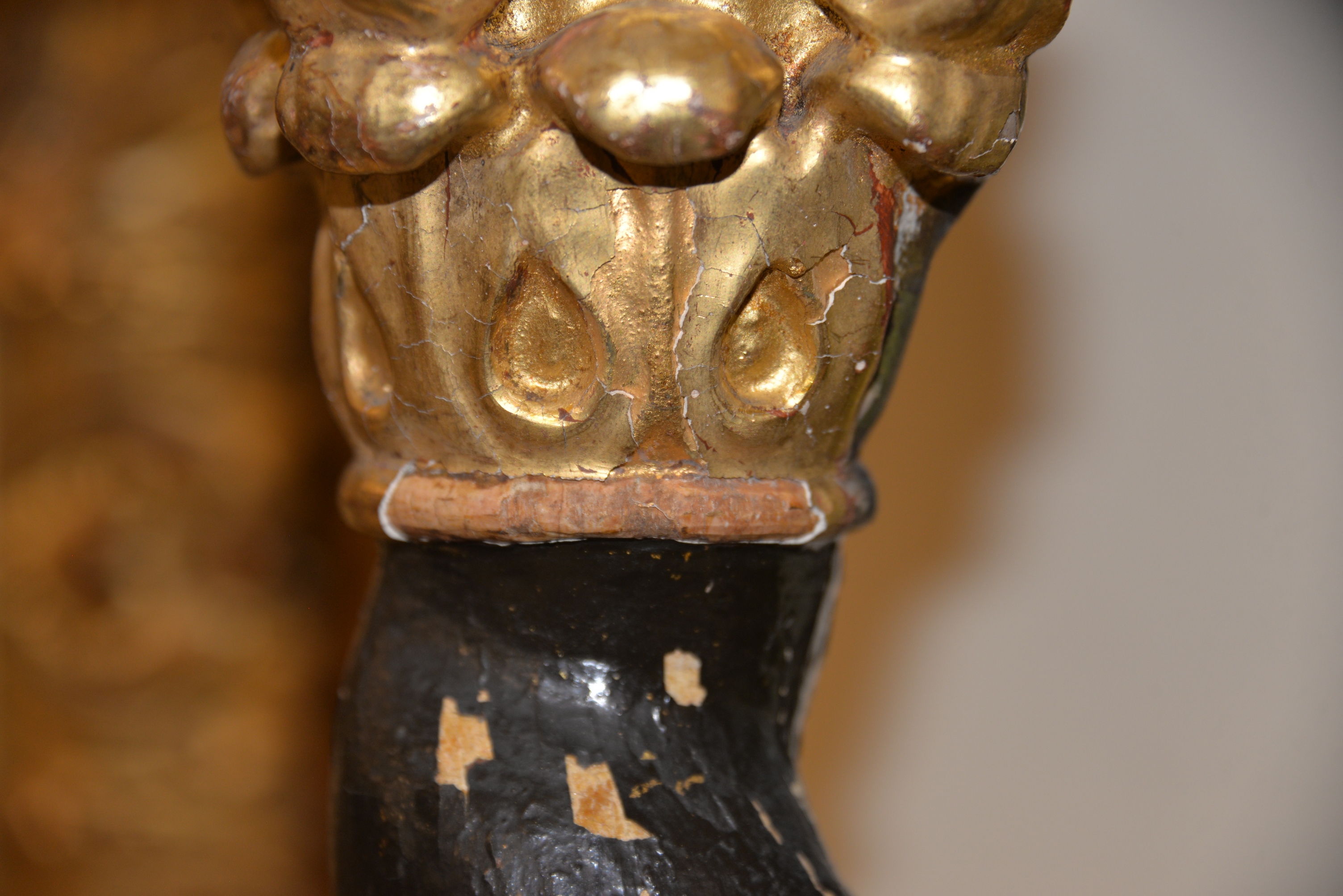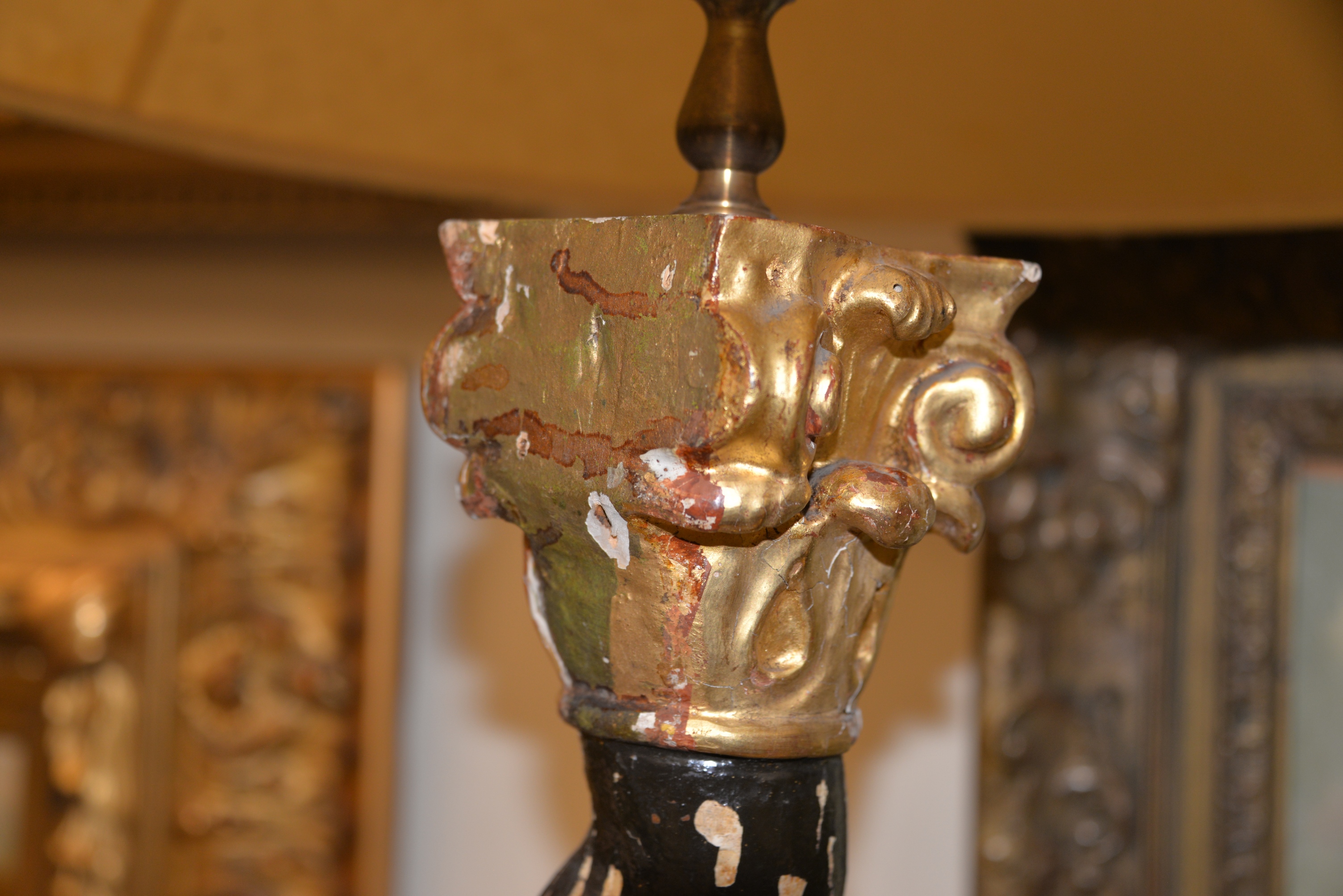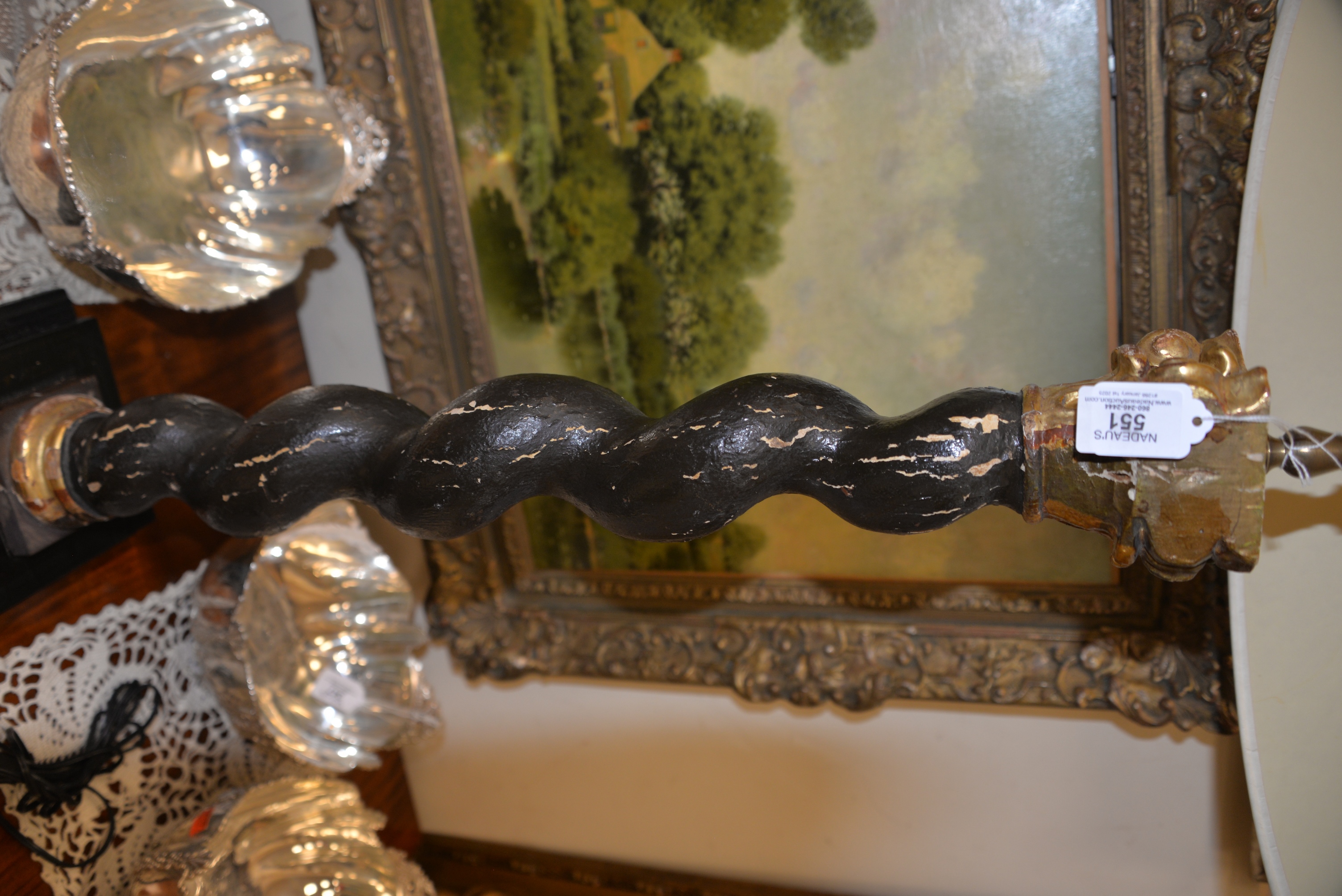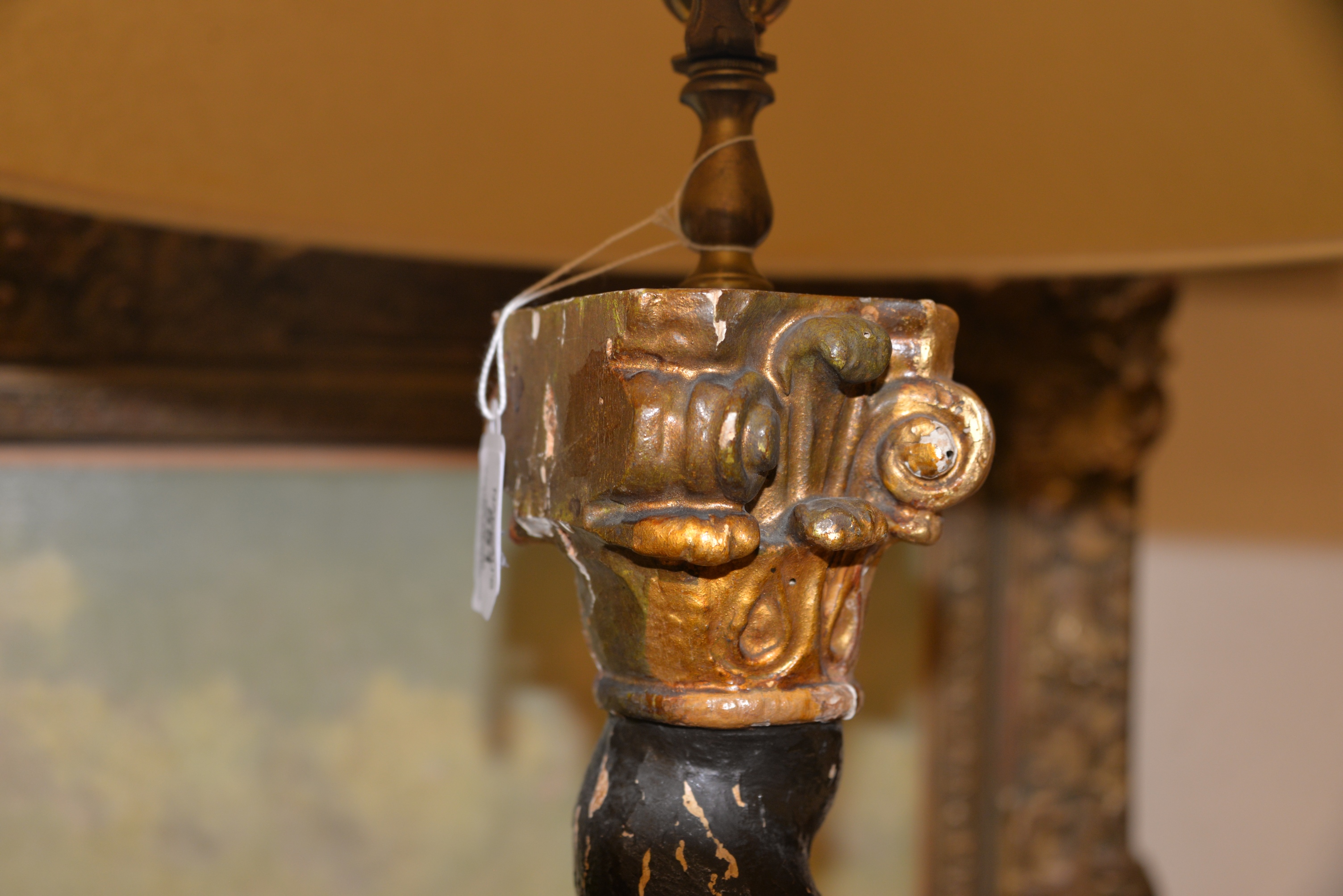 having black painted twisted column body surmounted by gilt corinthian capital, set on stepped pedestal base