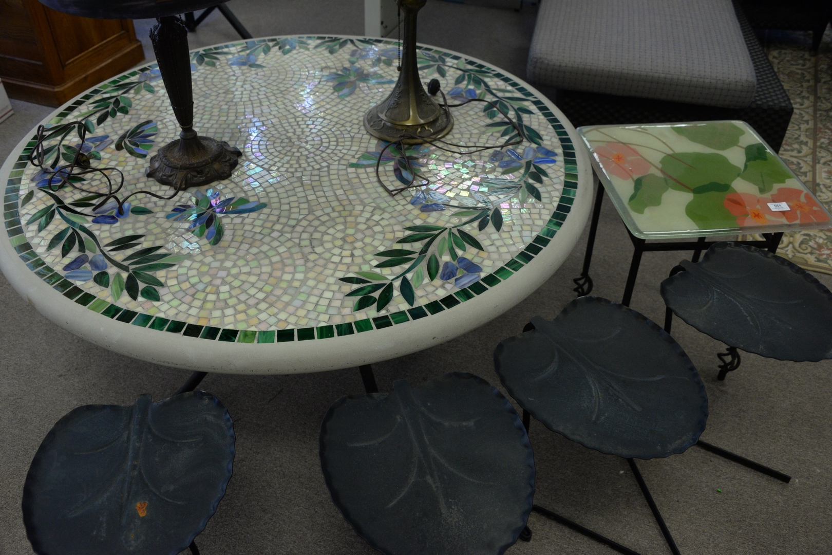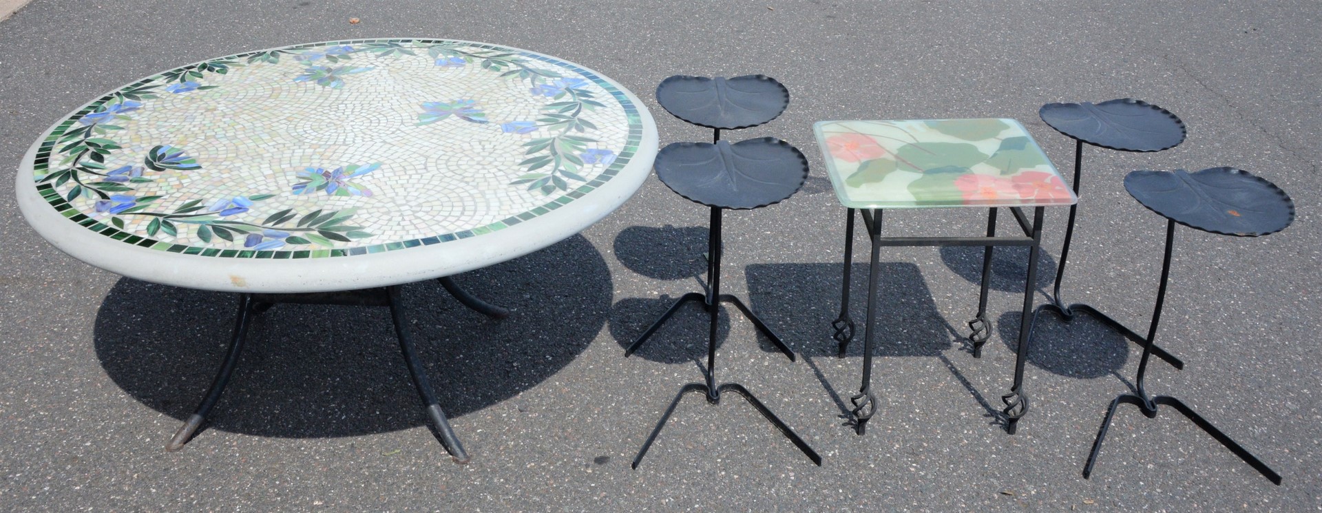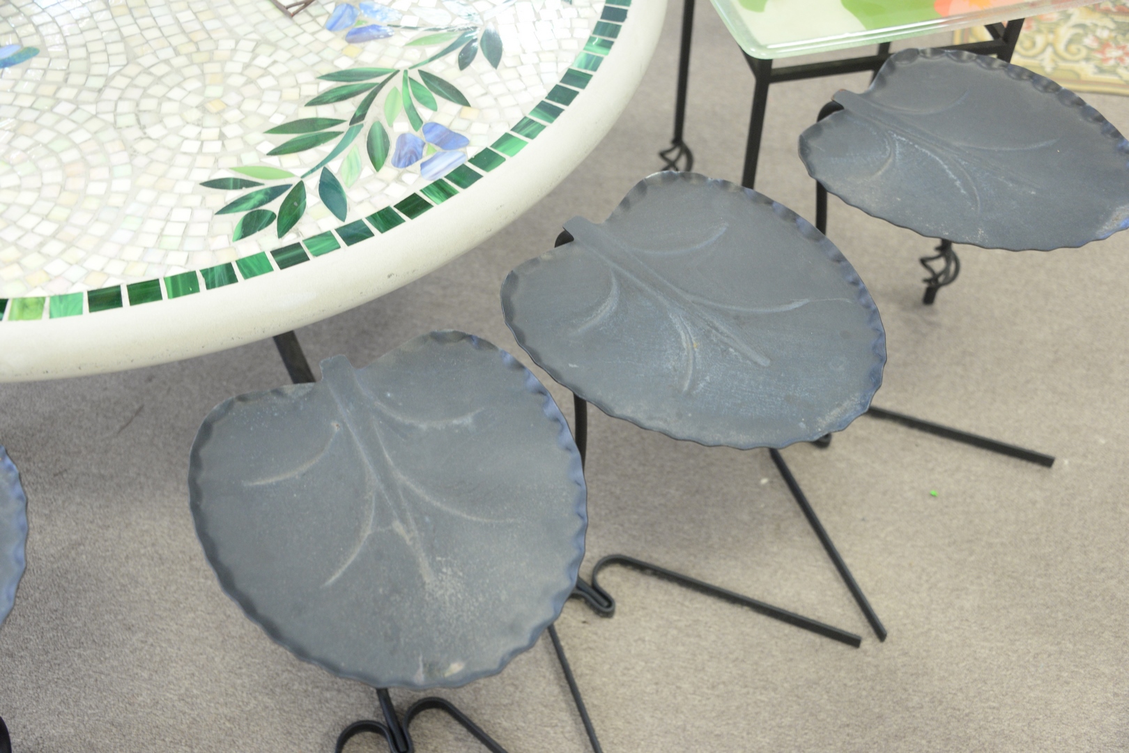 Six Piece Outdoor Lot to include tile top coffee table having iron base, four matching leaf form side tables, and a glass top side table, diameter 48 inches.