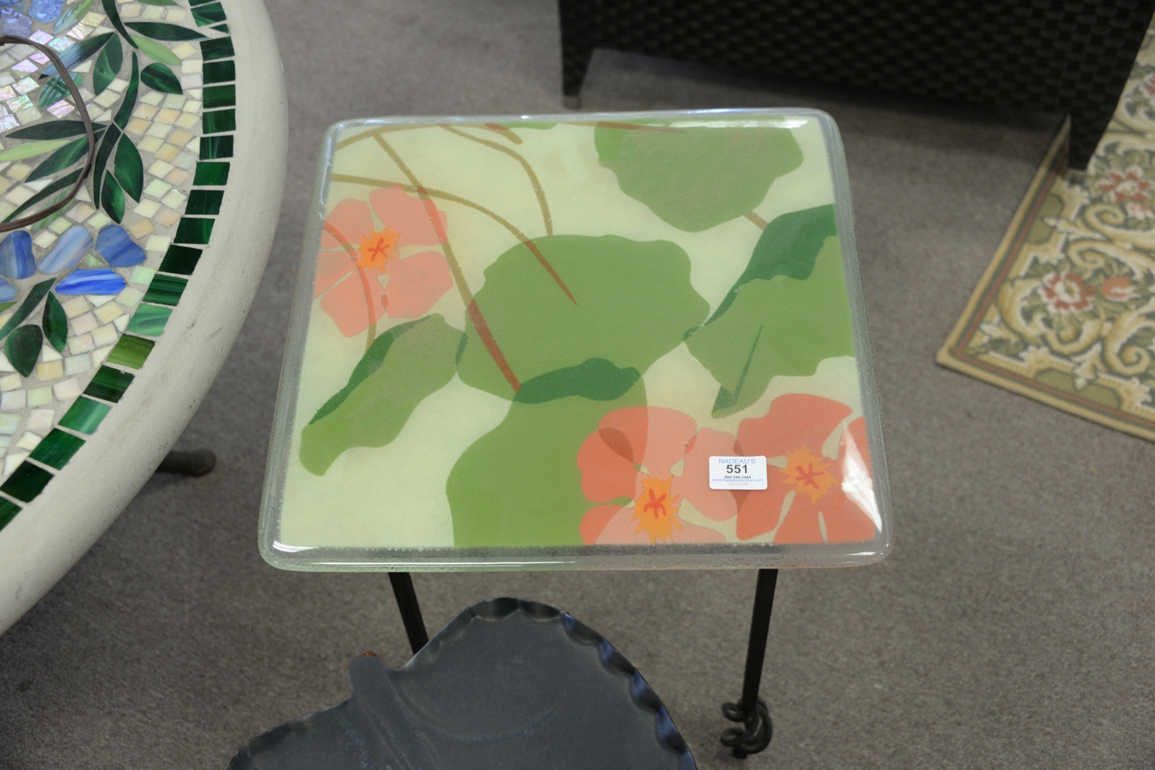 Lot 551: Six Piece Outdoor Lot to include tile top coffee table having iron base, four matching leaf form side tables, and a glass top side table, diameter 48 inches.