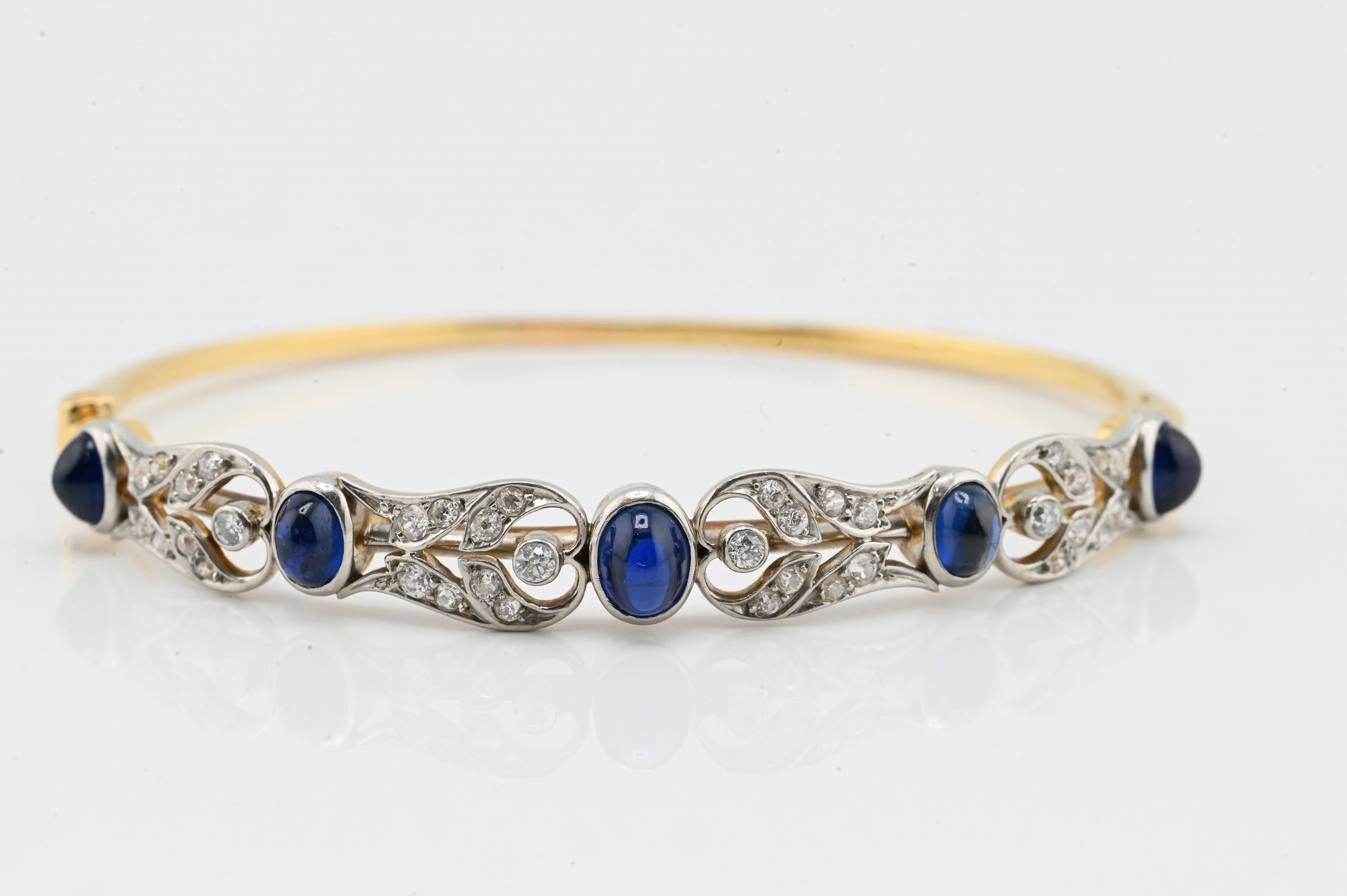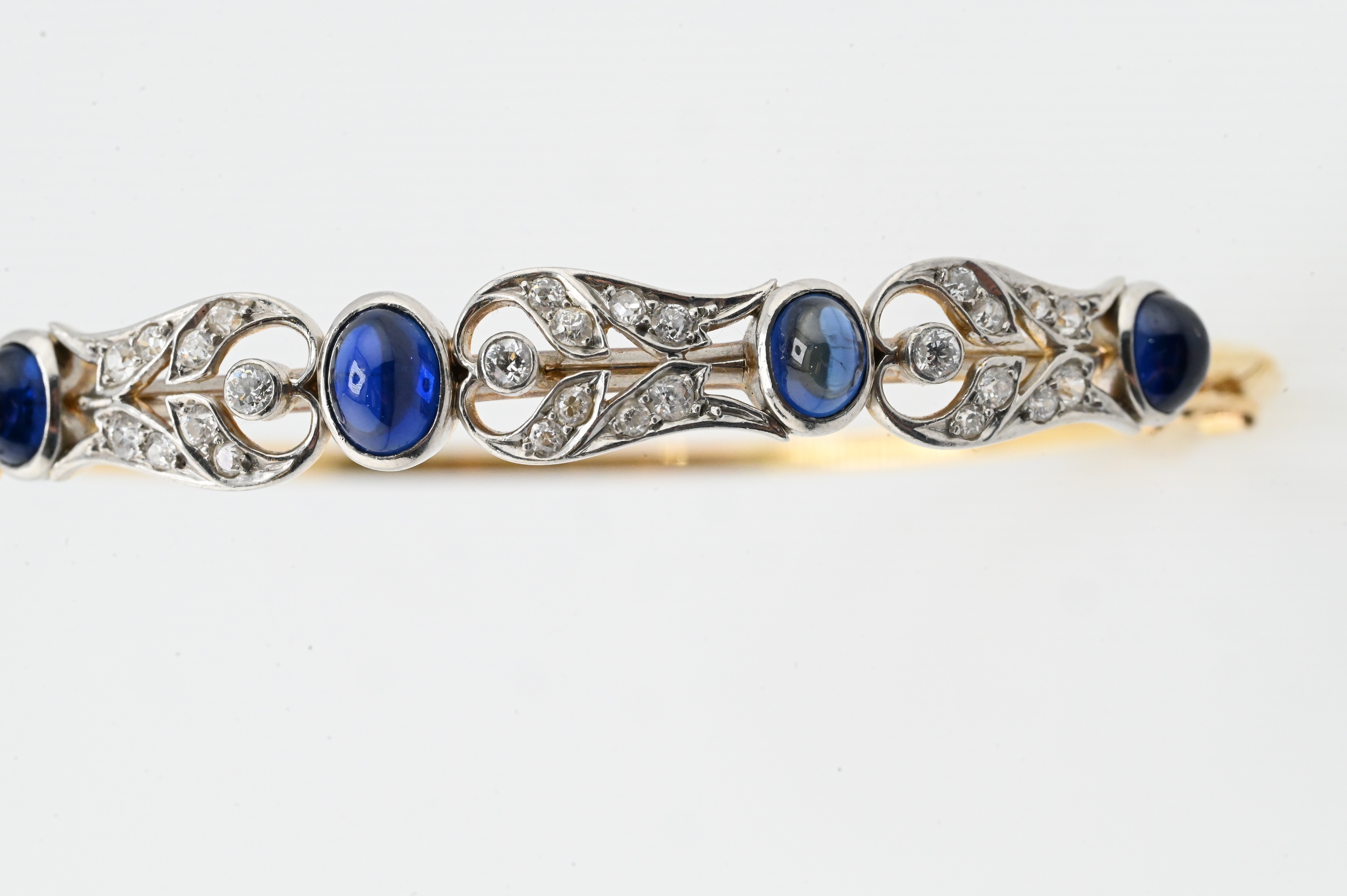 Of hinged form set with five cabochon-cut blue sapphires, the largest measuring approximately 4.8 x 6.1 mm, accented with round brilliant-cut diamonds in pierced and engraved white gold panels, mounted on yellow gold band