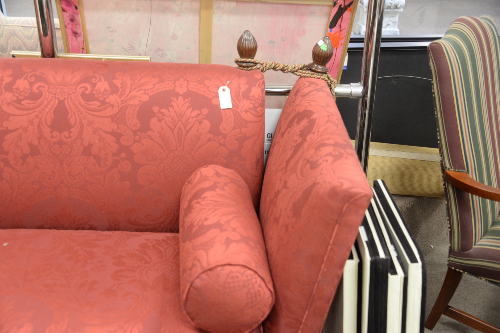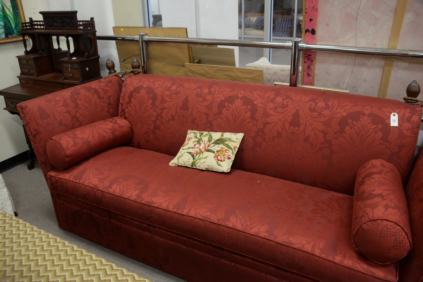 Lot 552: Edward Ferrell Sofa, having Knole drop ends in custom red upholstery, length 95 inches, depth 35 1/2 inches. Provenance: David and Cynthia Kim, 22 Stoney Wylde Lane, Greenwich, Connecticut. View home by visiting: https://www.zillow.com/homedetails/22-Stoney-Wylde-Ln-Greenwich-CT-06830/177238281_zpid/