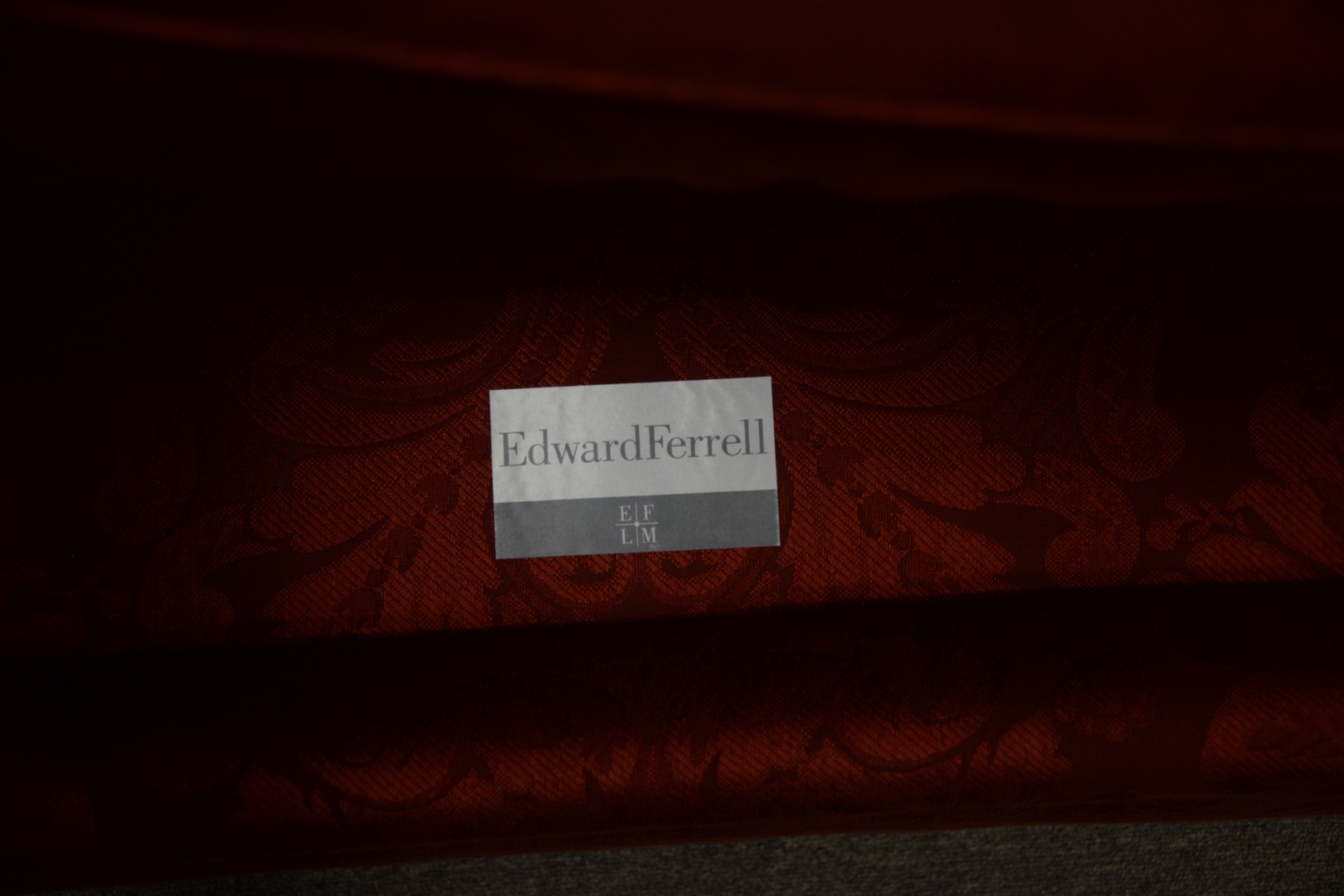 Edward Ferrell Sofa, having Knole drop ends in custom red upholstery, length 95 inches, depth 35 1/2 inches. Provenance: David and Cynthia Kim, 22 Stoney Wylde Lane, Greenwich, Connecticut. View home by visiting: https://www.zillow.com/homedetails/22-Stoney-Wylde-Ln-Greenwich-CT-06830/177238281_zpid/