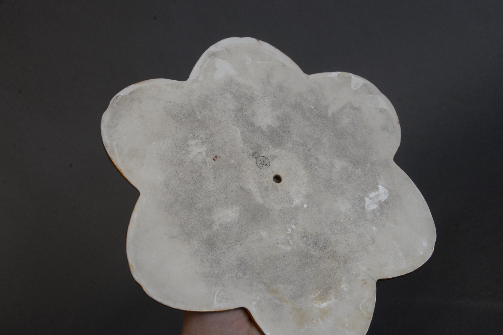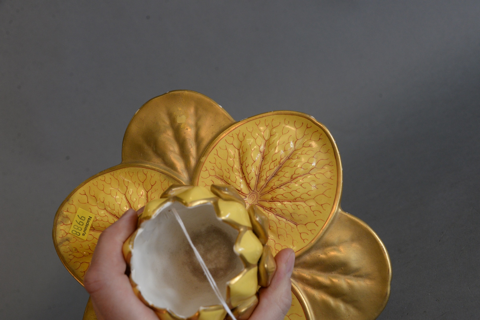 form of a blossoming flower on a lily pad, having yellow ground, with parcel gilt leaves, and red painted leaf veins, green Royal Worcester mark on bottom