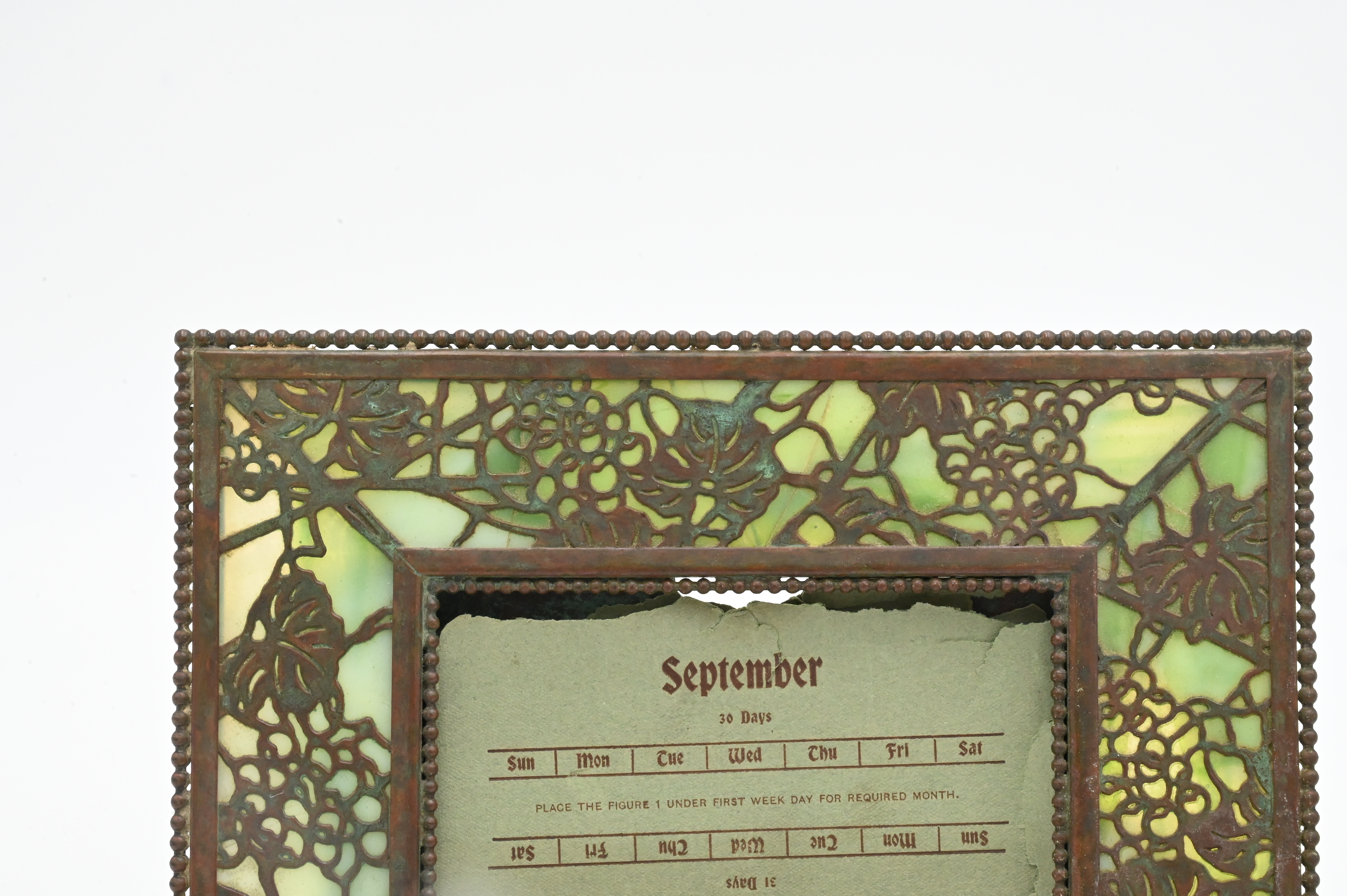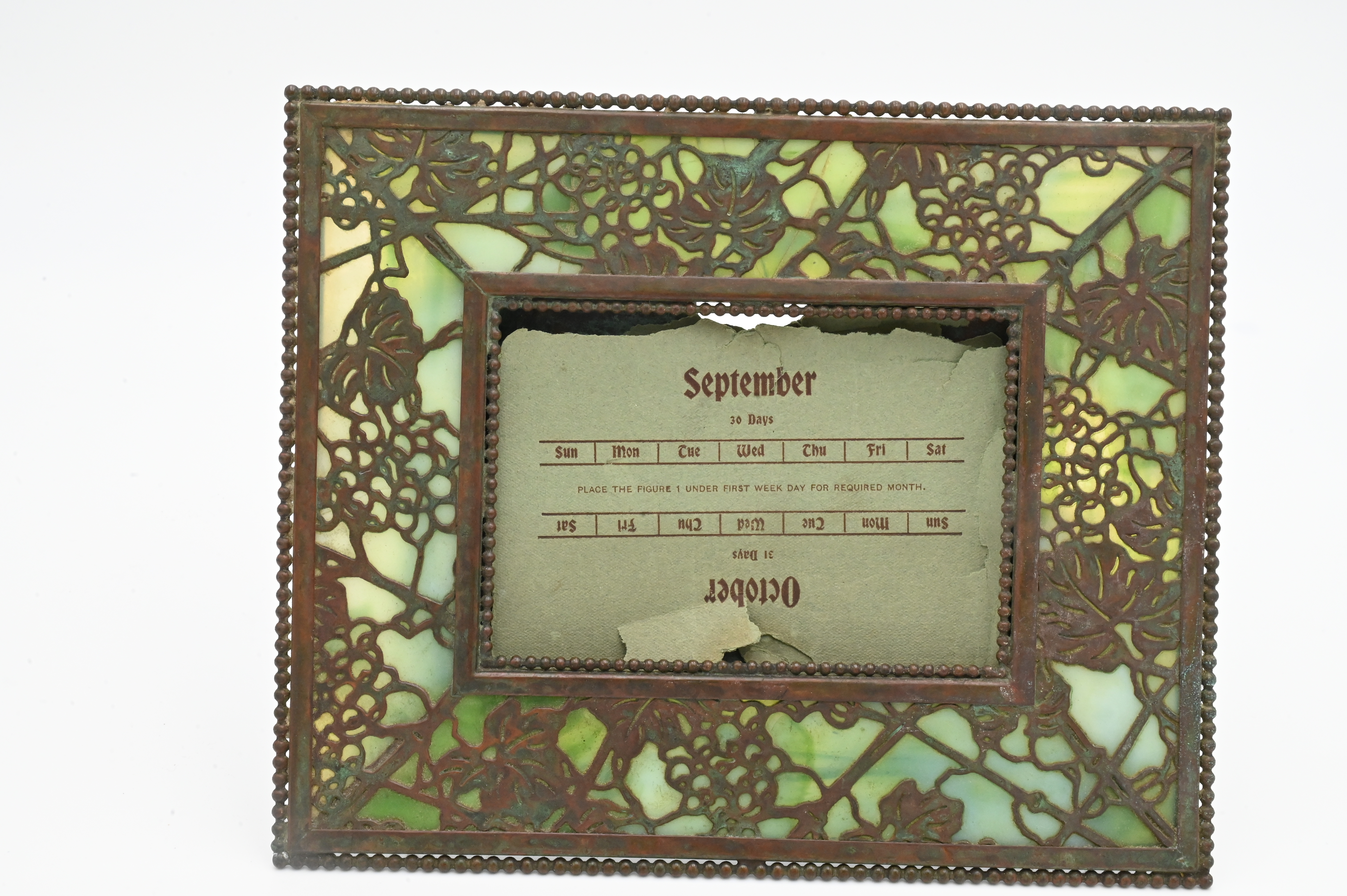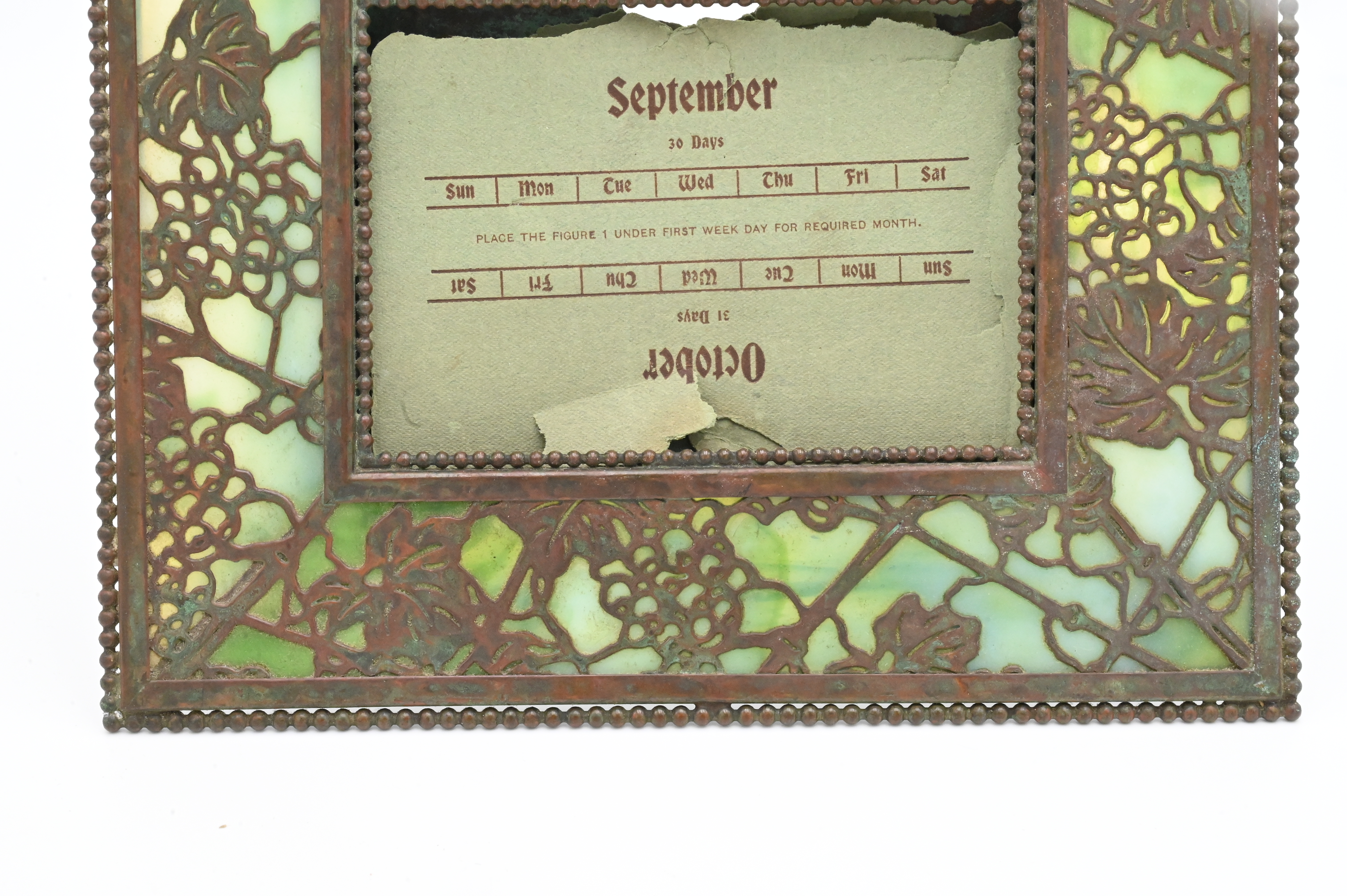Tiffany Studios “Grapevine” Calendar Picture Frame remnants of original calendar, marked Tiffany Studios, New York, two cracked slag glass panels 7 1/4″ x 8 3/4″