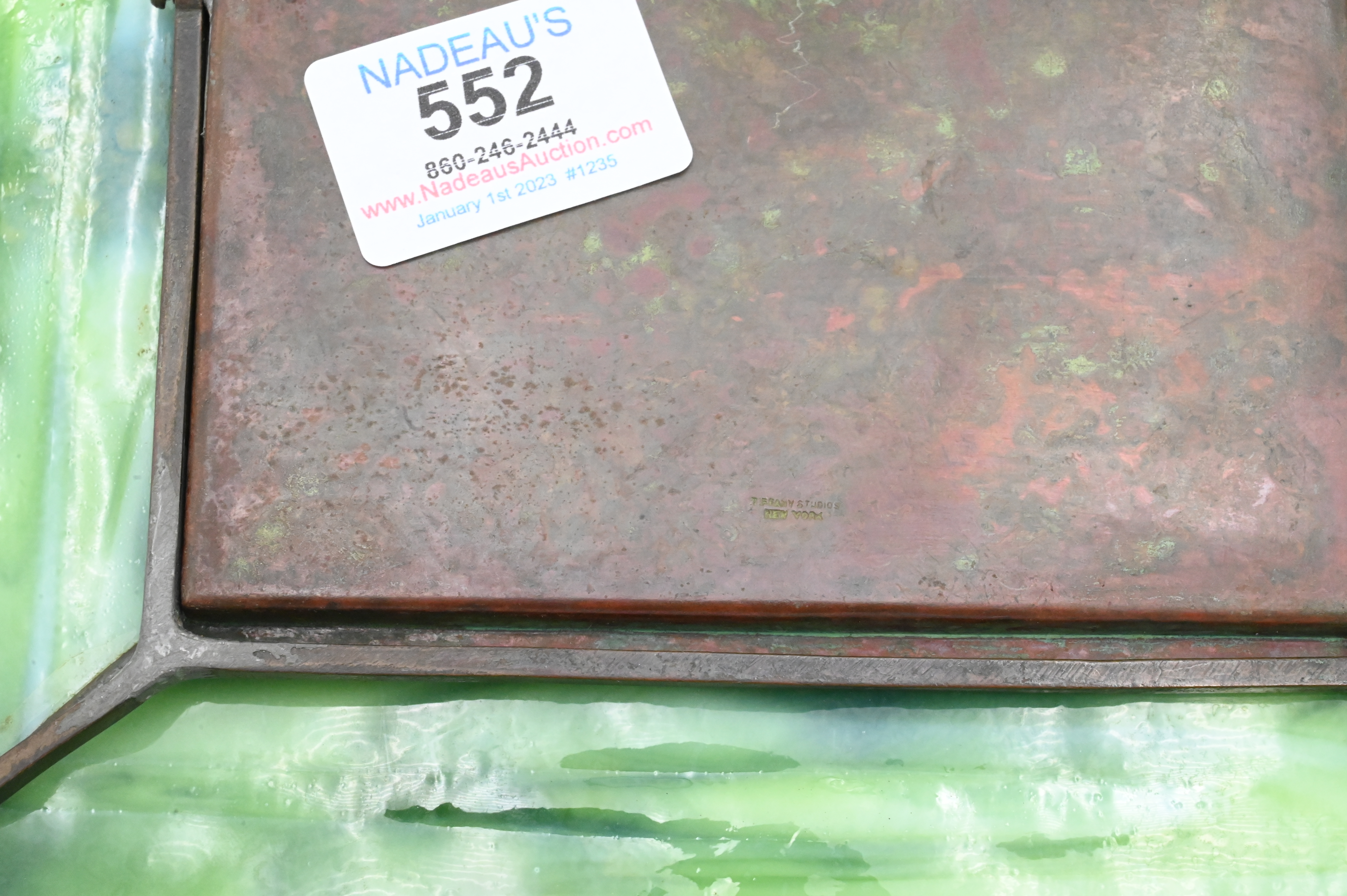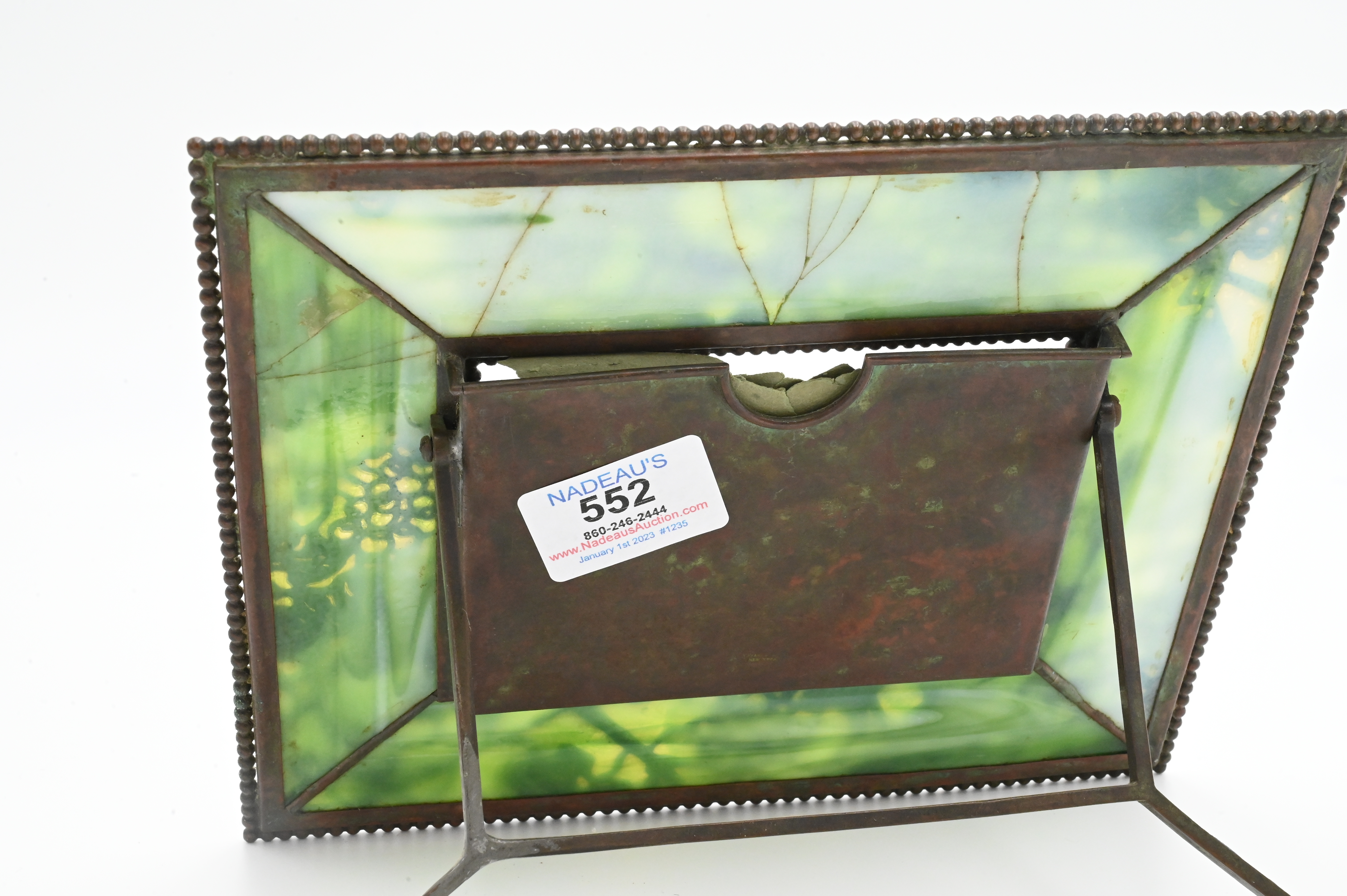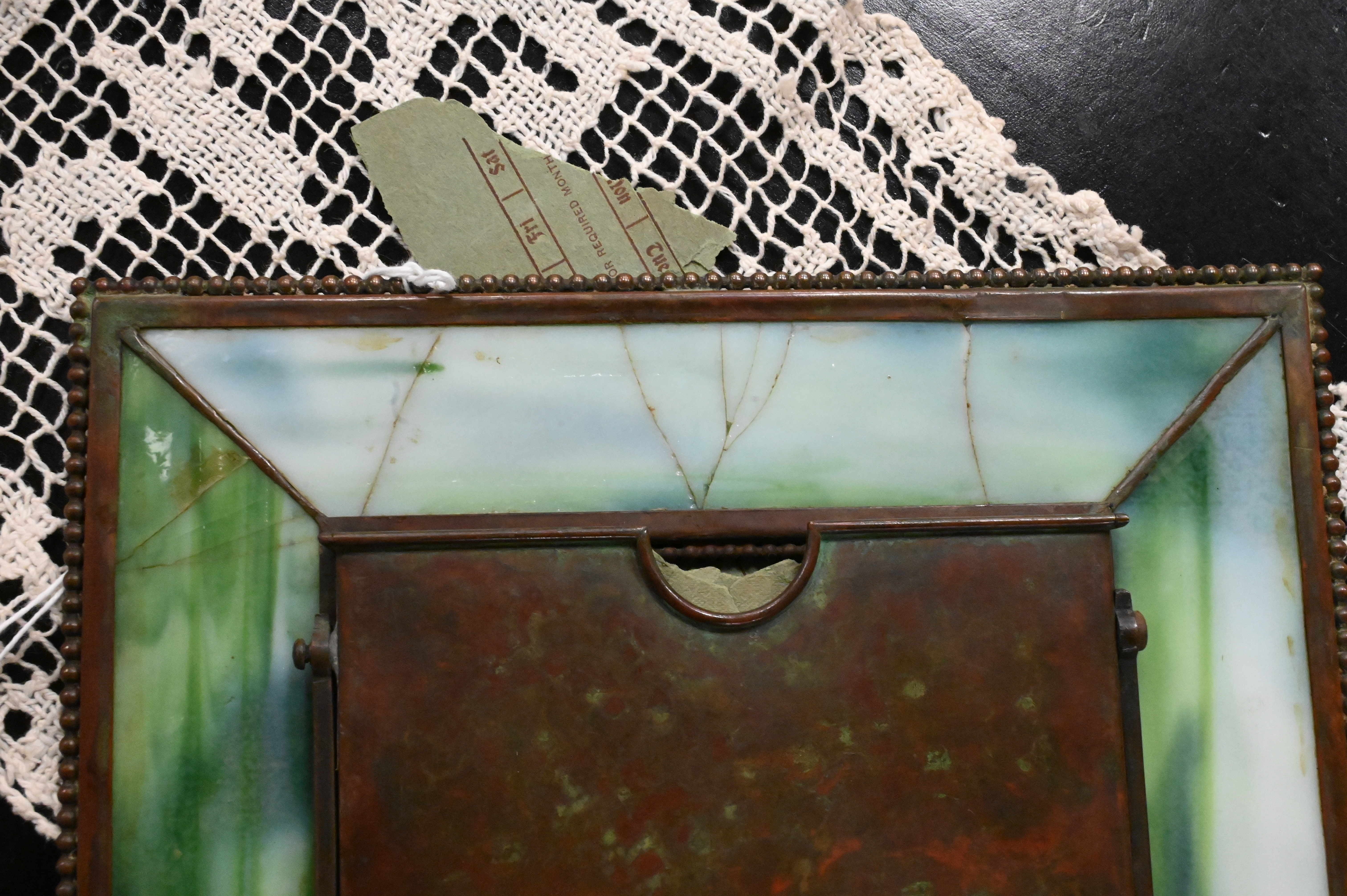 Tiffany Studios “Grapevine” Calendar Picture Frame remnants of original calendar, marked Tiffany Studios, New York, two cracked slag glass panels 7 1/4″ x 8 3/4″