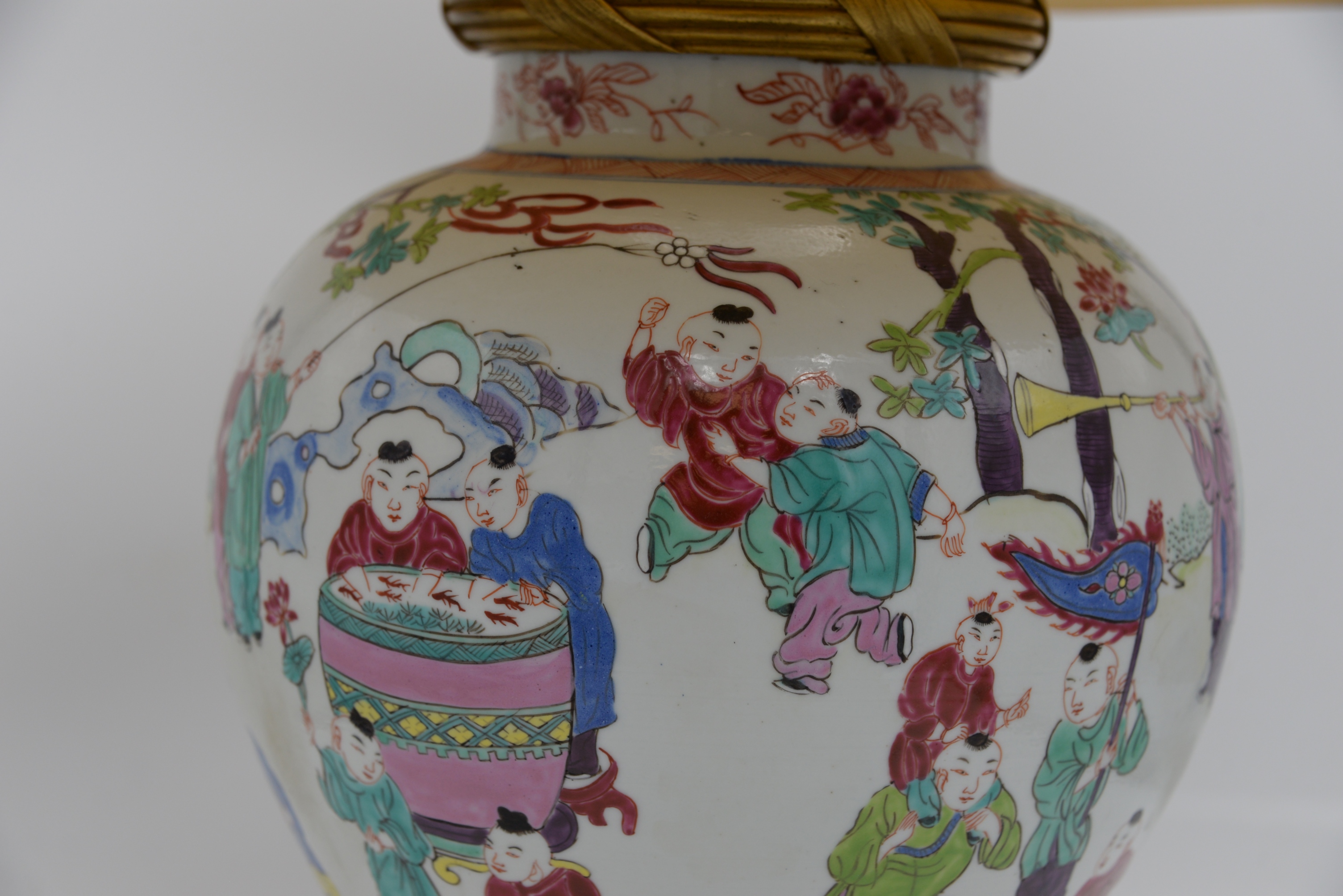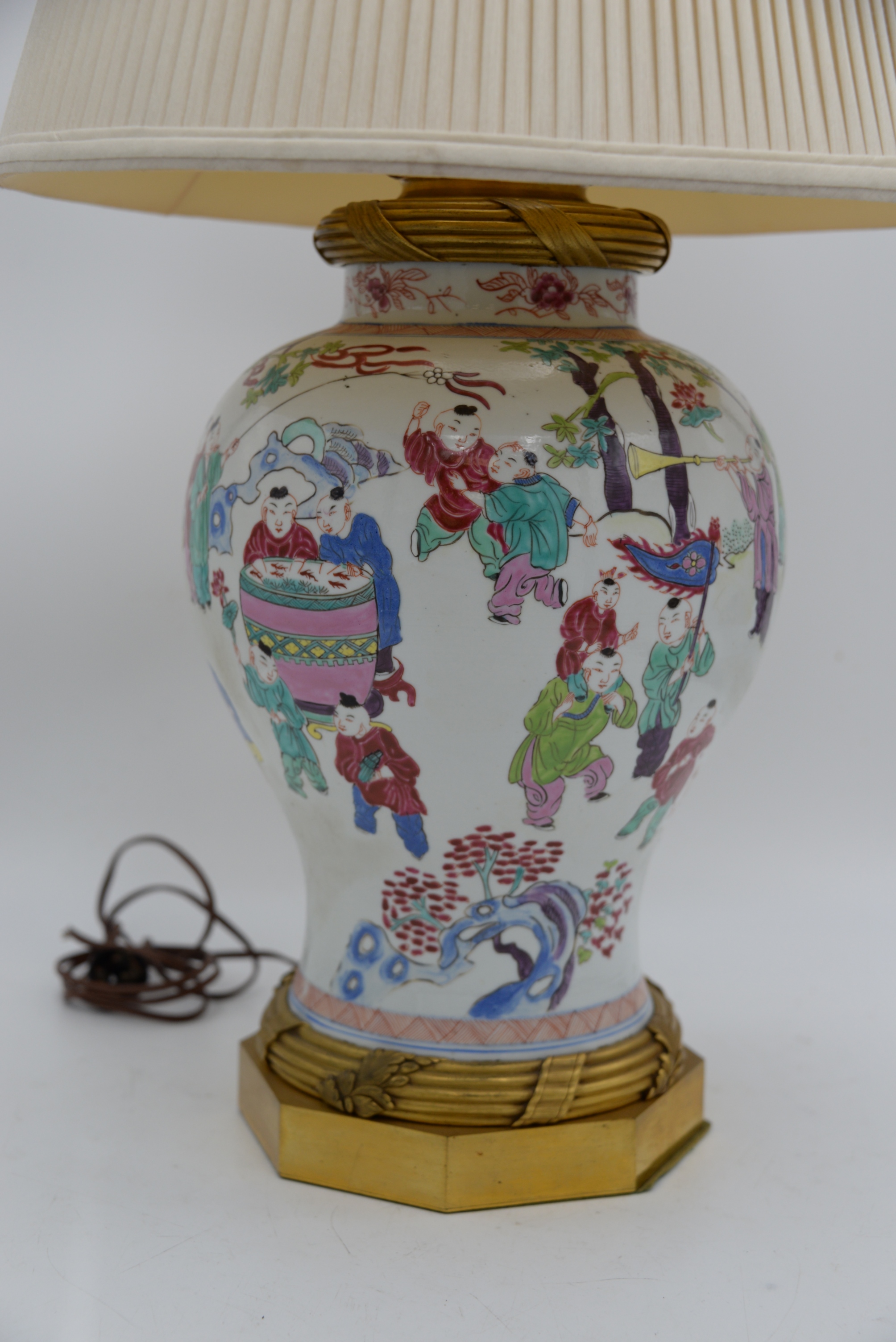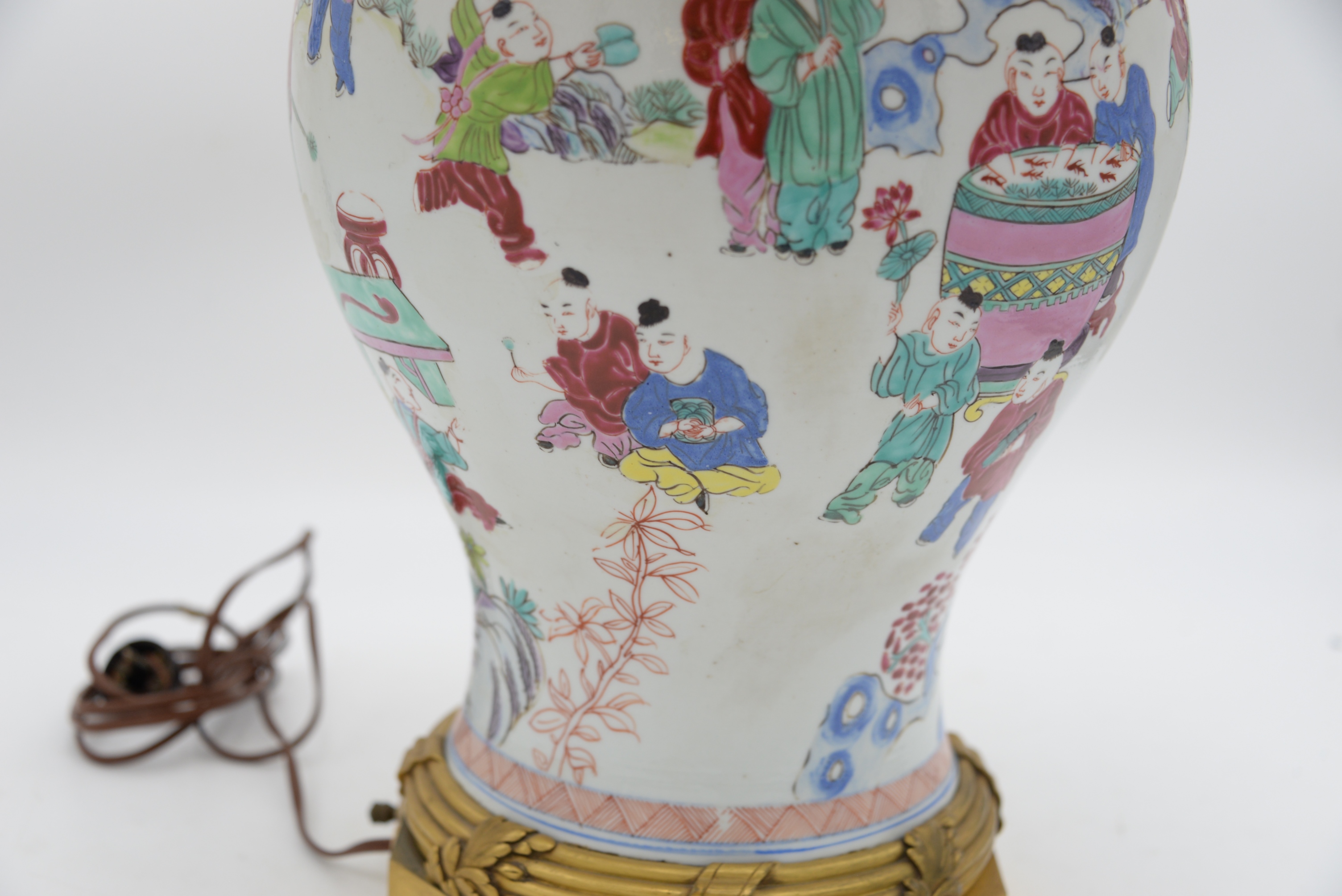 Chinese Famille Rose Jar, 19th century, baluster-shaped body decorated with boys, possibly including HeHe Erxian twins, playing drums, horns and other musical instruments, mounted as a lamp with ormolu top and base, height 14 inches, total height 31 inches.