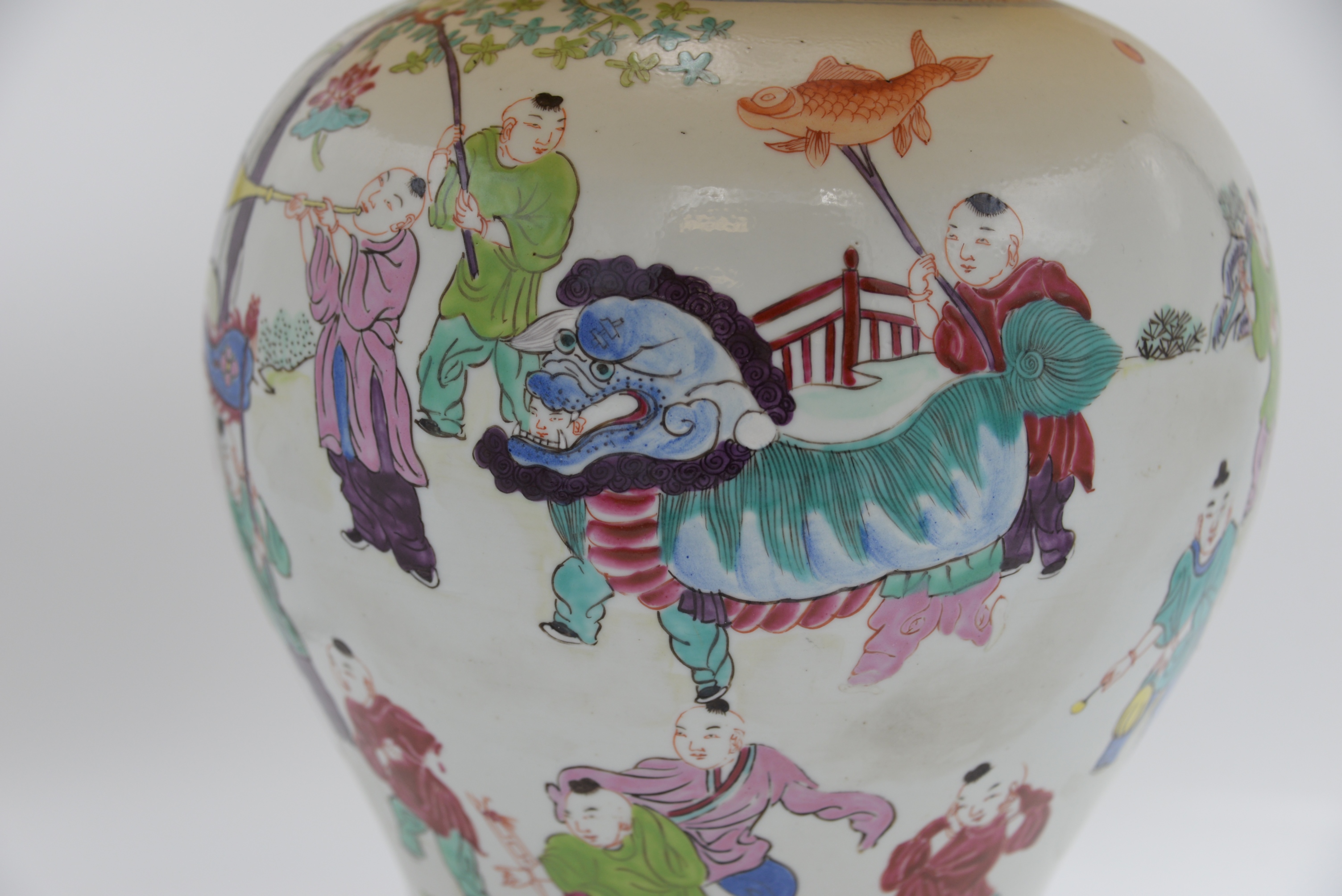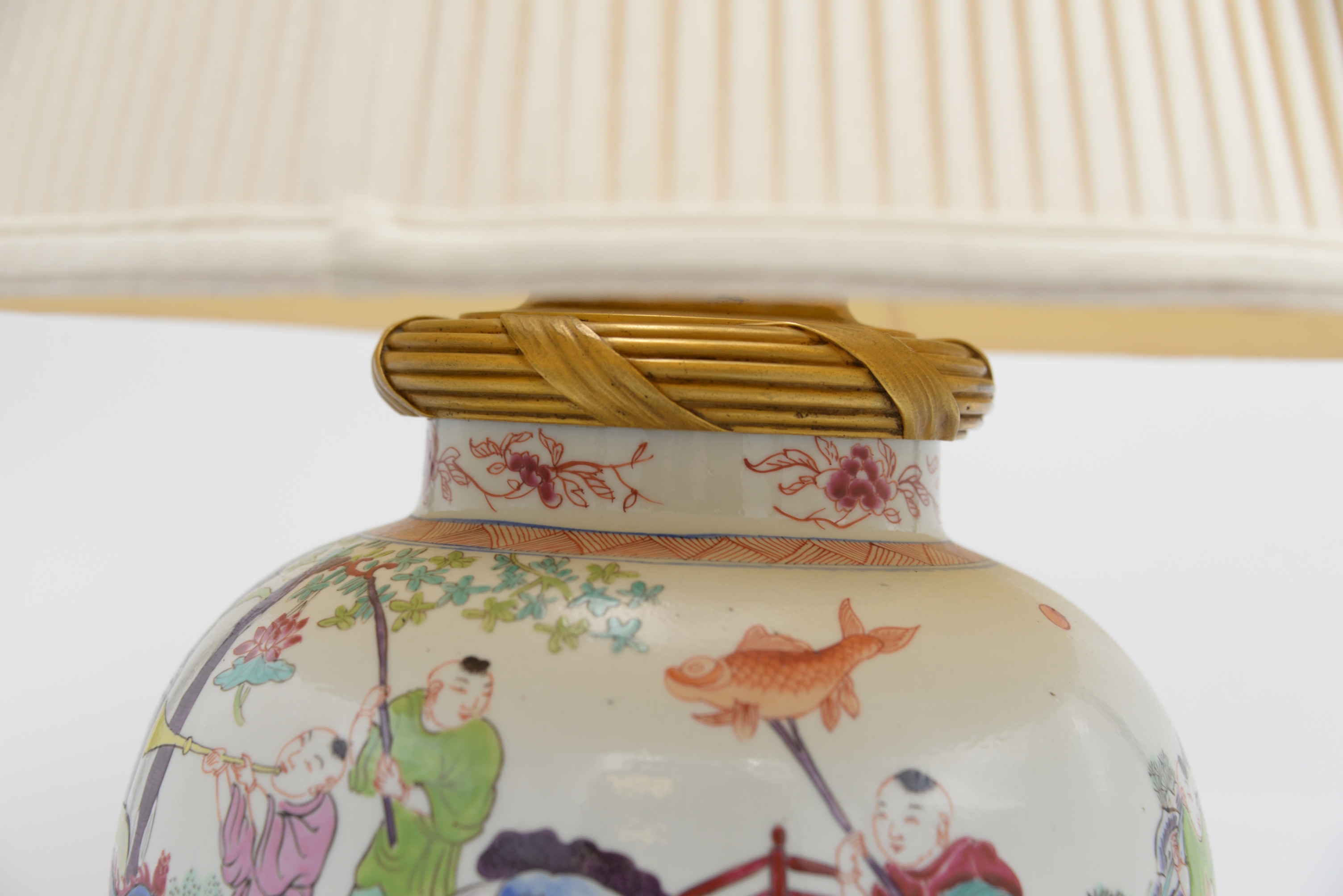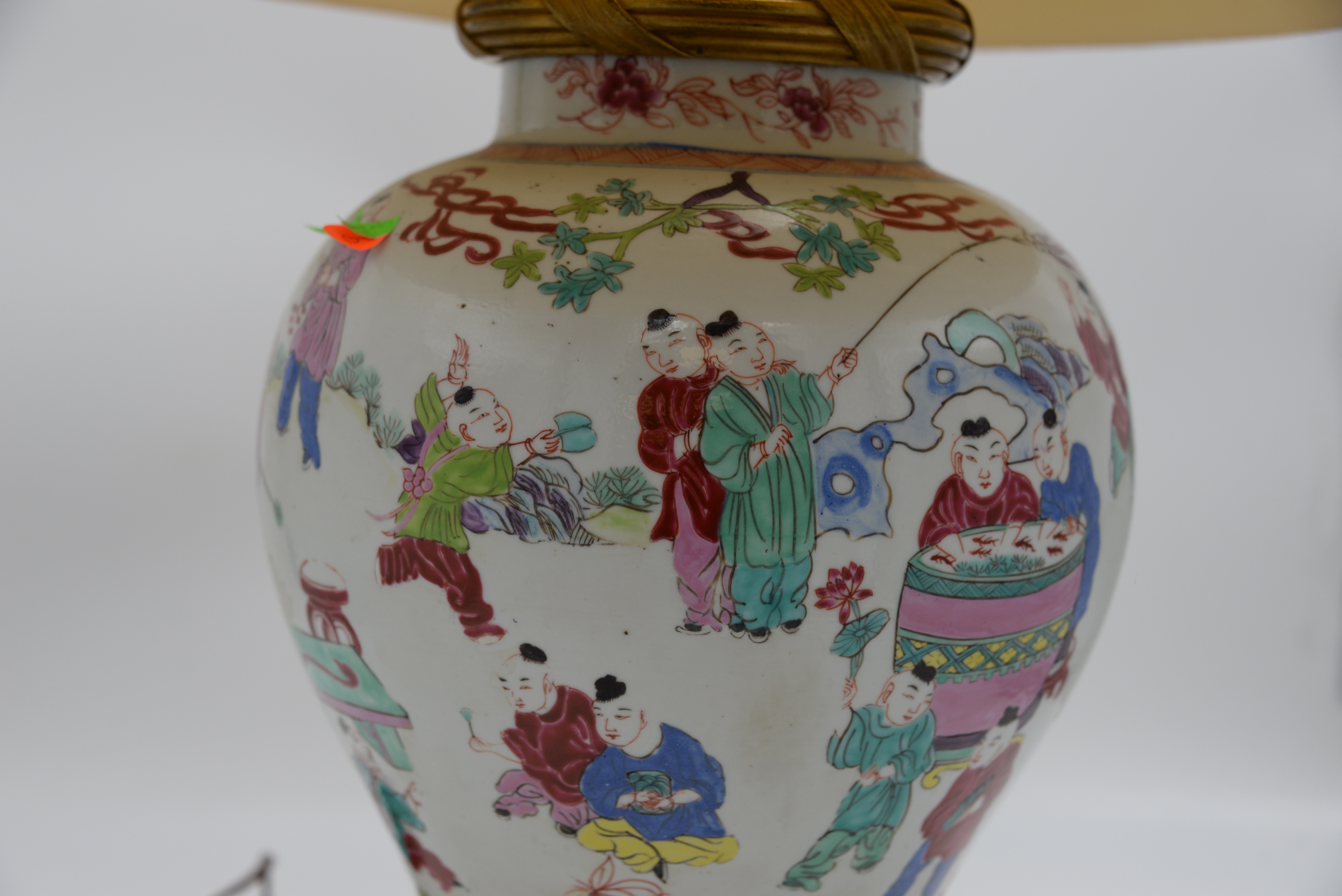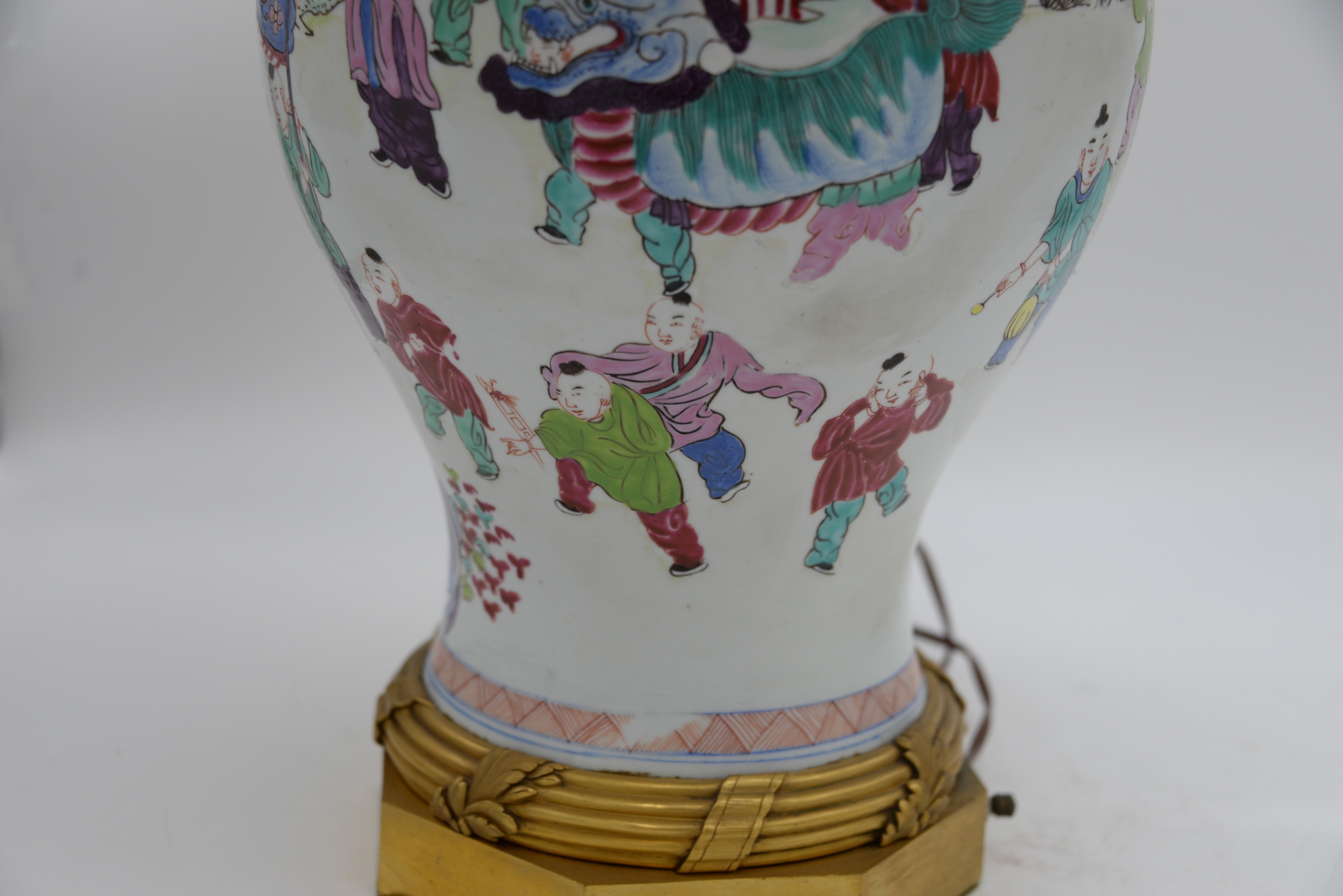 Chinese Famille Rose Jar, 19th century, baluster-shaped body decorated with boys, possibly including HeHe Erxian twins, playing drums, horns and other musical instruments, mounted as a lamp with ormolu top and base, height 14 inches, total height 31 inches.