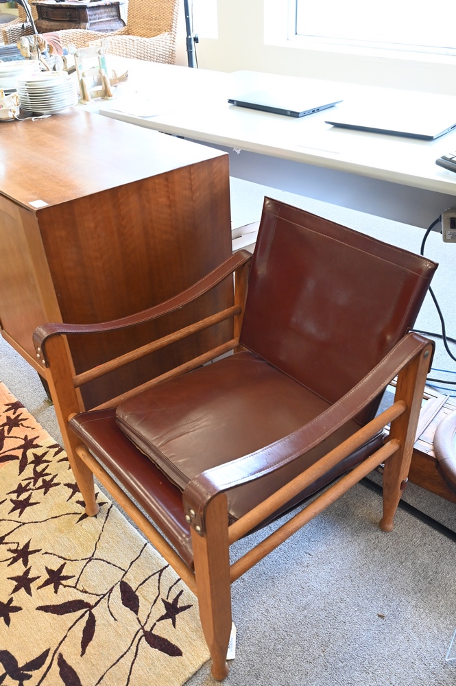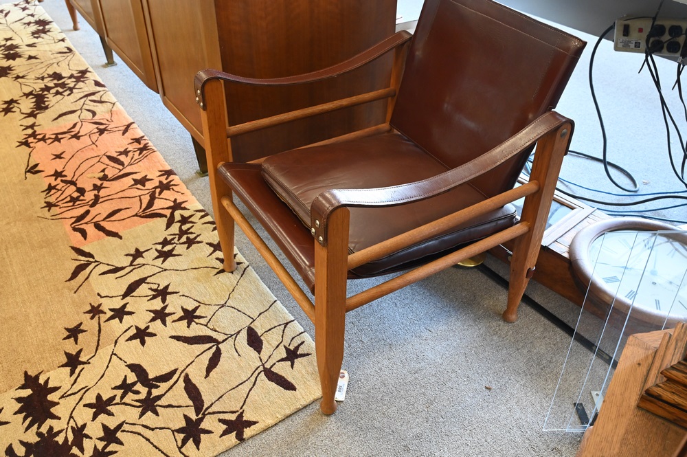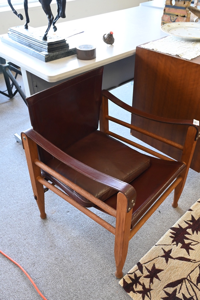 Lot 553: Pair of Safari Chairs in the Style of Kaare Klint, having leather seats and backs and leather strap arms, seat height, 14.5 inches, height to top of back 27.5 inches.