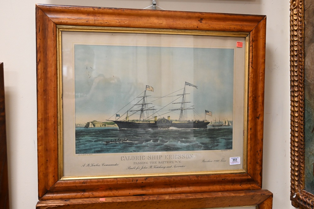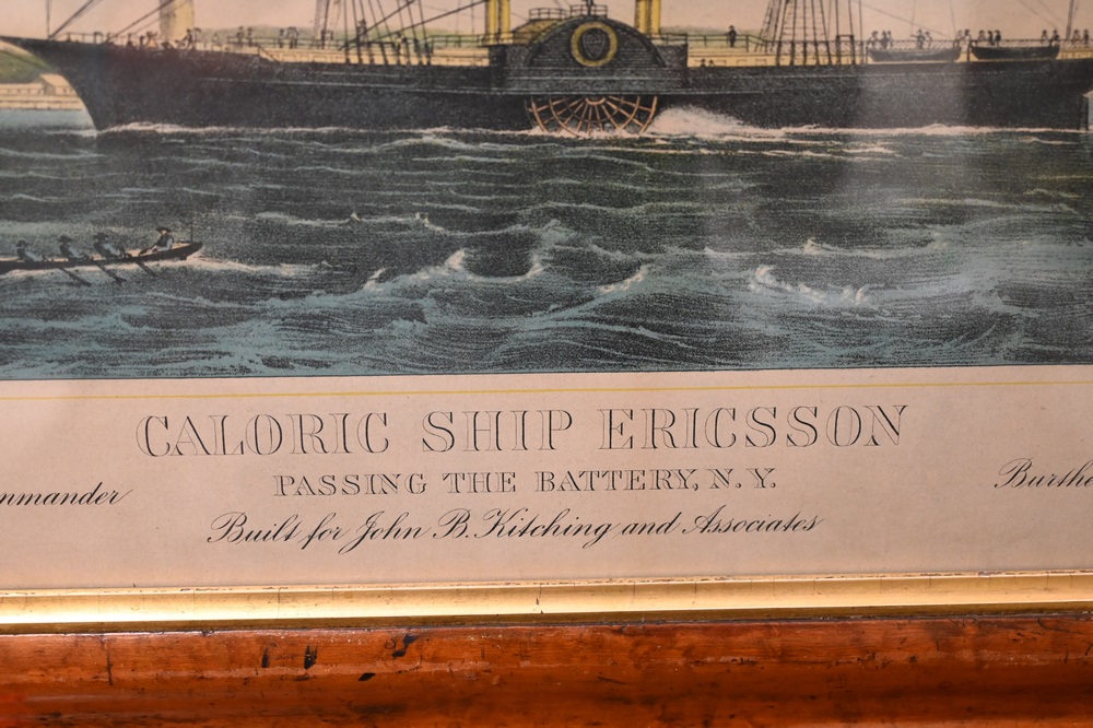 Lot 553: Sarony and Major, “Caloric Ship Ericsson”, American naval ship “Pass the Battery, N.Y.”, sight size 17 1/2 x 23 inches.