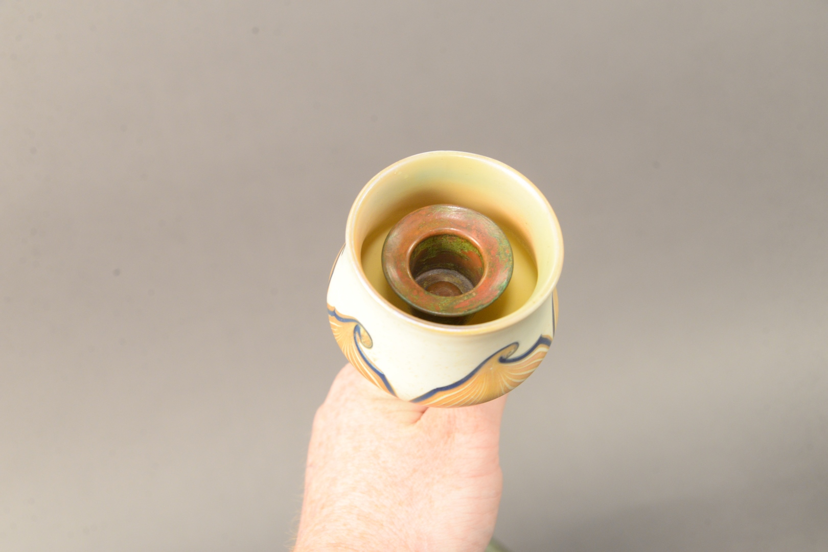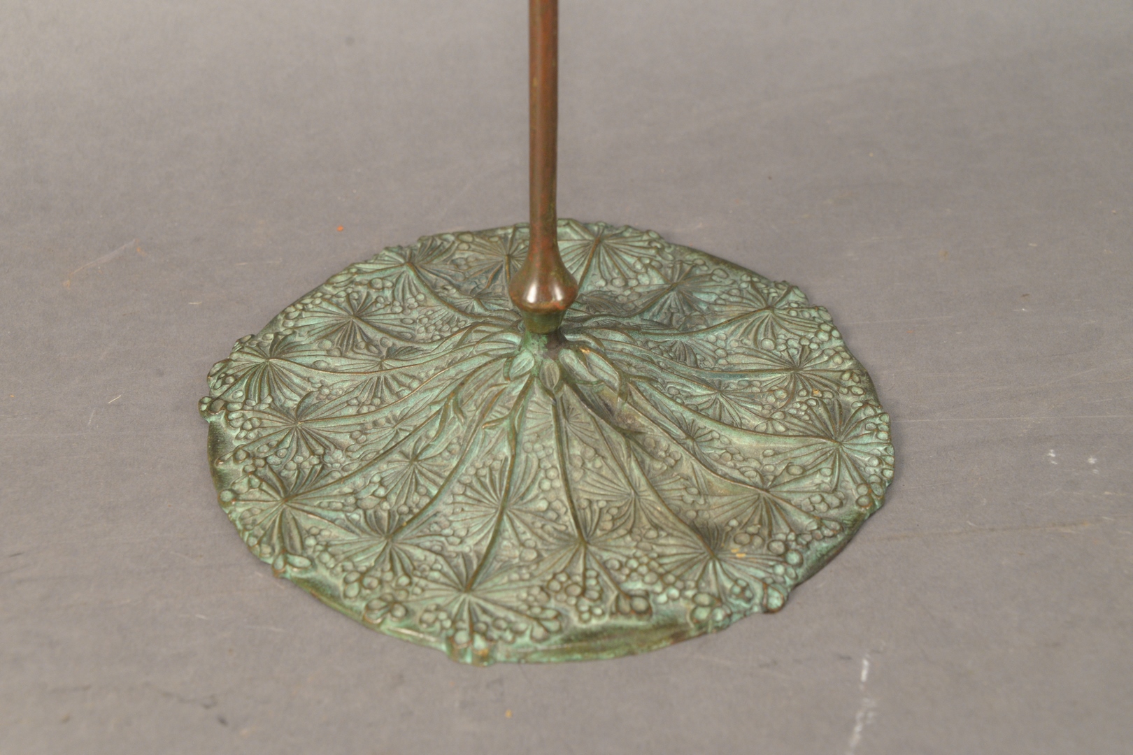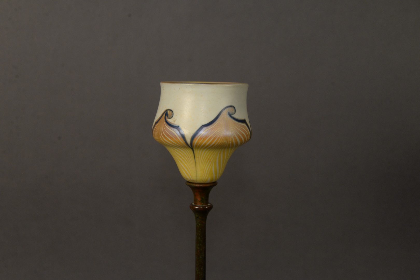Lot 553: Tiffany Studios Candlestick having large bronze base with pull feather art glass shade, marked to the underside ‘291 Tiffany Studios…