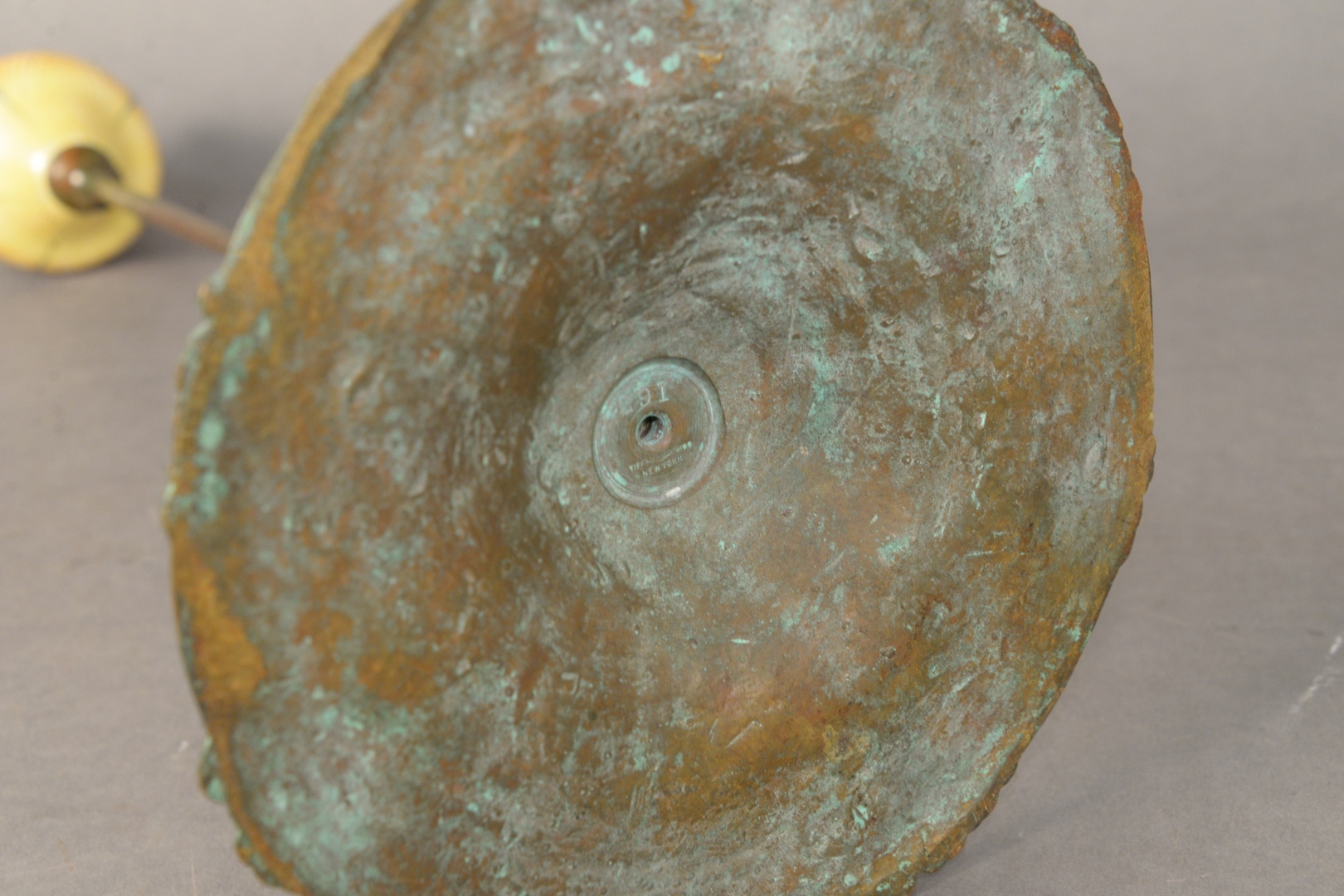 Tiffany Studios Candlestick having large bronze base with pull feather art glass shade, marked to the underside ‘291 Tiffany Studios, New York’ height 19 inches, base diameter 8 1/2 inches.