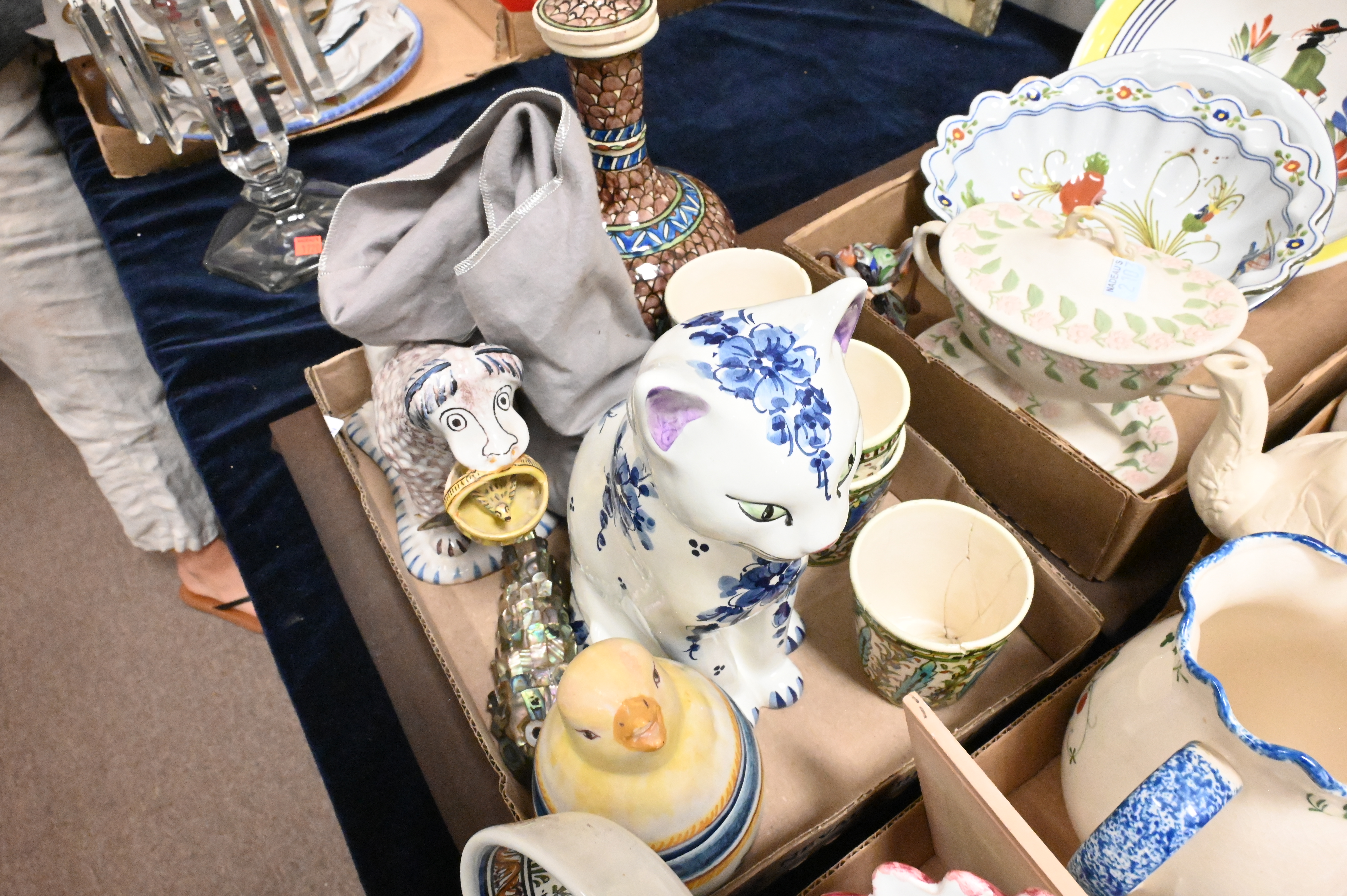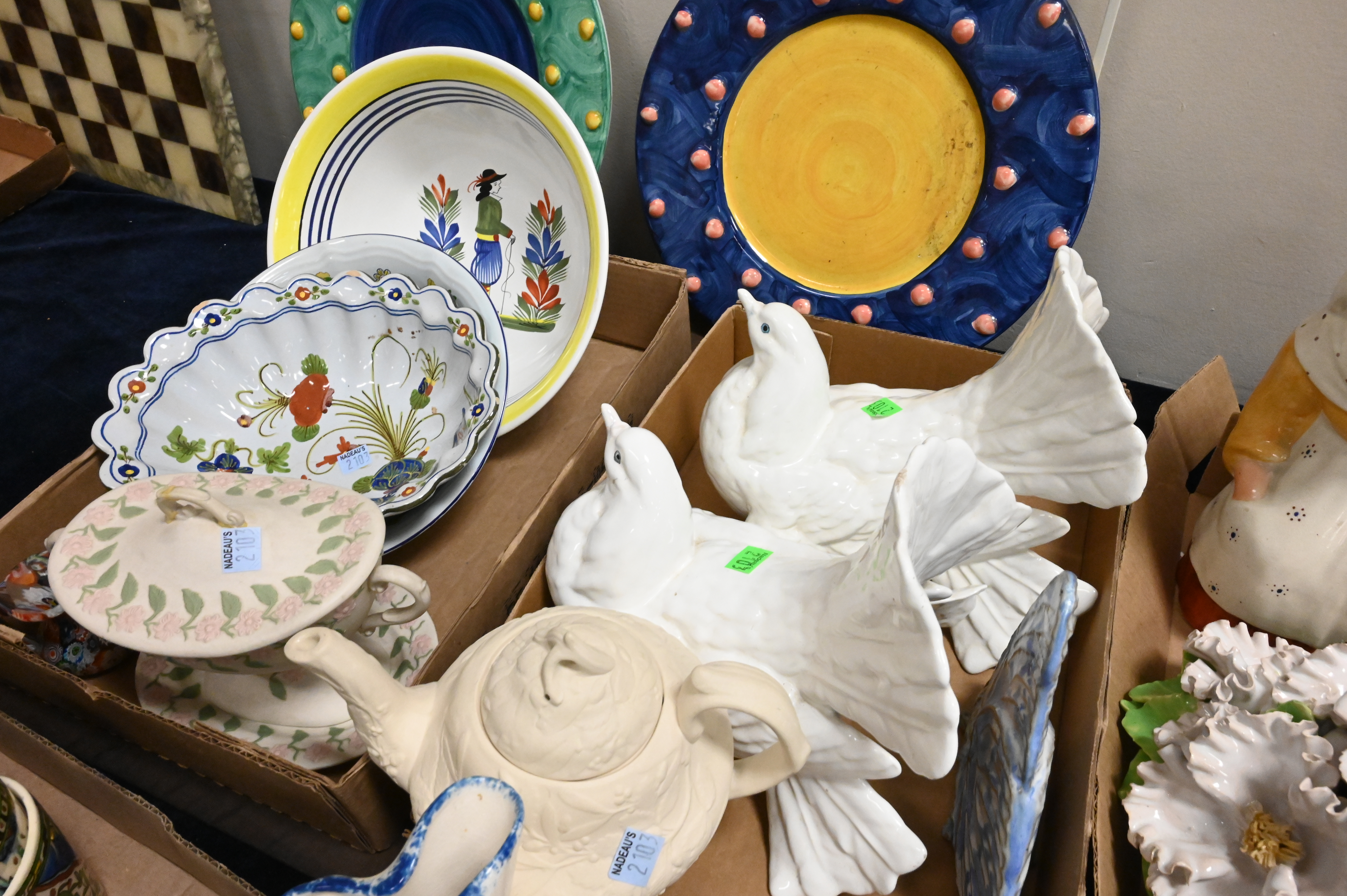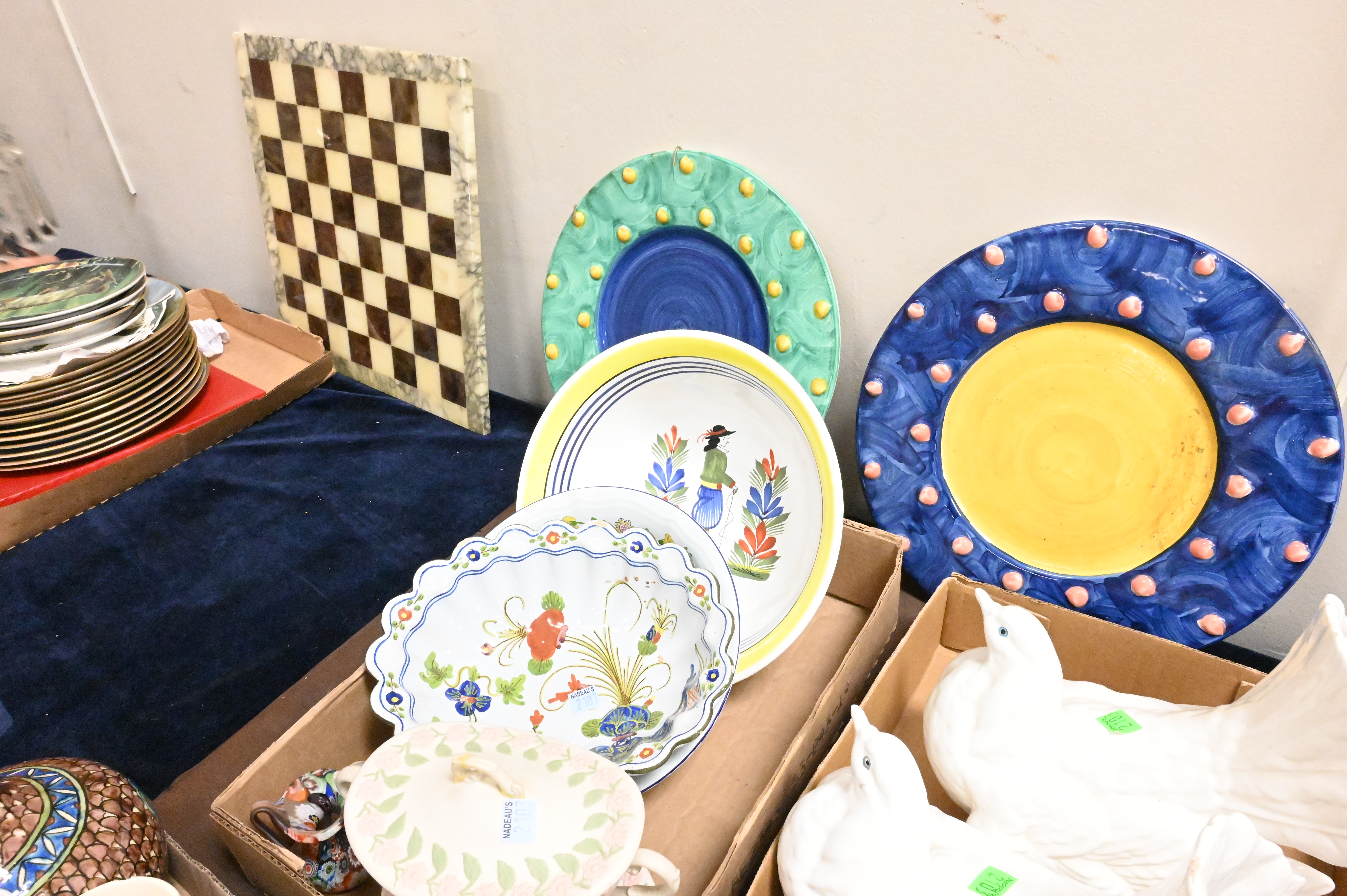 Assorted Group of Plates and Lamps, to include six French oyster plate, five of which are Limoges, four Ed Totten fish plates, twelve Gorham historical society dinner plates, one Richard Bishop Mallard dinner plate, a large ceramic pot, along with two hurricane lamps height of 18 inches, largest diameter 12 inches.