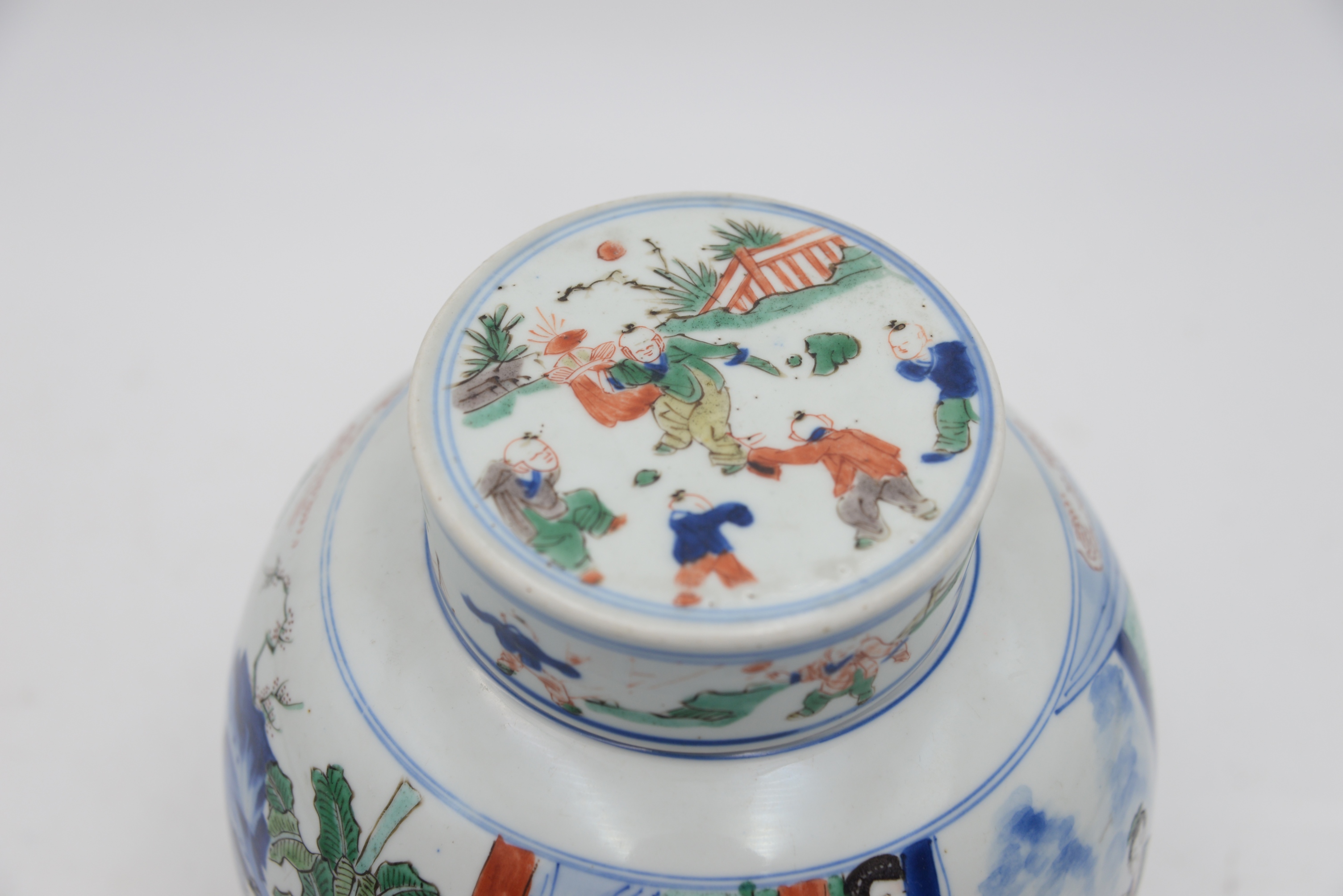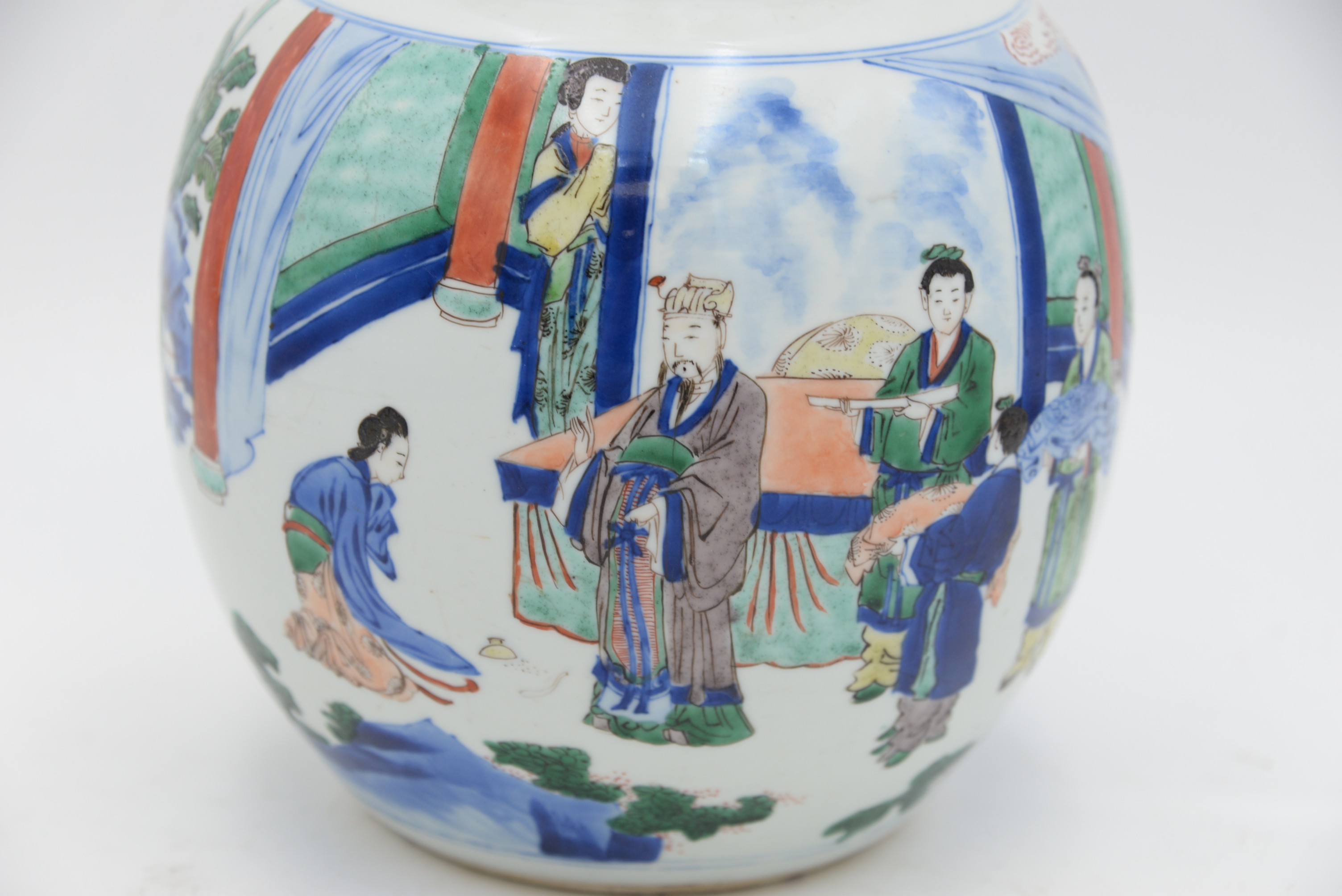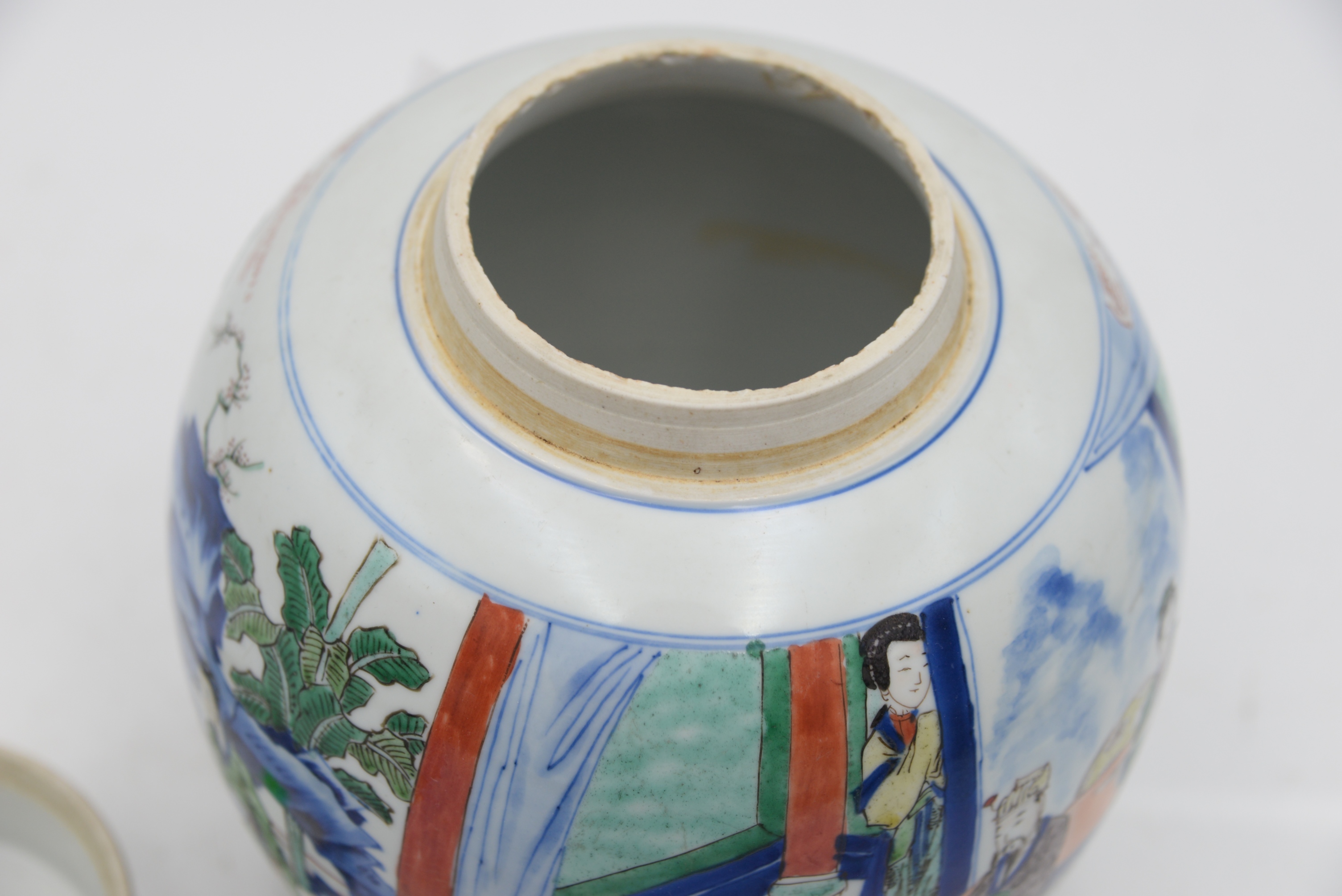 Chinese Porcelain Ginger Jar, having painted courtyard scene with figures, height 9 1/2 inches. Provenance Parke Bernet Galleries, Sept. 1970 sale, item # 147, Julius H Jacobson II a Fifth Avenue Estate.