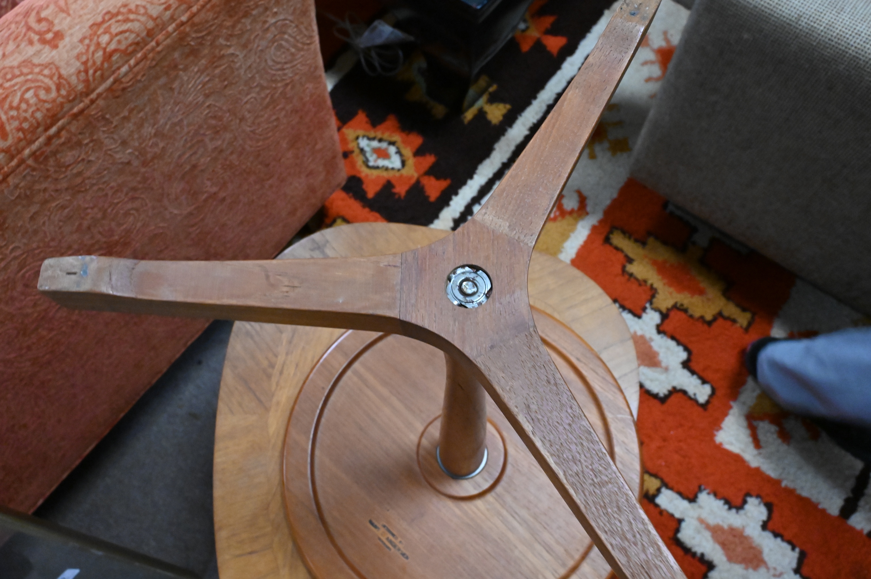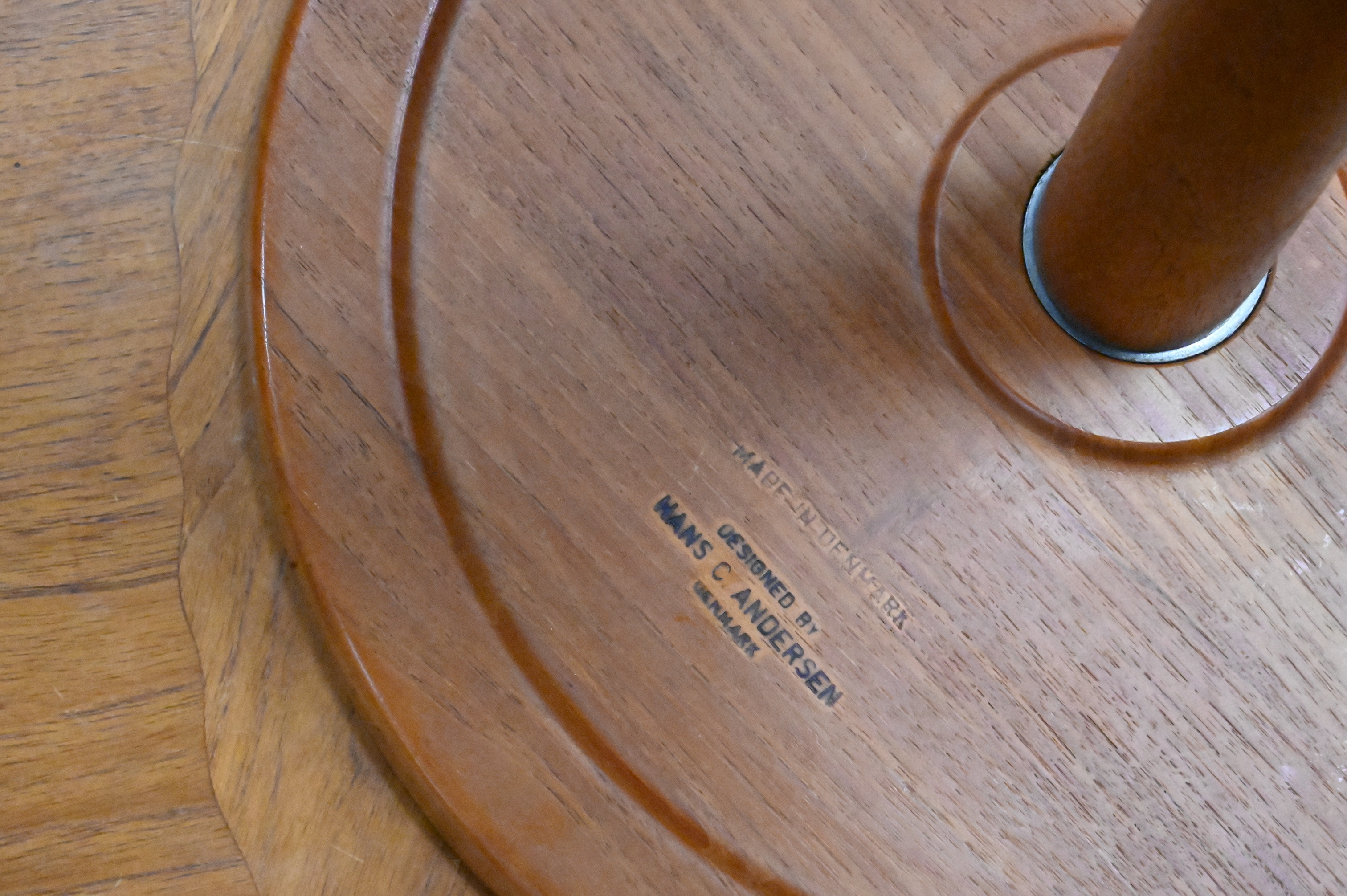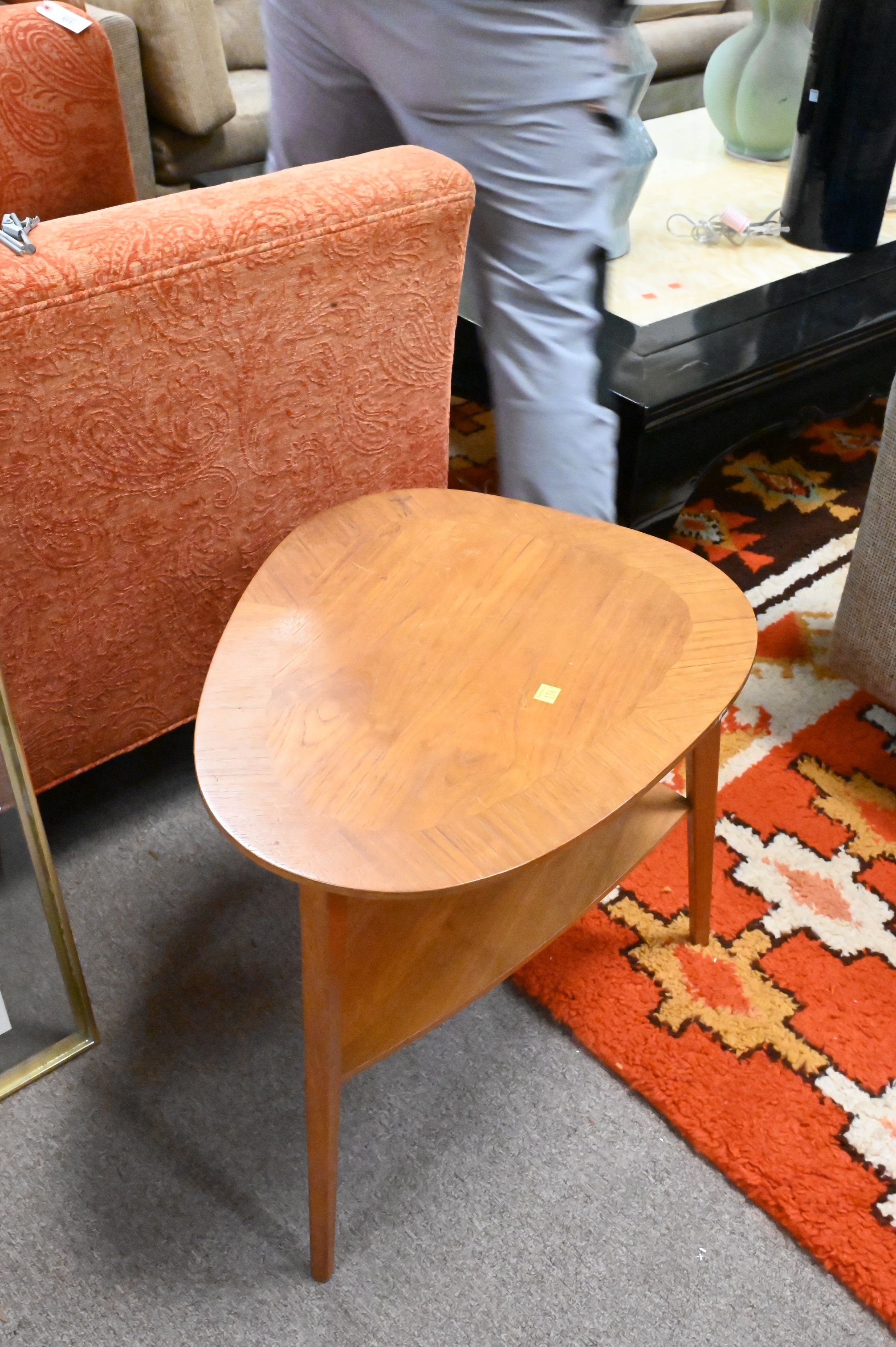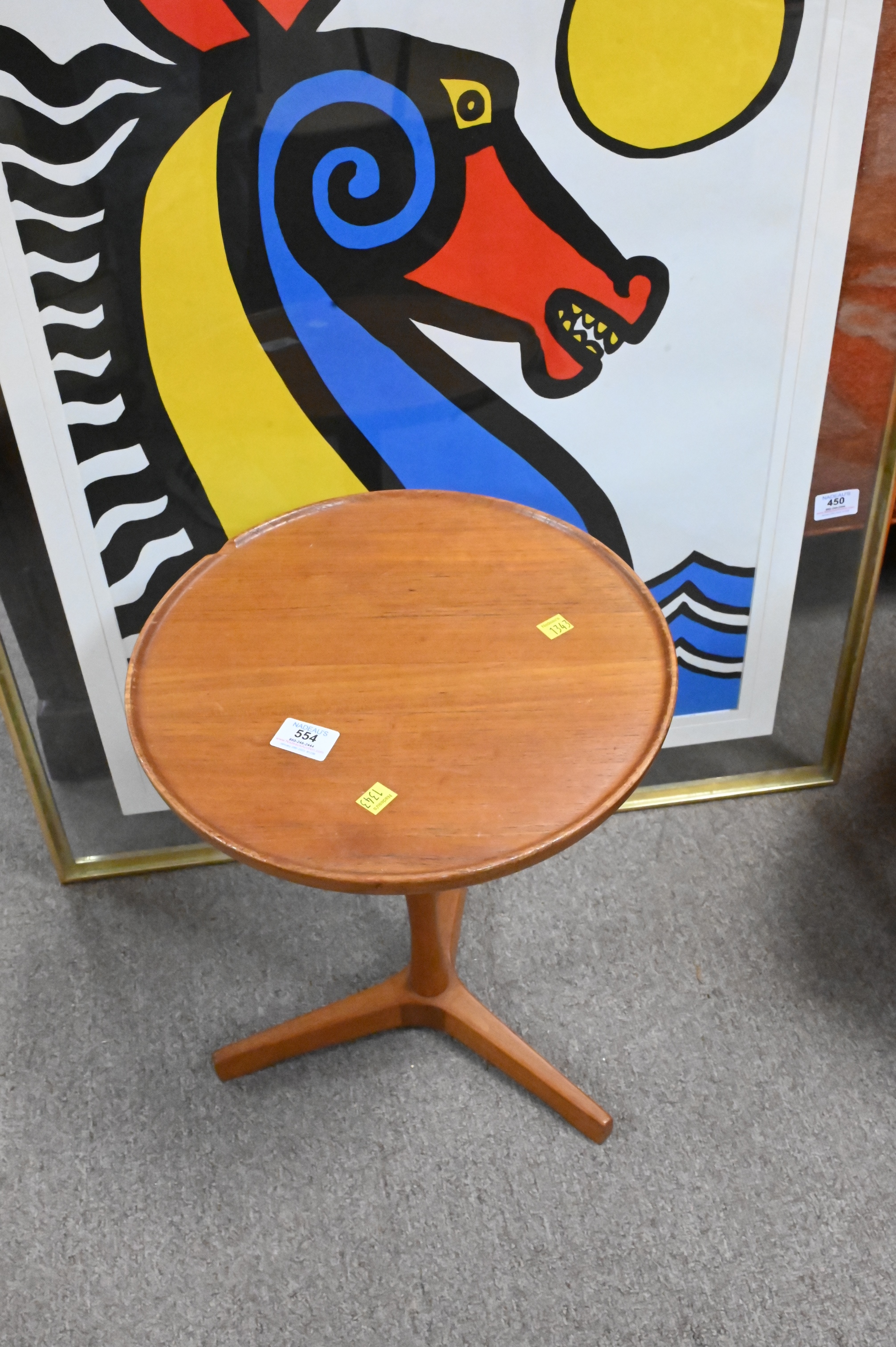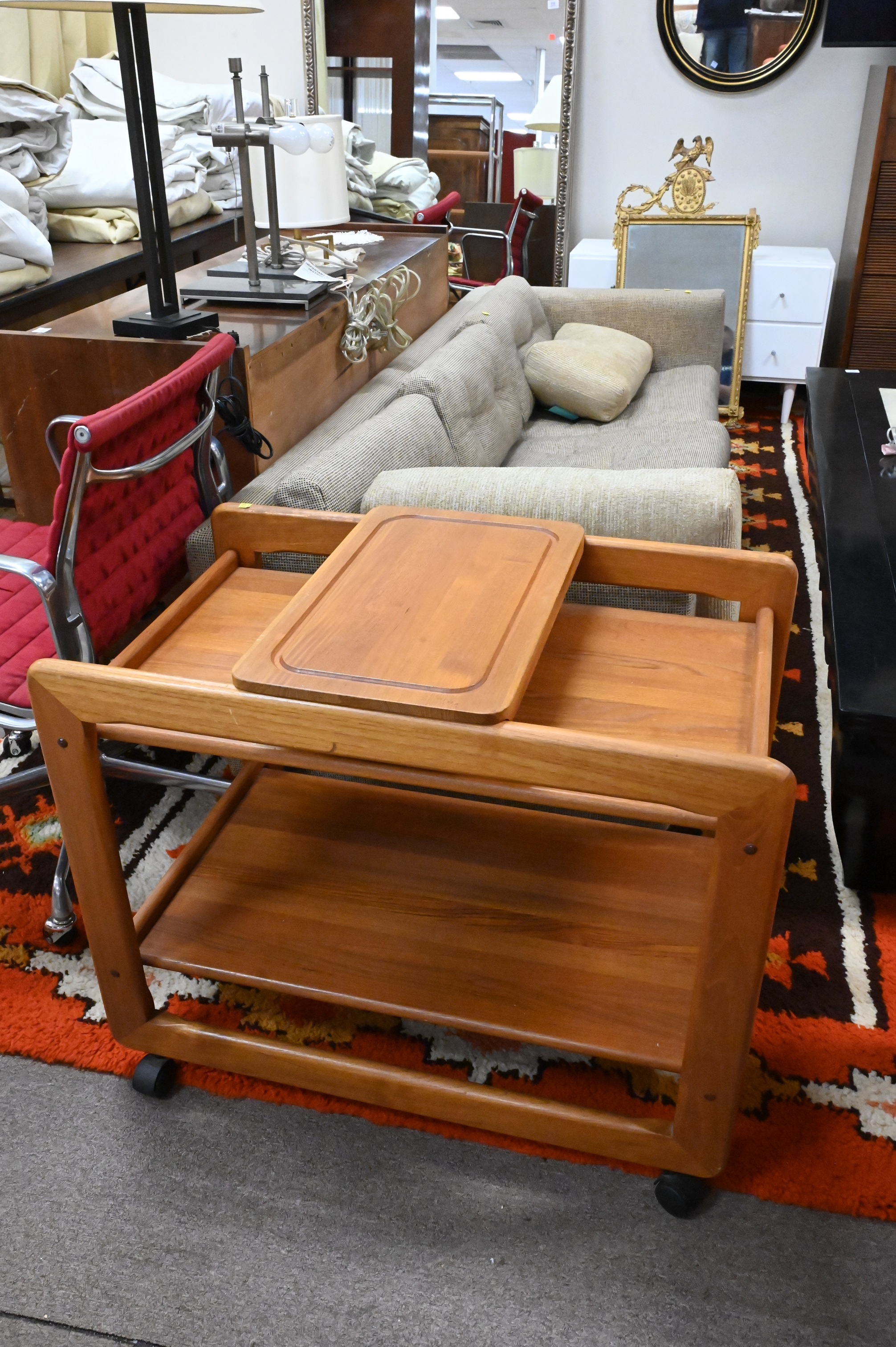 Four Piece Danish Mid Century Modern Lot, to include Karm Stole Danish cart, Hans C. Anderson side table, height 17 1/2 inches, diameter 14 1/2 inches, a Pedersen & Hansen oval mirror, along with a teak guitar pick table.